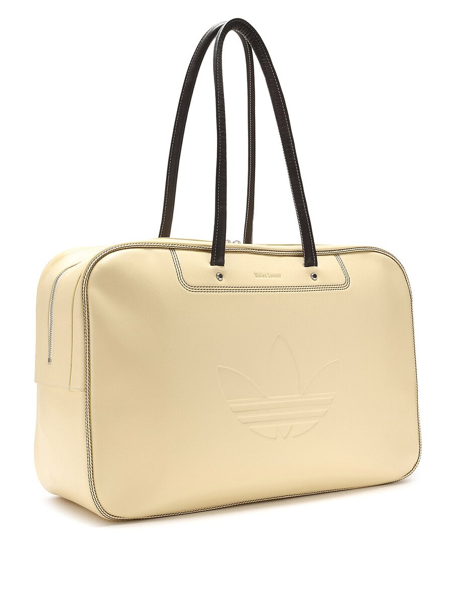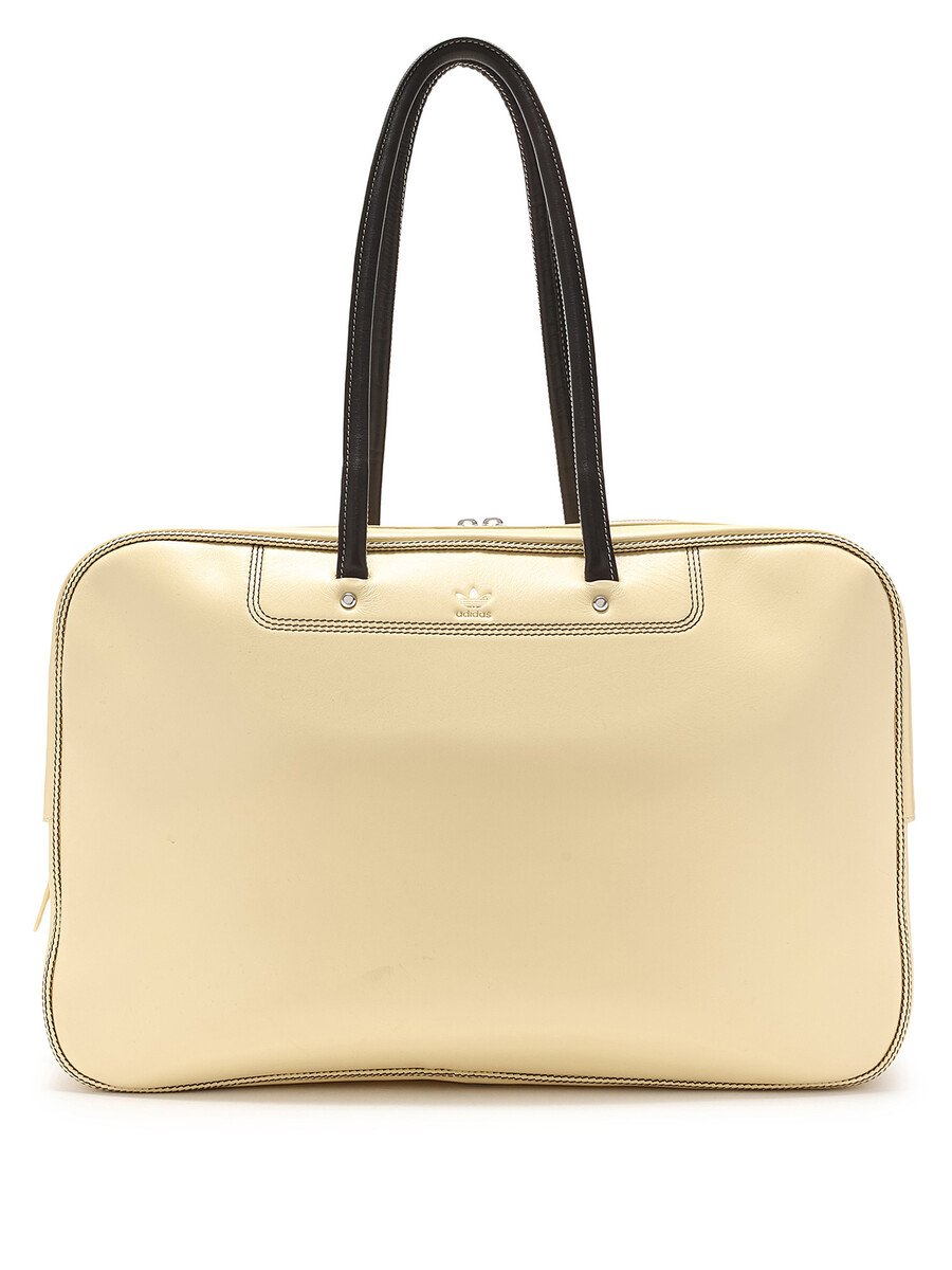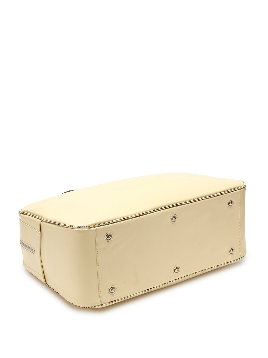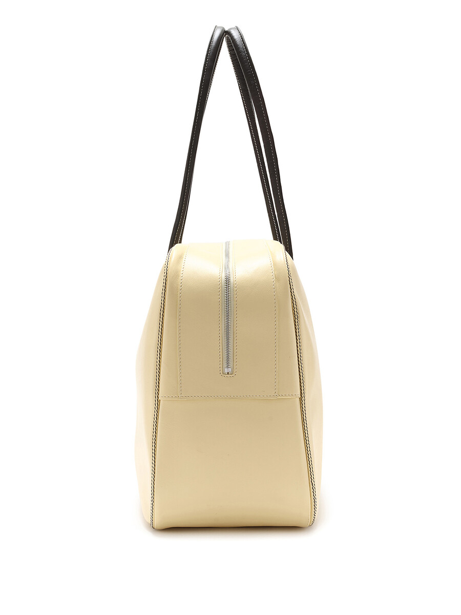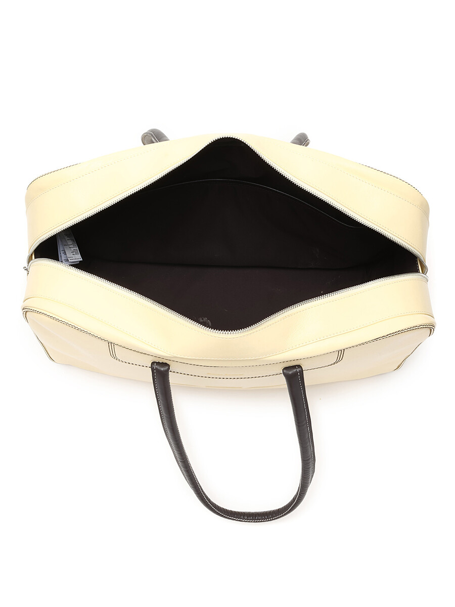 Polished yellow leather duffel bag. Fixed shoulder straps and zip closure.