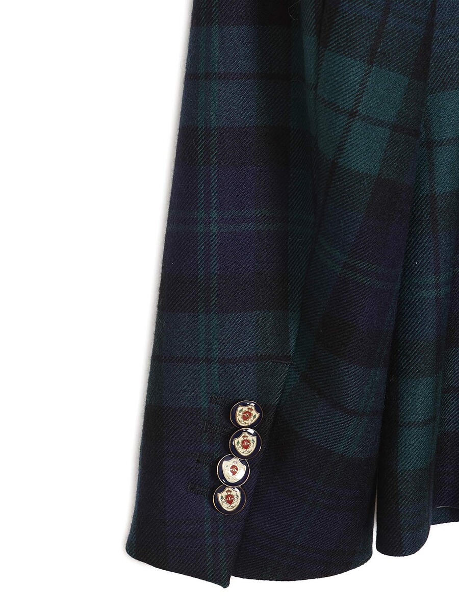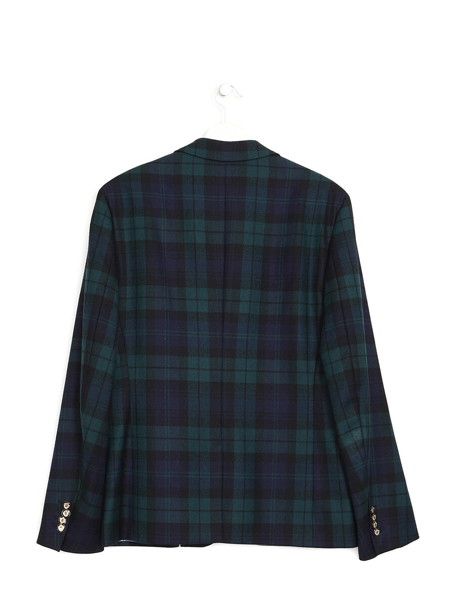 Plaid wool blazer featuring a classic notch lapel collar and front flap pockets.