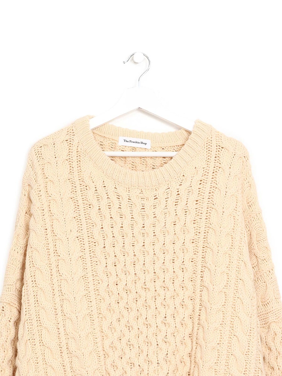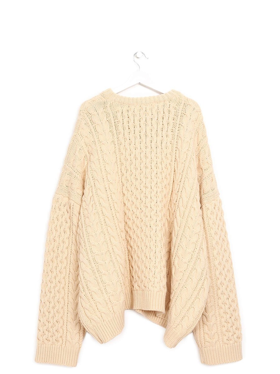 Oversized cable knit sweater in cream. Ribbed detailing at collar, cuffs, and hem.