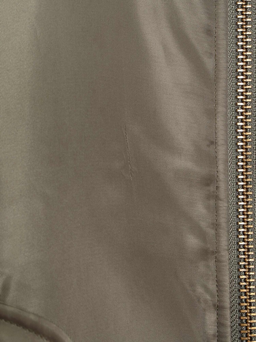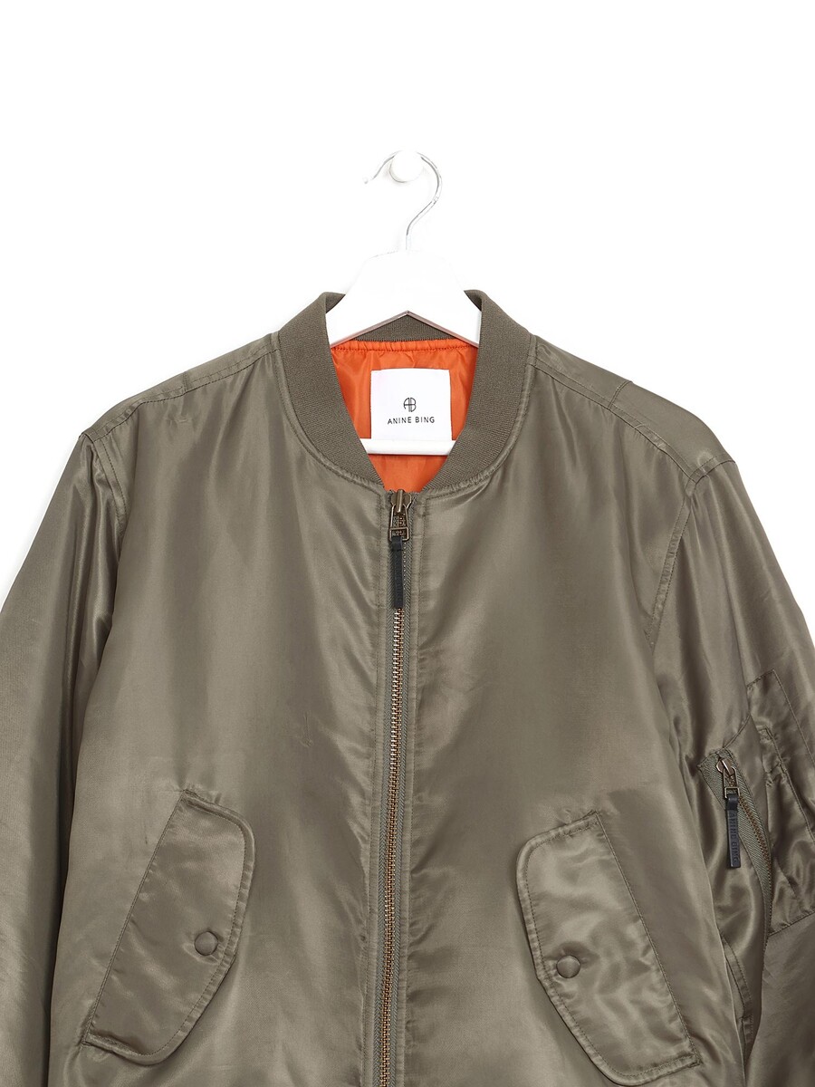 Olive green bomber jacket with long sleeves. Featuring a zipper closure and side pockets. Contrasting orange lining.
