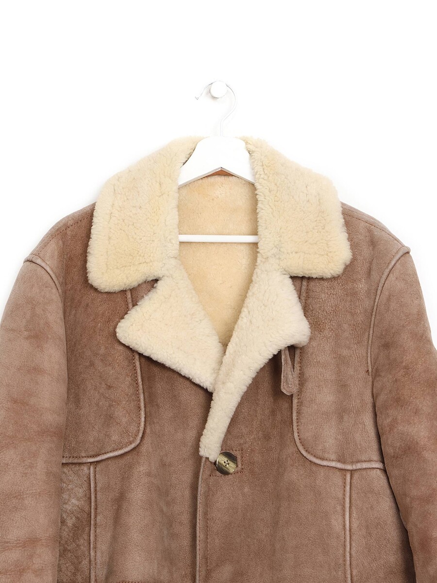 Long shearling coat in beige. Button-up closure. Large collar. Two front flap pockets.