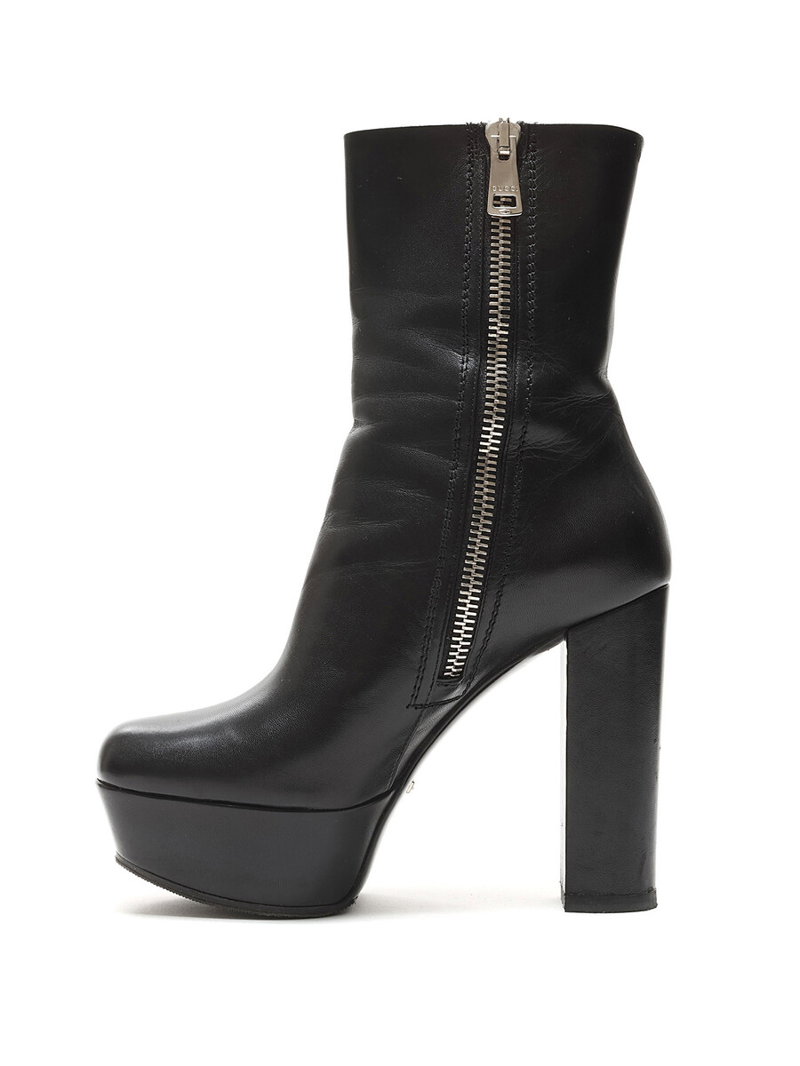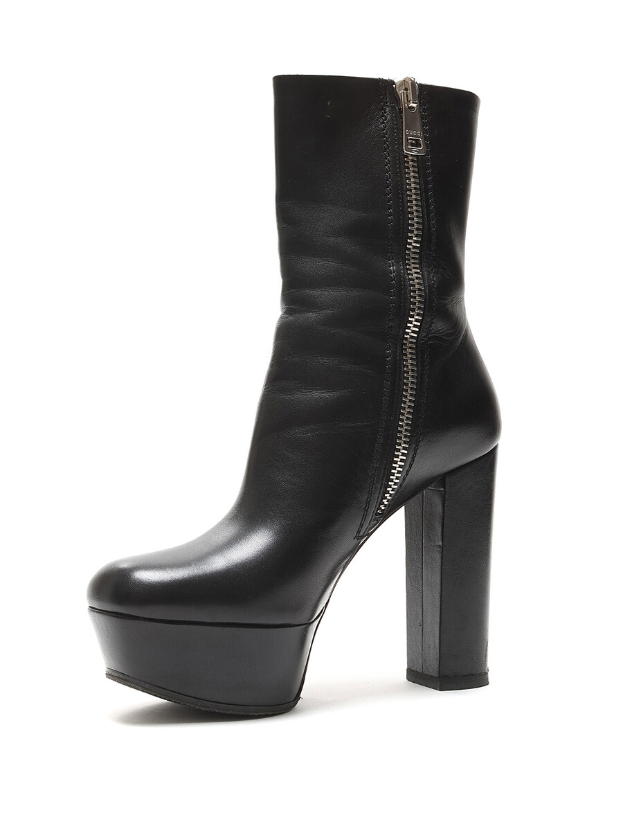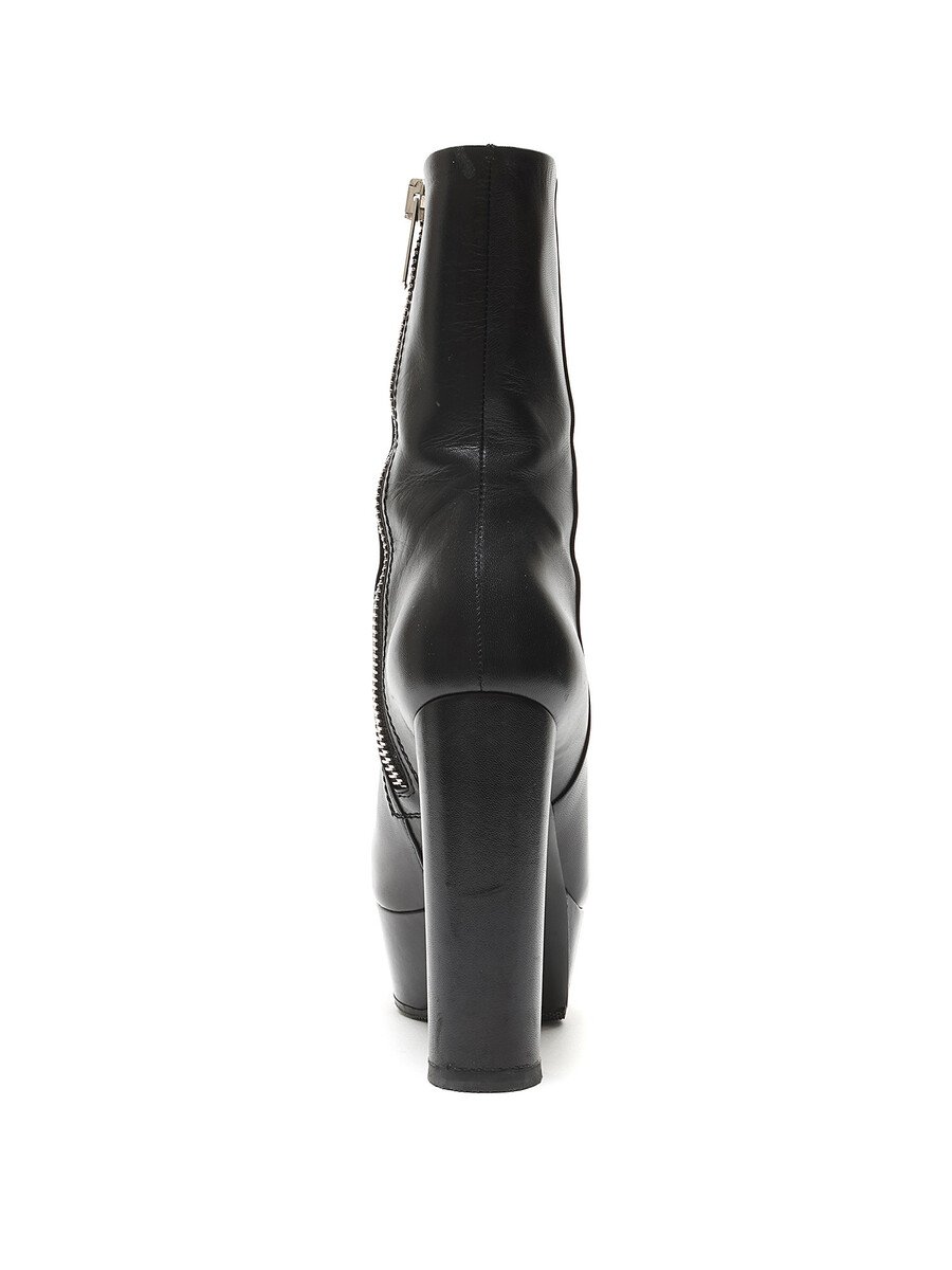 Leather block heel platform ankle boots in black. Featuring a silver zipper closure. Round toe style. With box.