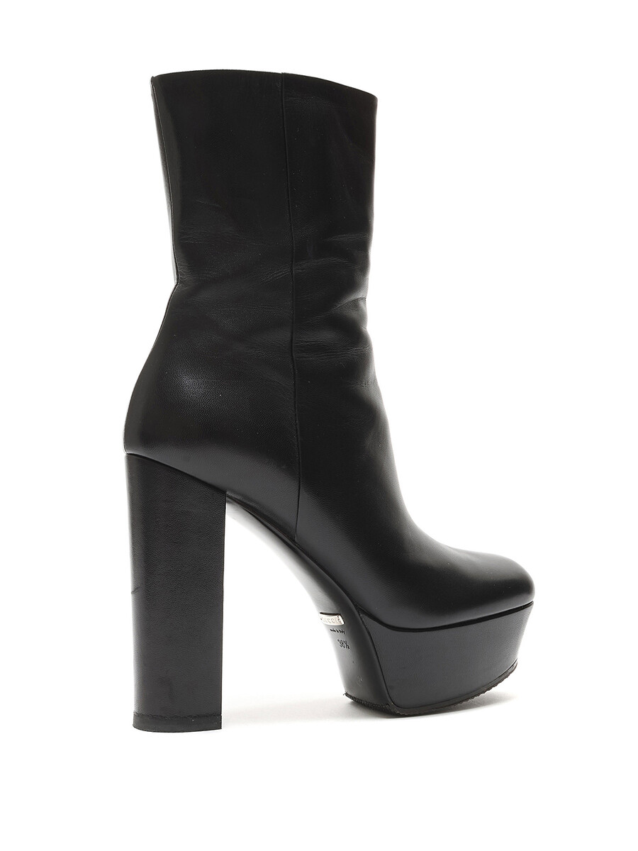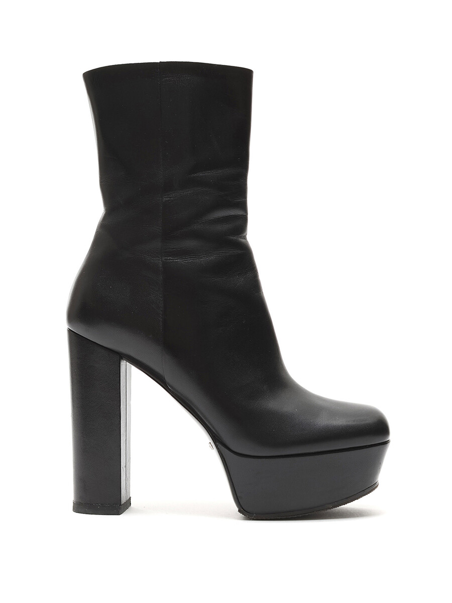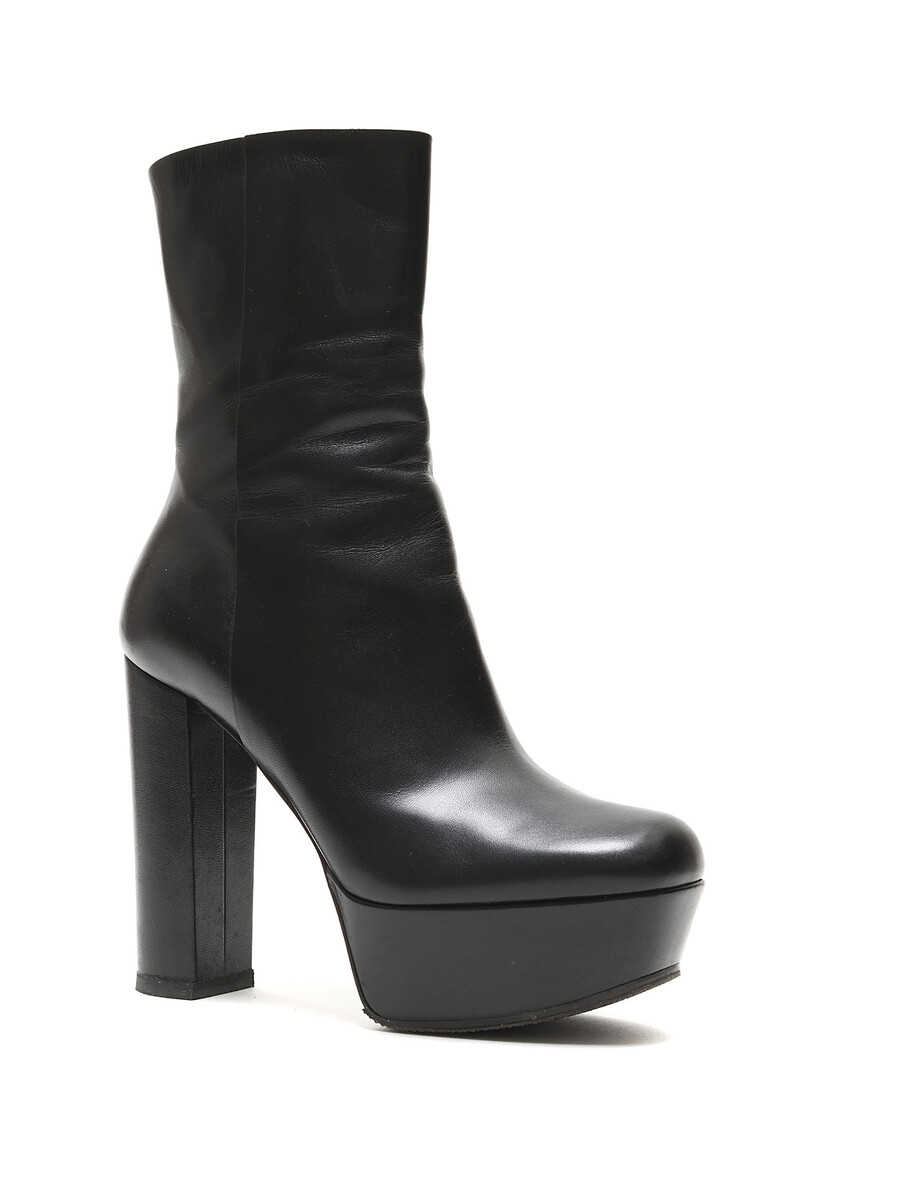Leather block heel platform ankle boots in black. Featuring a silver zipper closure. Round toe style. With box.
