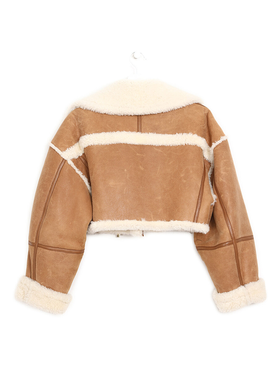 Long sleeve jacket with an oversized shearling collar in tan. Zipper closure. Front flap pockets.
