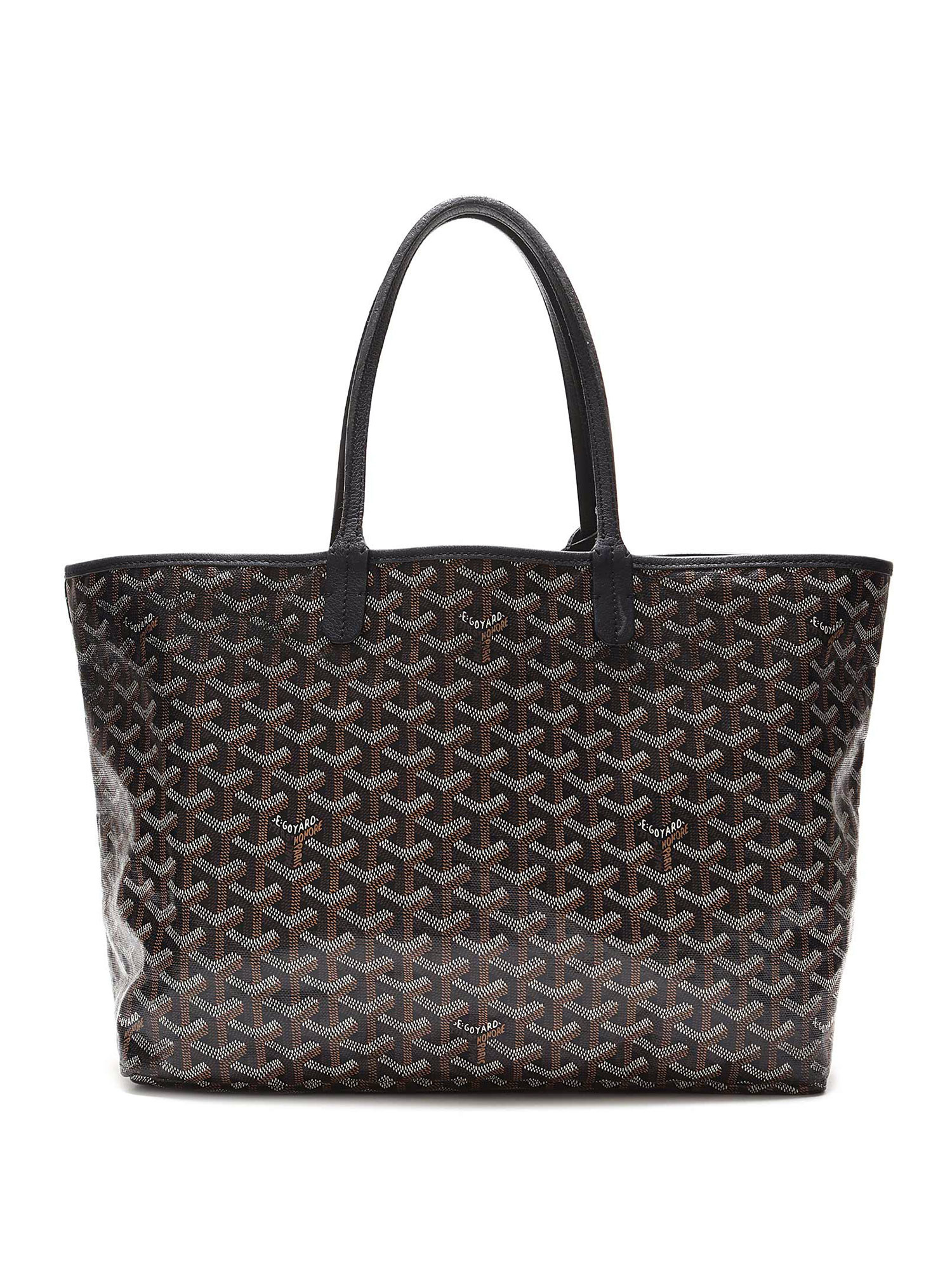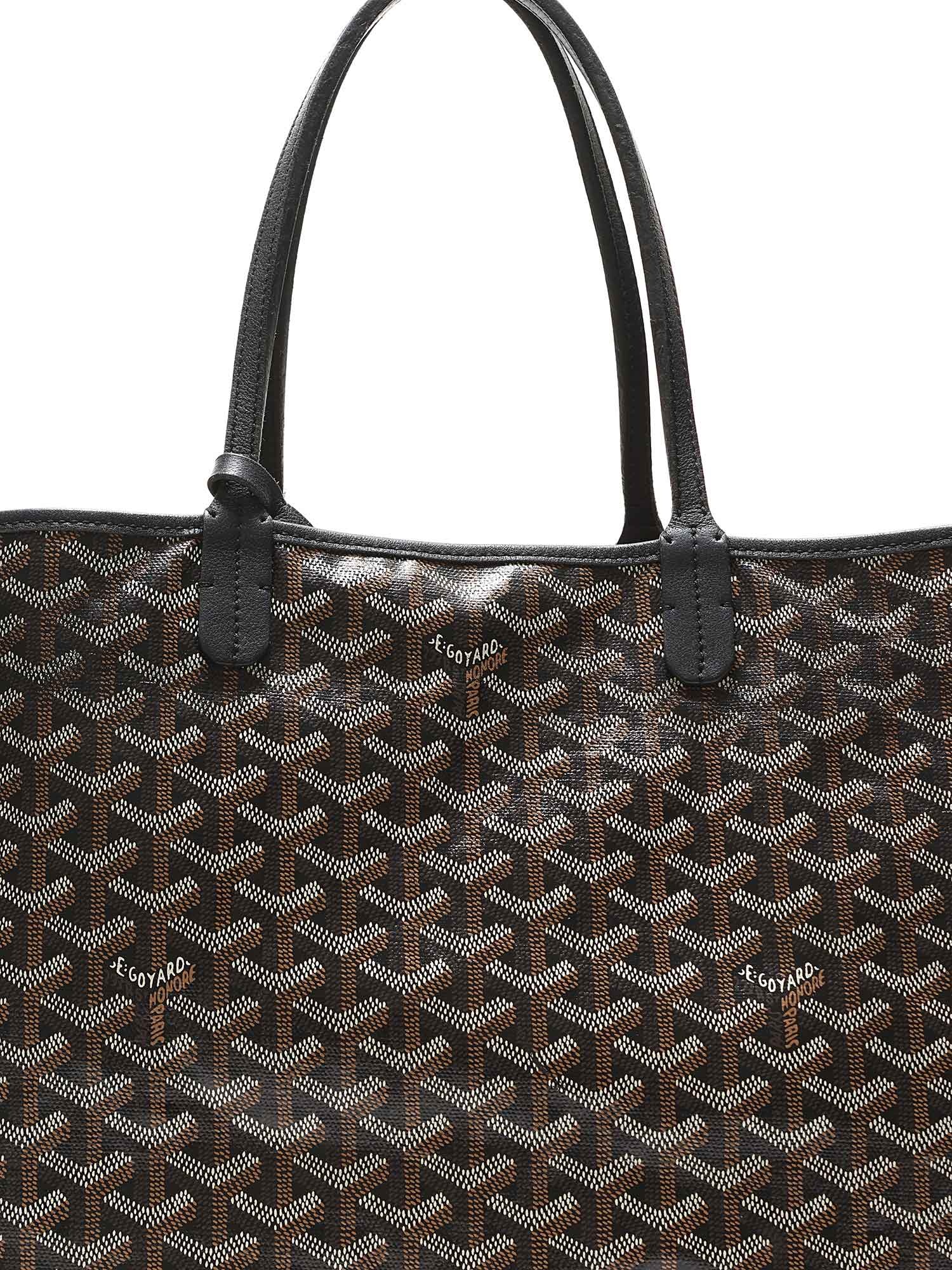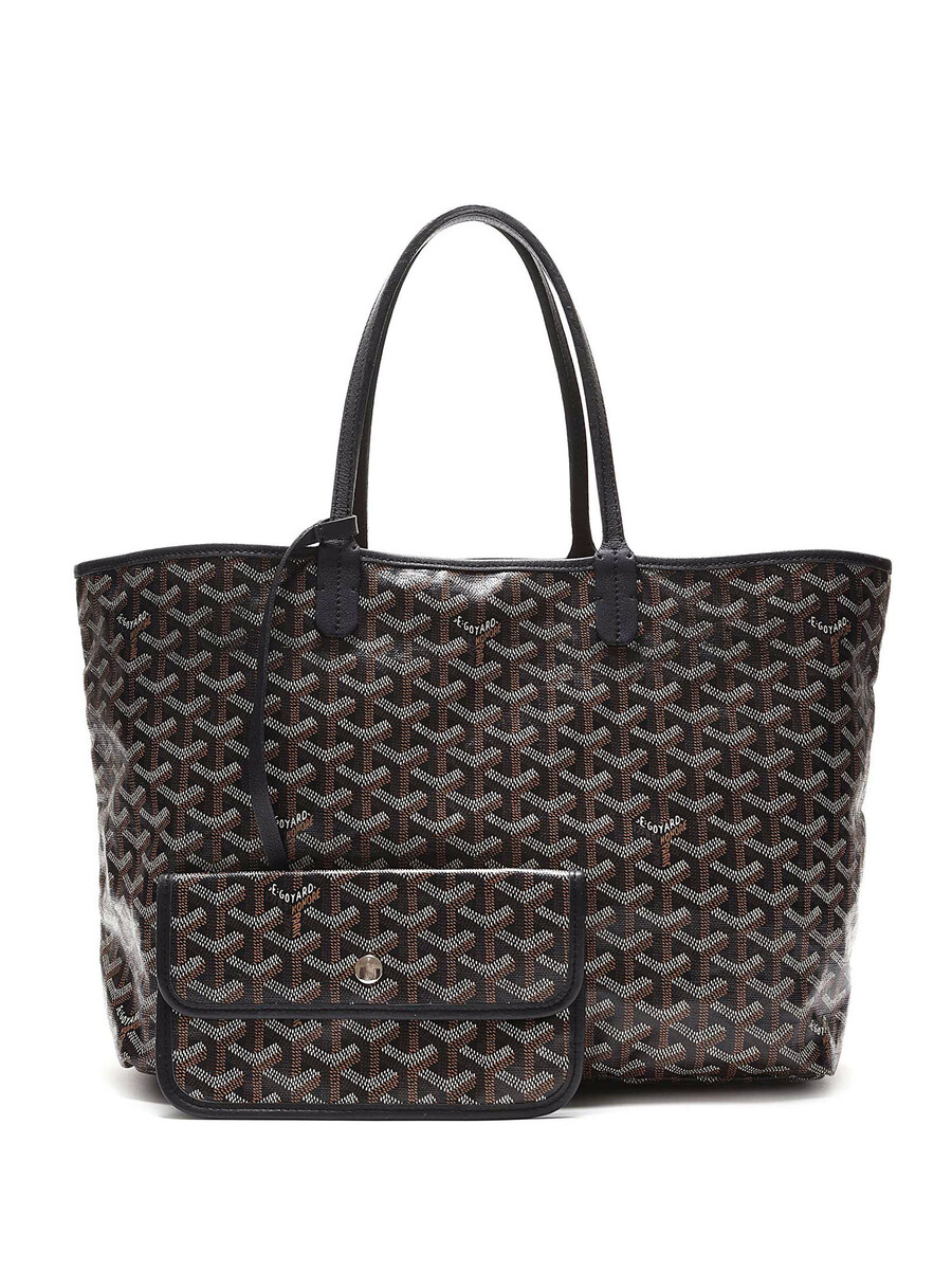 Chevron-patterned Goyardine canvas tote bag in tones of black, brown, and white. Black leather handles and trim. Comes with a detachable pouch.