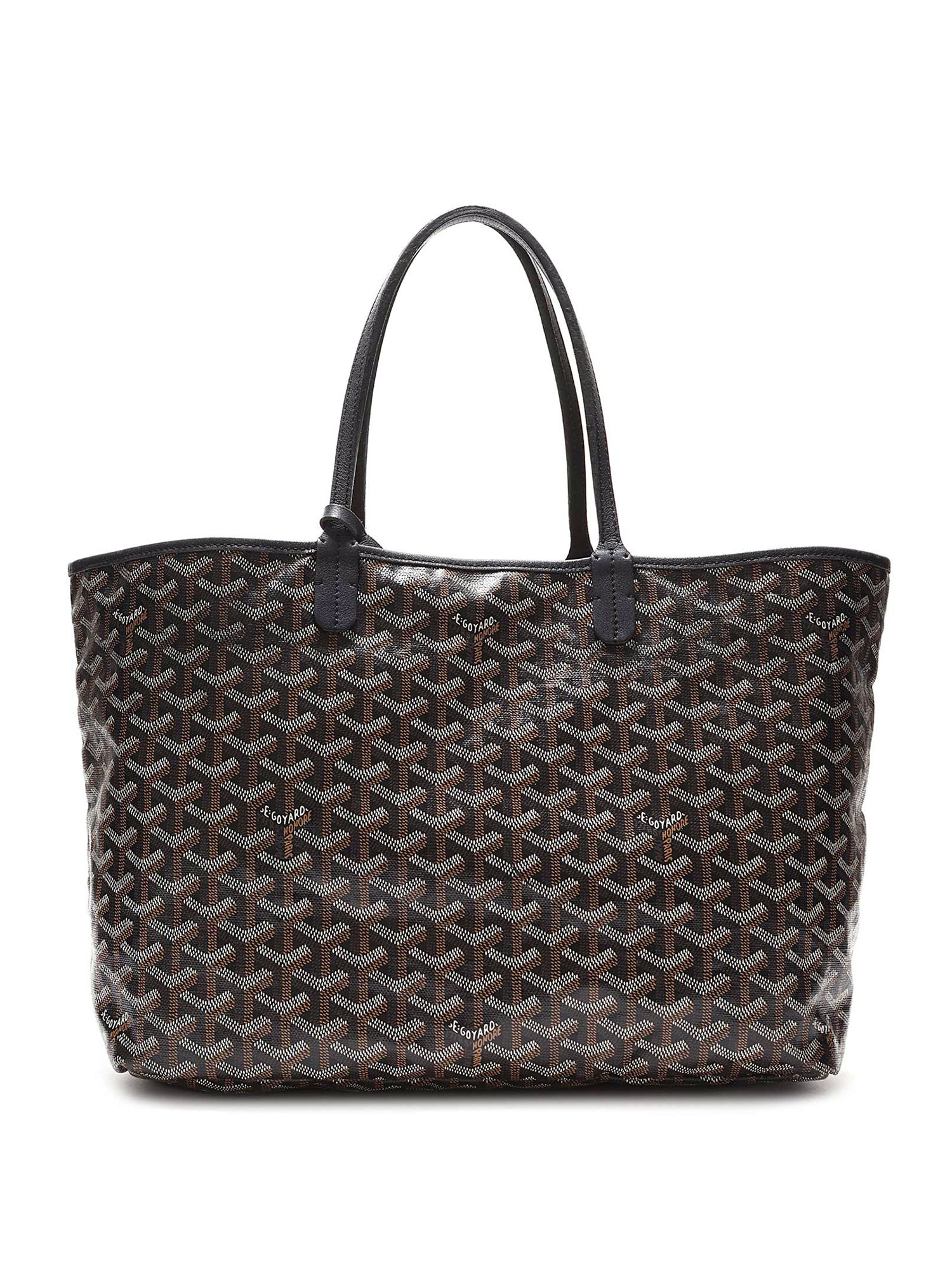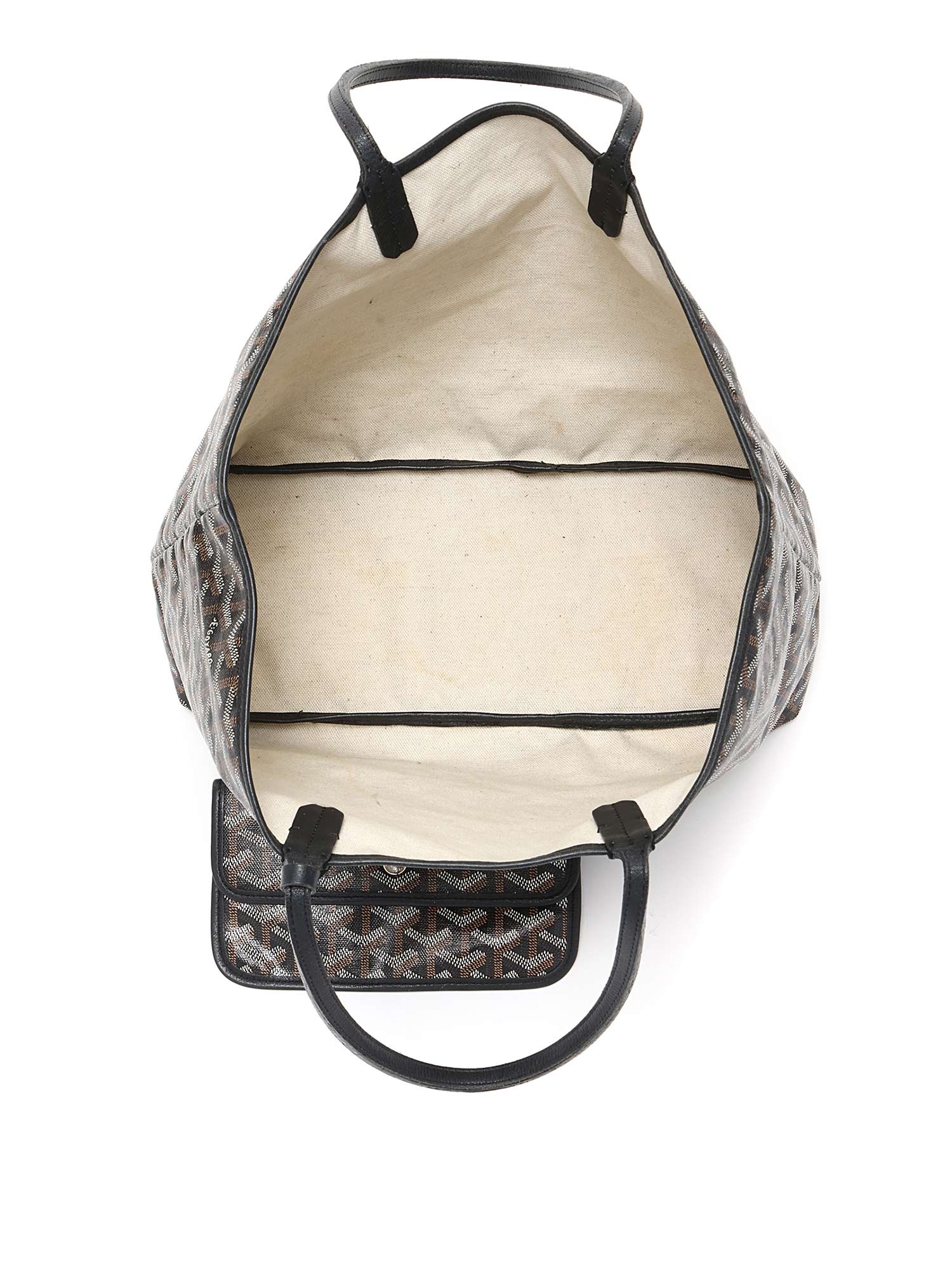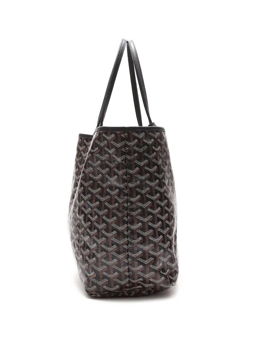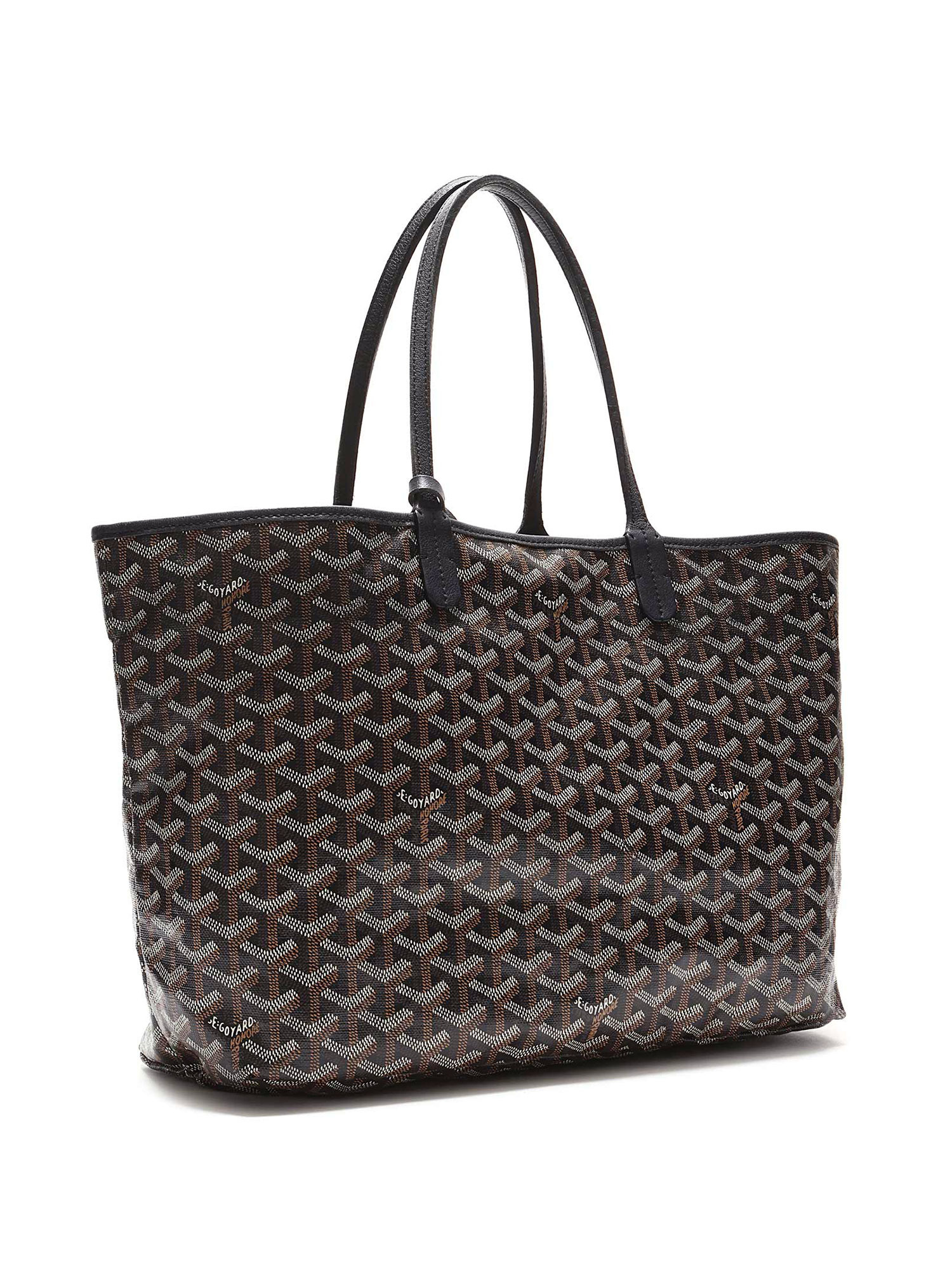 Chevron-patterned Goyardine canvas tote bag in tones of black, brown, and white. Black leather handles and trim. Comes with a detachable pouch.