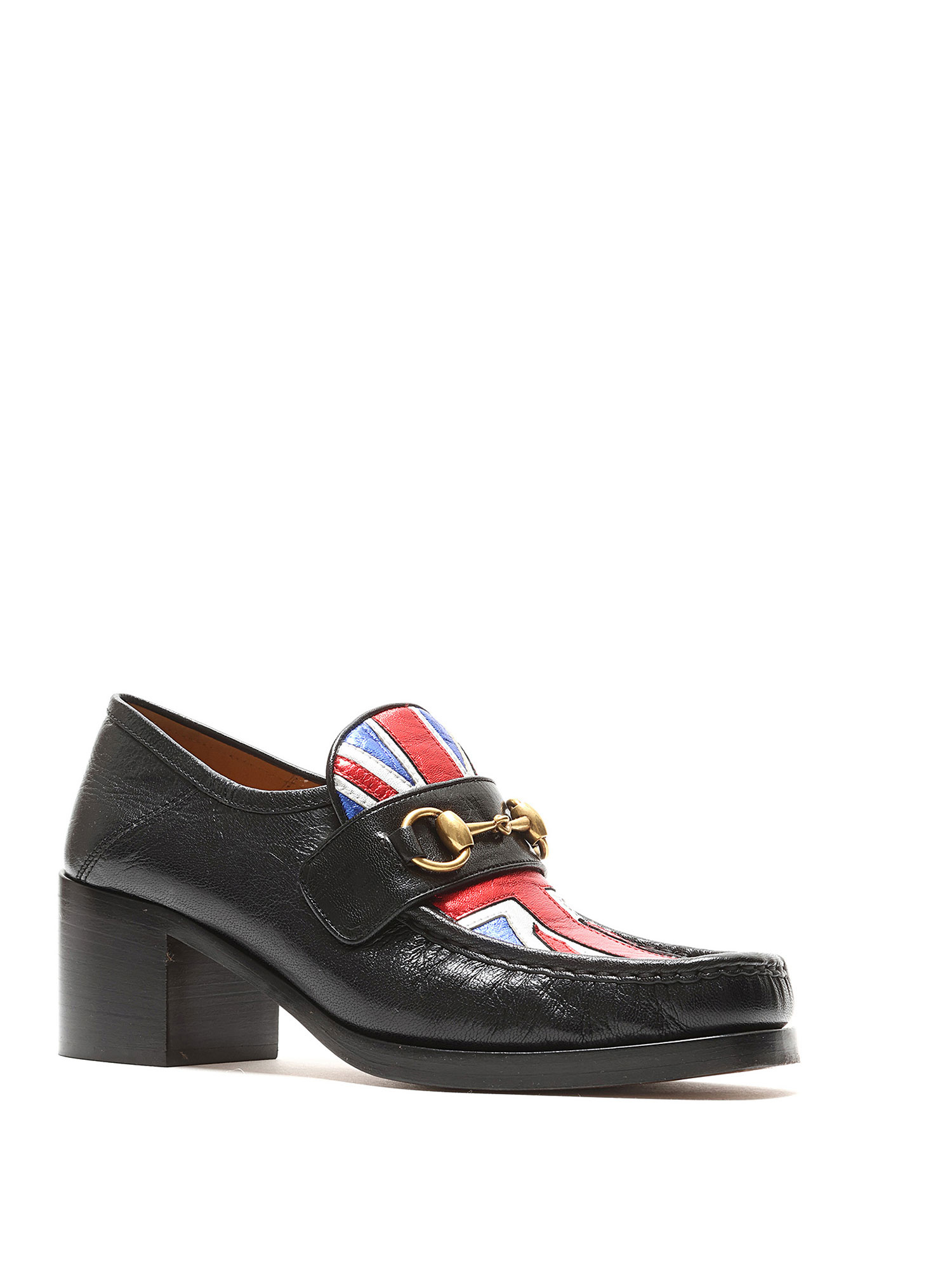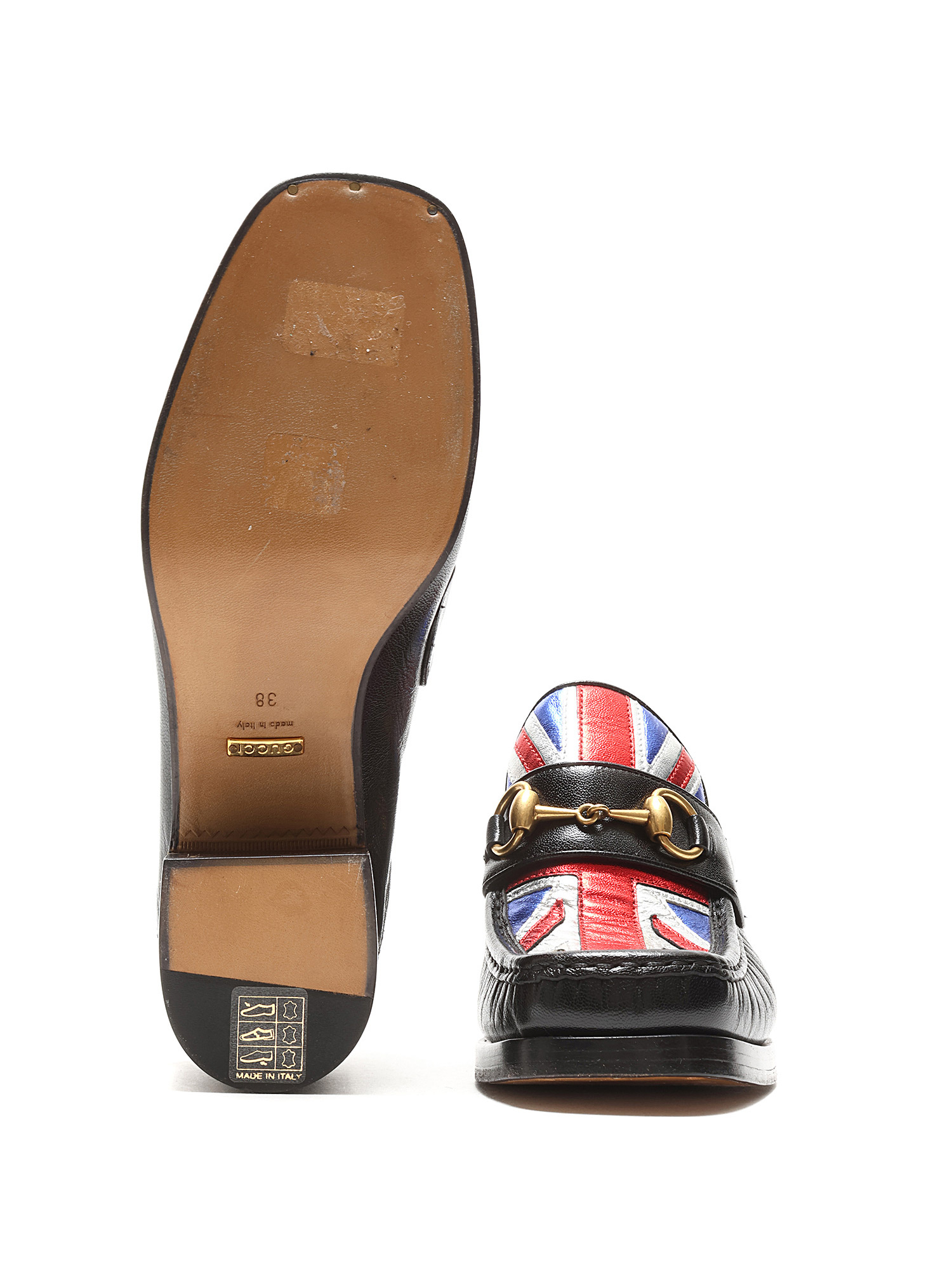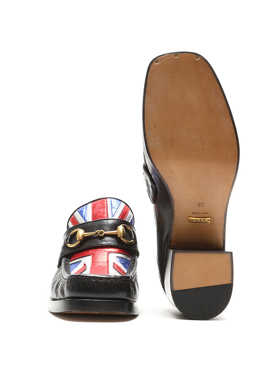 Grained leather loafers featuring a Union Jack motif and gold-tone horsebit detail. Slip-on closure. Square toe. Leather sole.