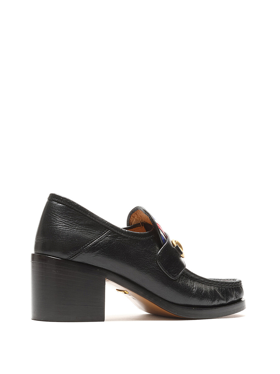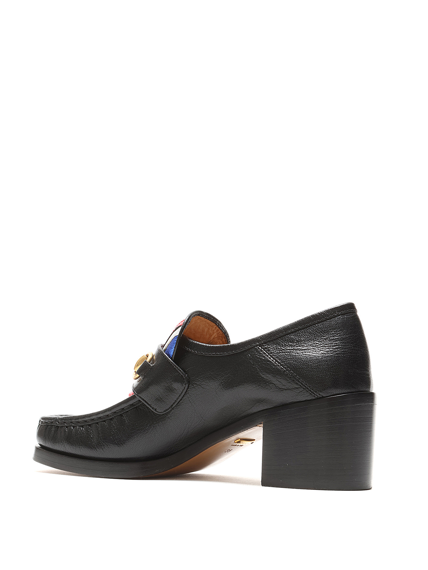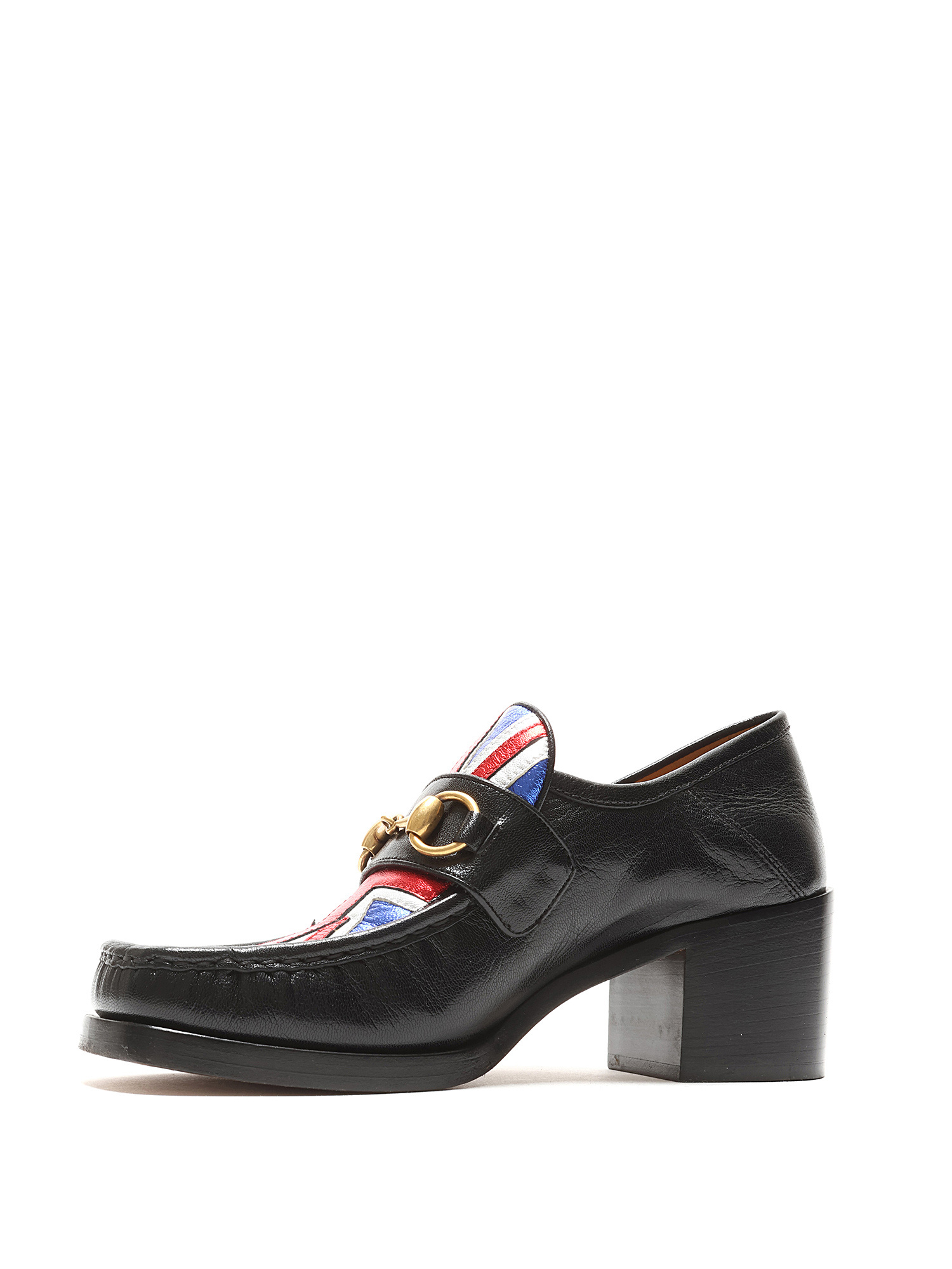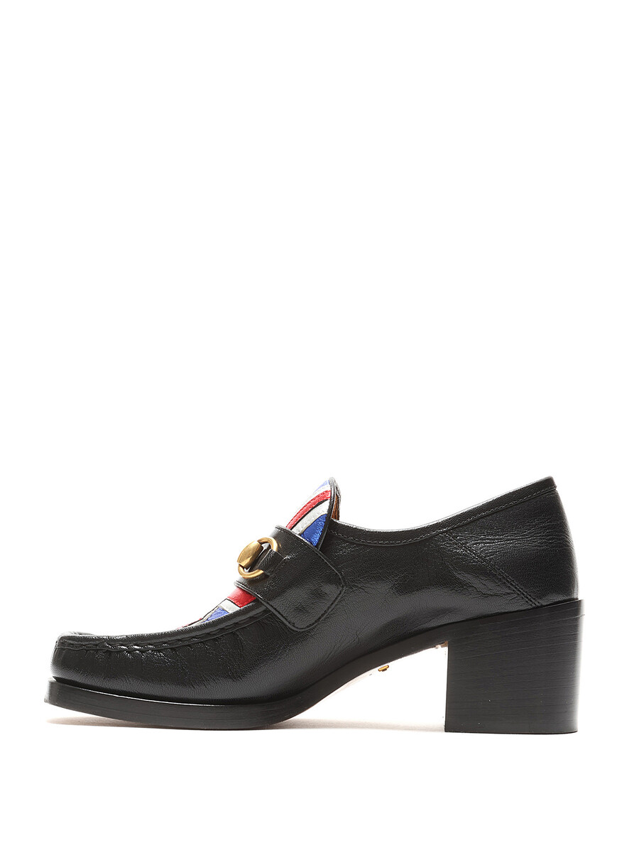 Grained leather loafers featuring a Union Jack motif and gold-tone horsebit detail. Slip-on closure. Square toe. Leather sole.
