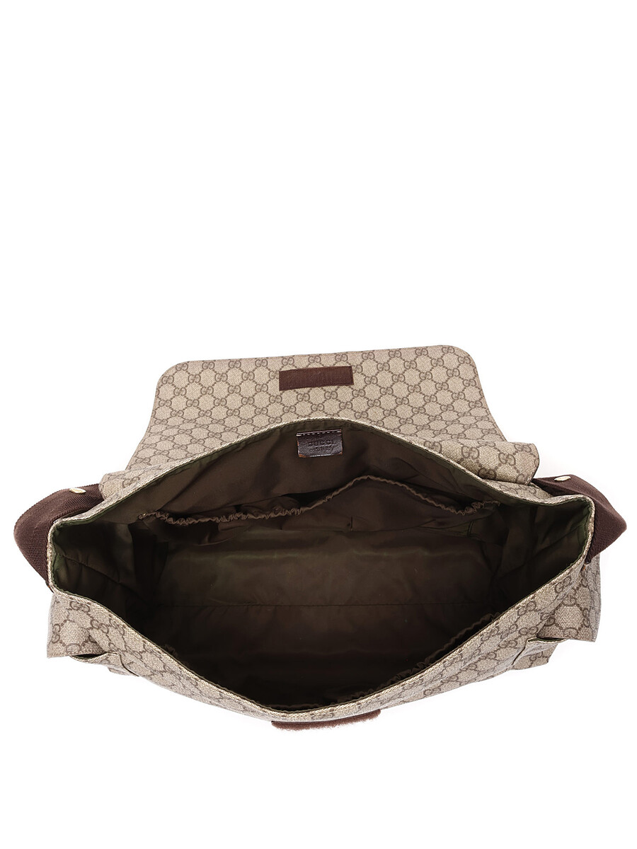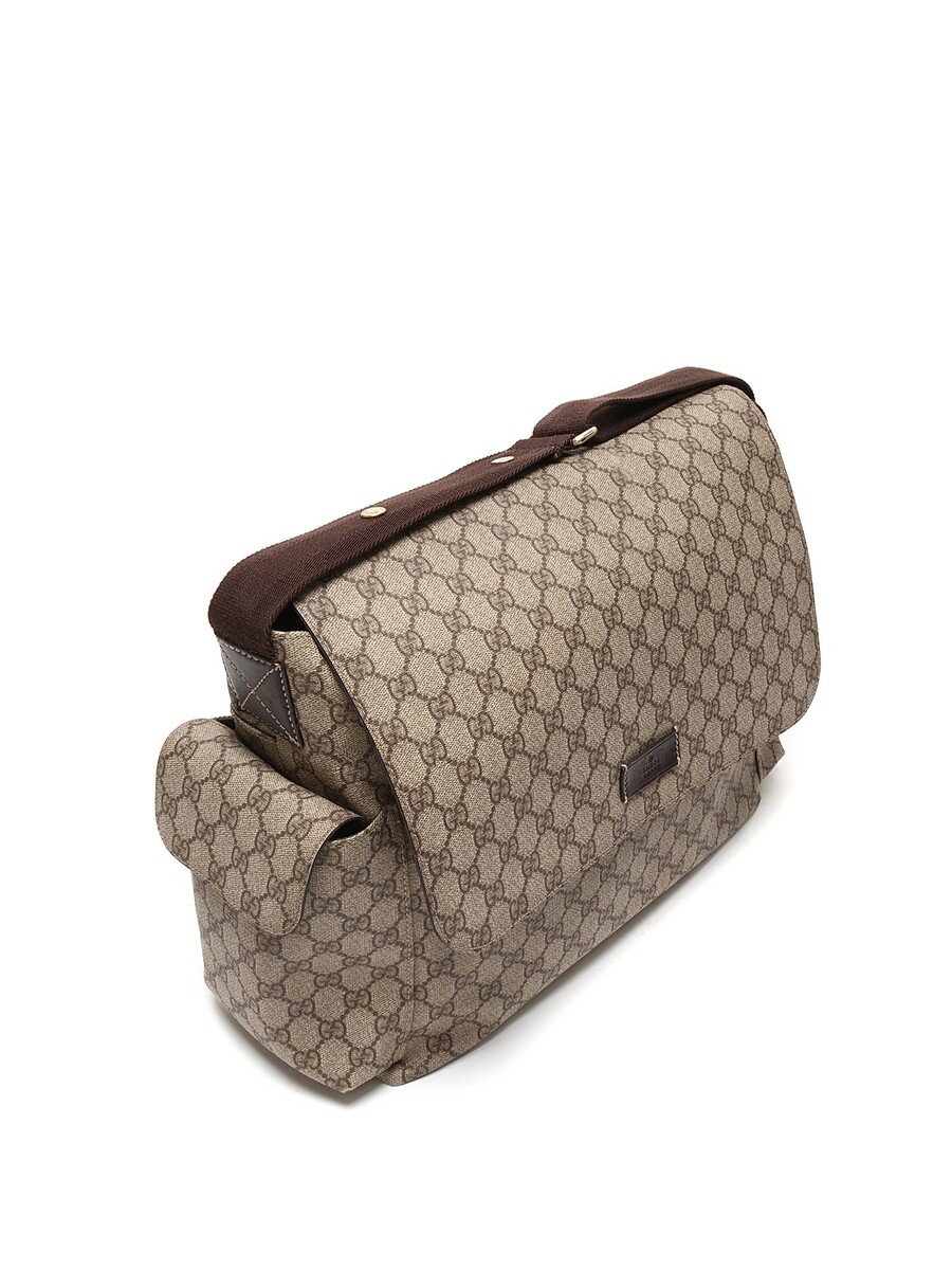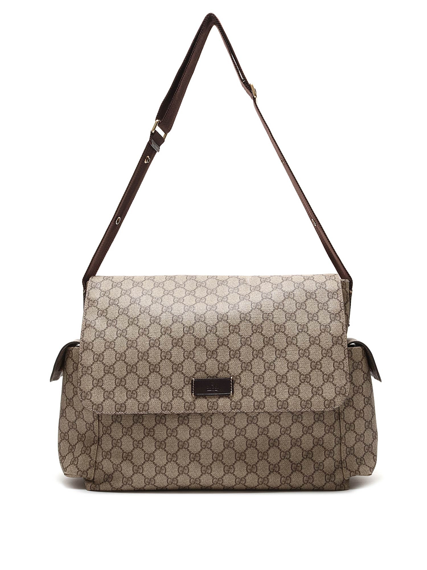 GG Monogram coated canvas diaper bag by Gucci. Features a flap with velcro snap closure. Comes with adjustable shoulder strap. Leather trims complemented by silver-tone hardware.