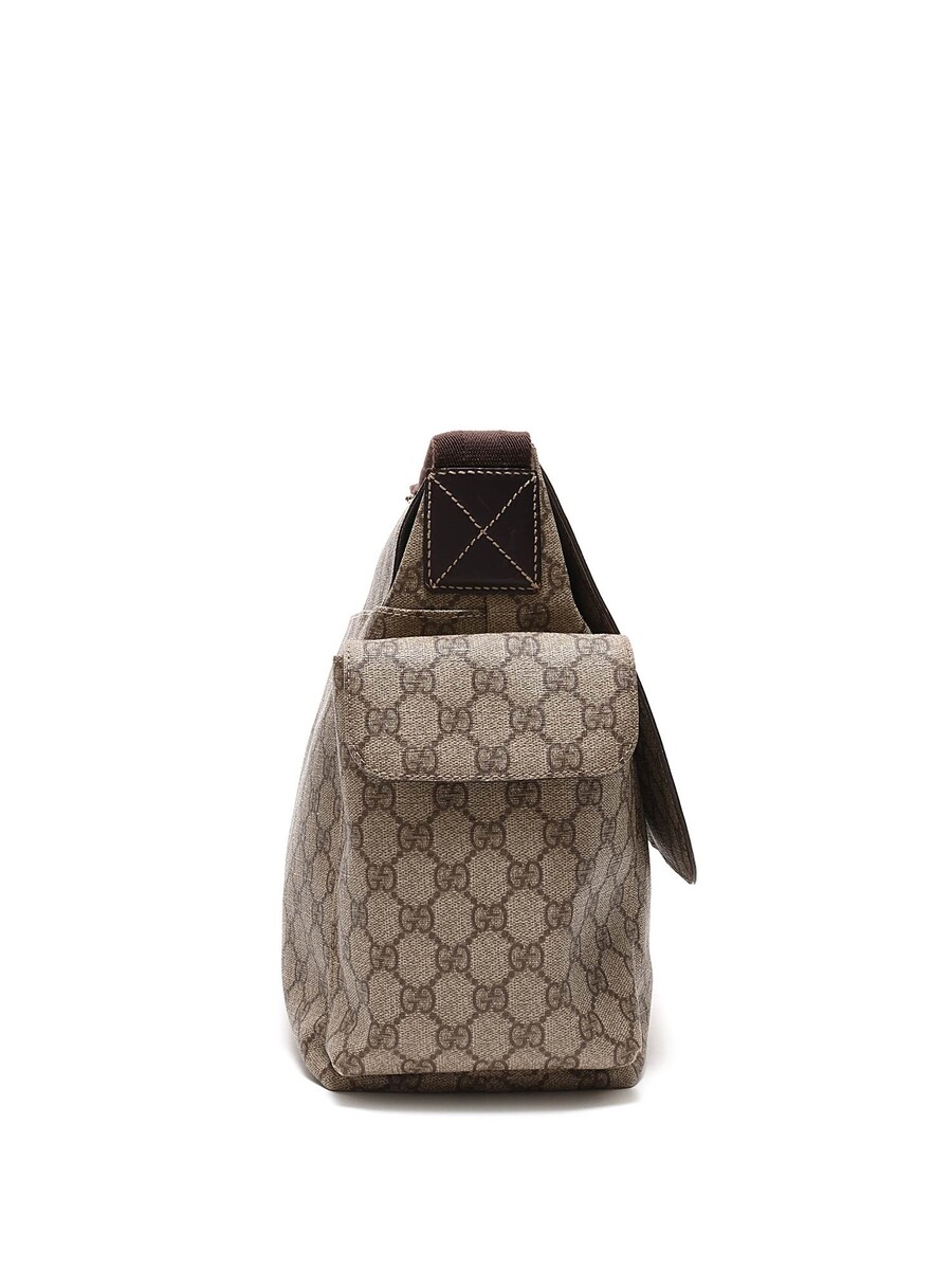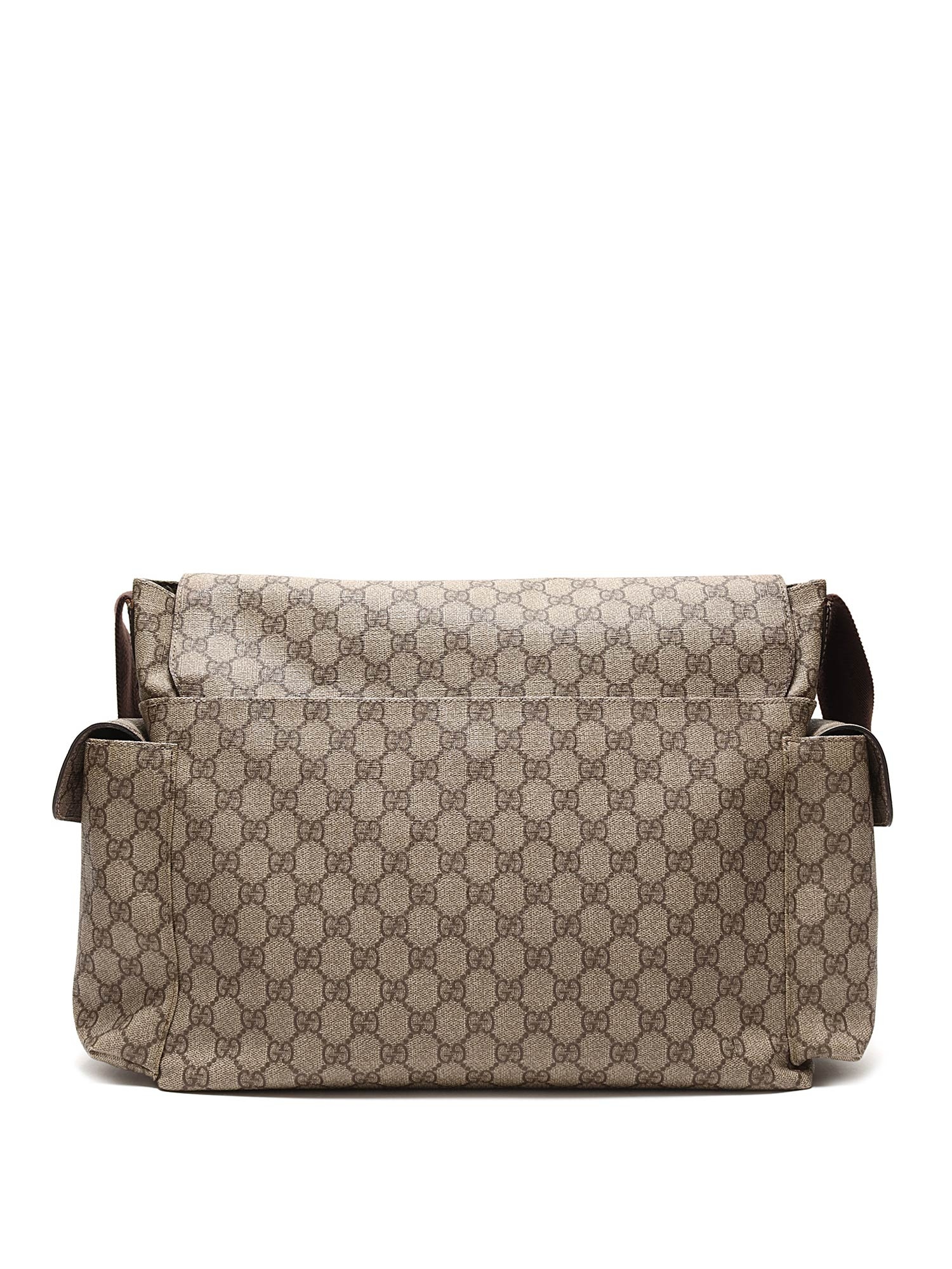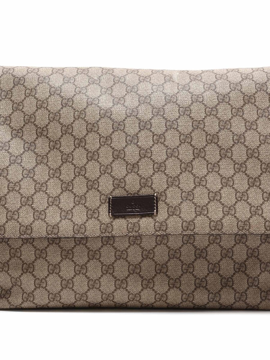 GG Monogram coated canvas diaper bag by Gucci. Features a flap with velcro snap closure. Comes with adjustable shoulder strap. Leather trims complemented by silver-tone hardware.