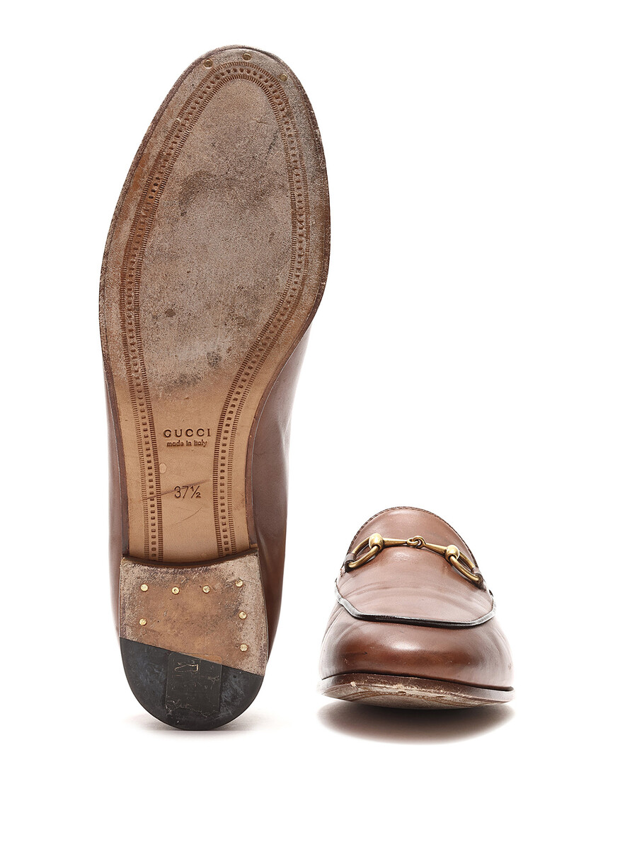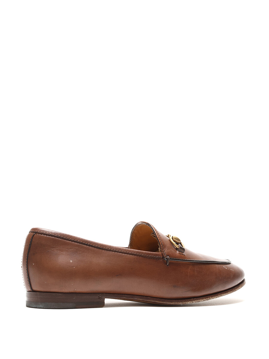 Grained leather slip-on loafers in brown. Round toe featuring metal horsebit detail. Leather sole.