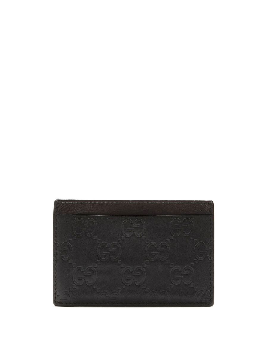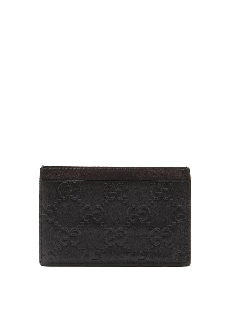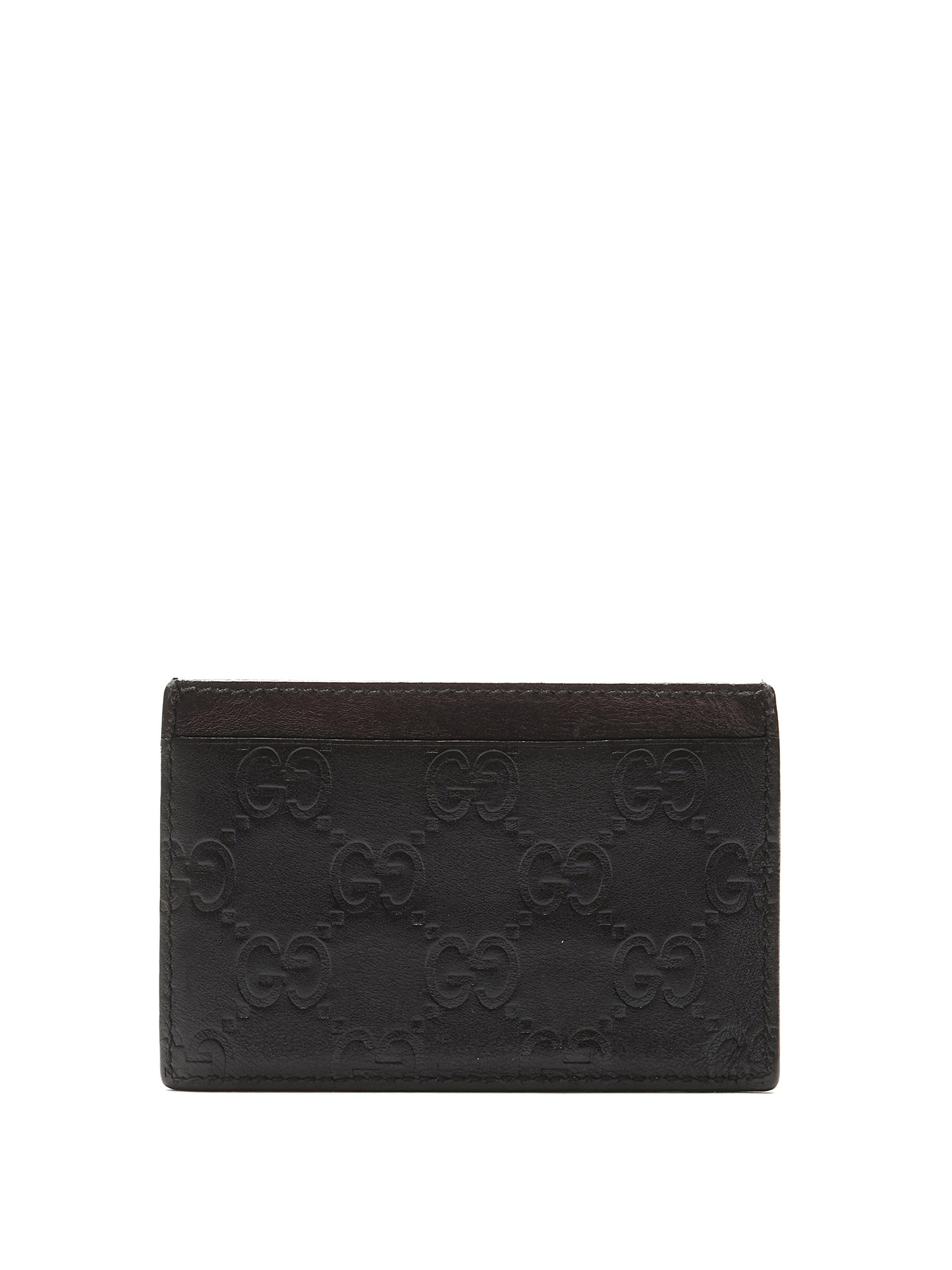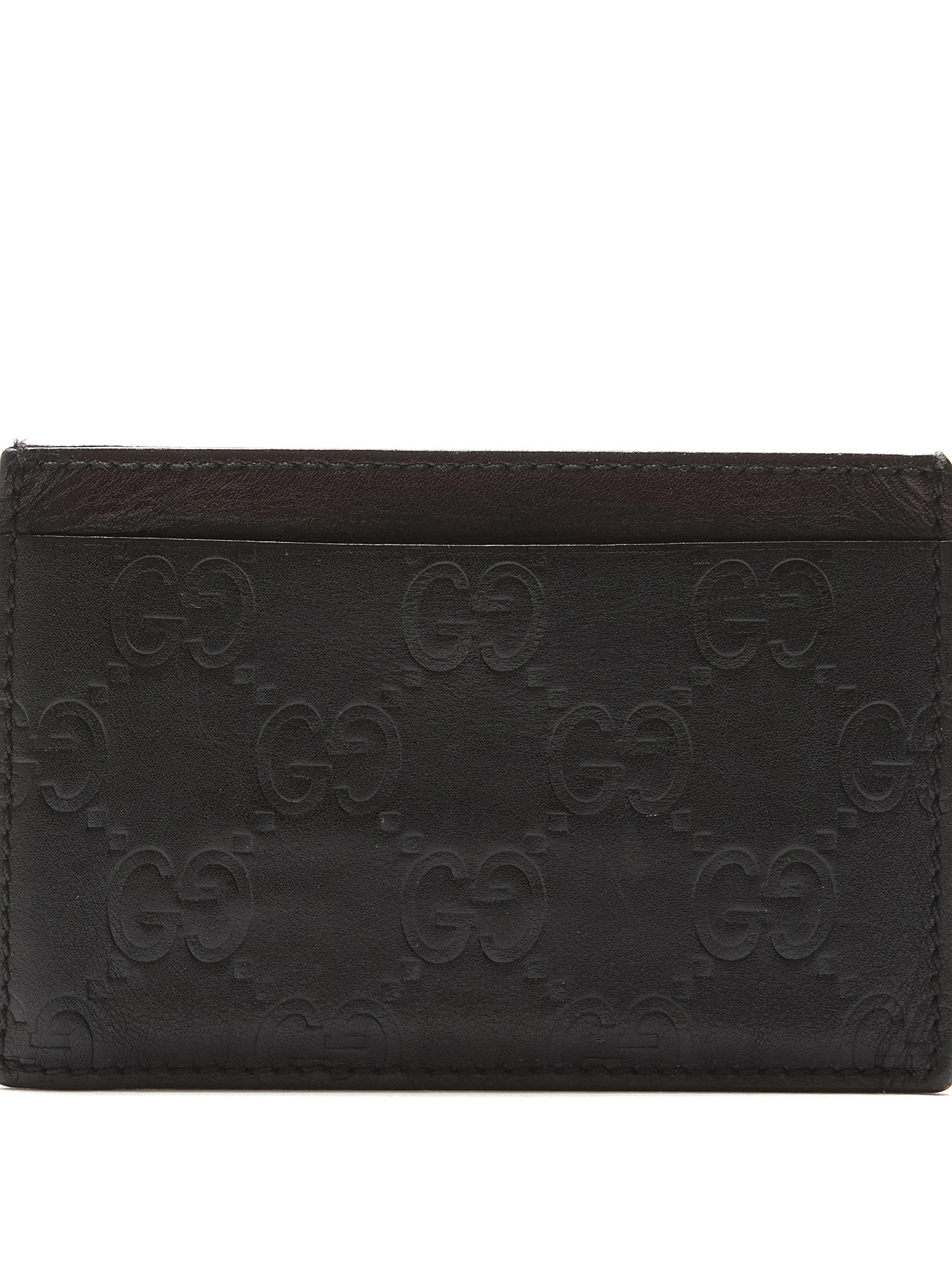 Black leather cardholder featuring embossed GG Supreme pattern. Compact design with multiple card slots.