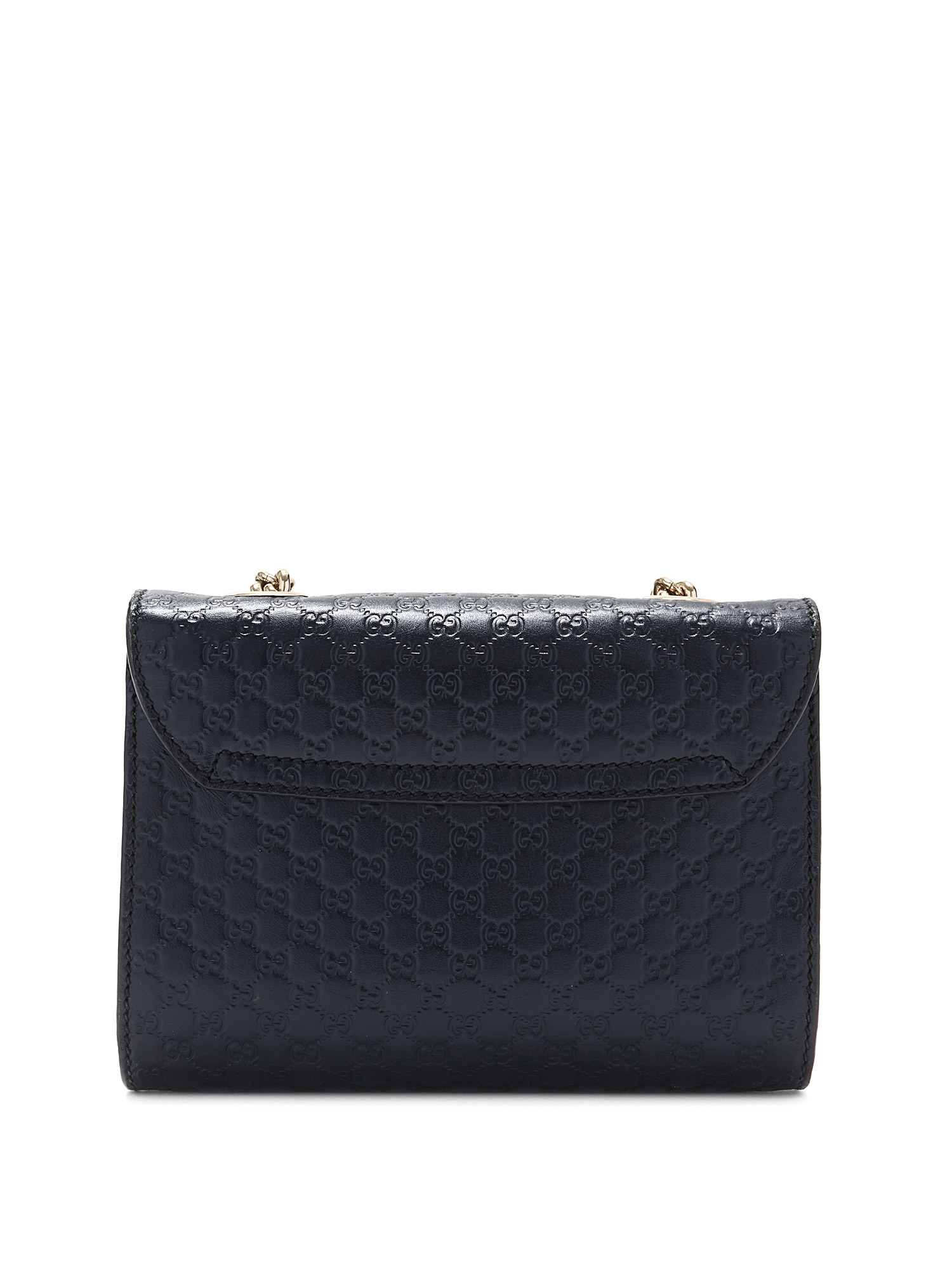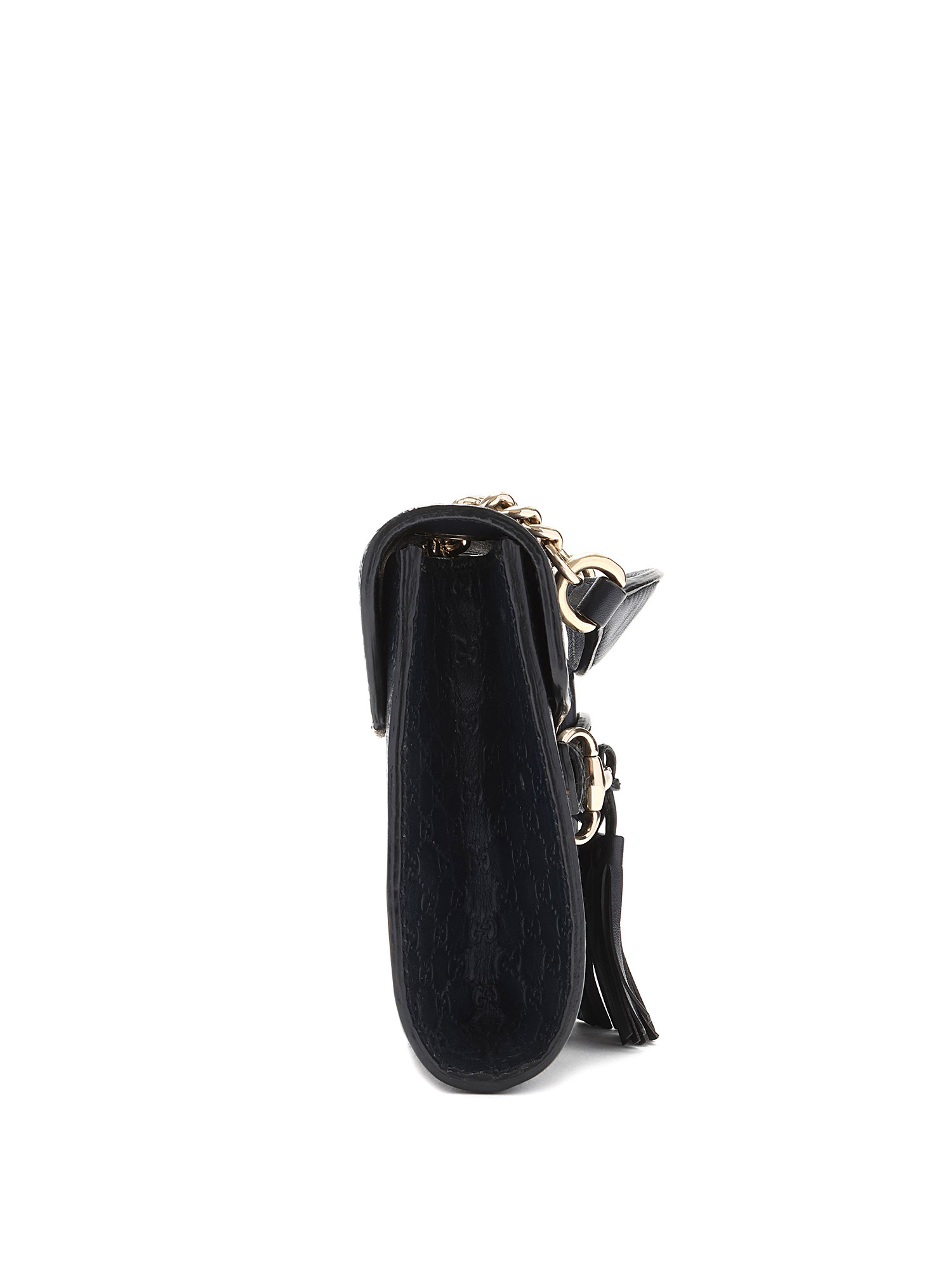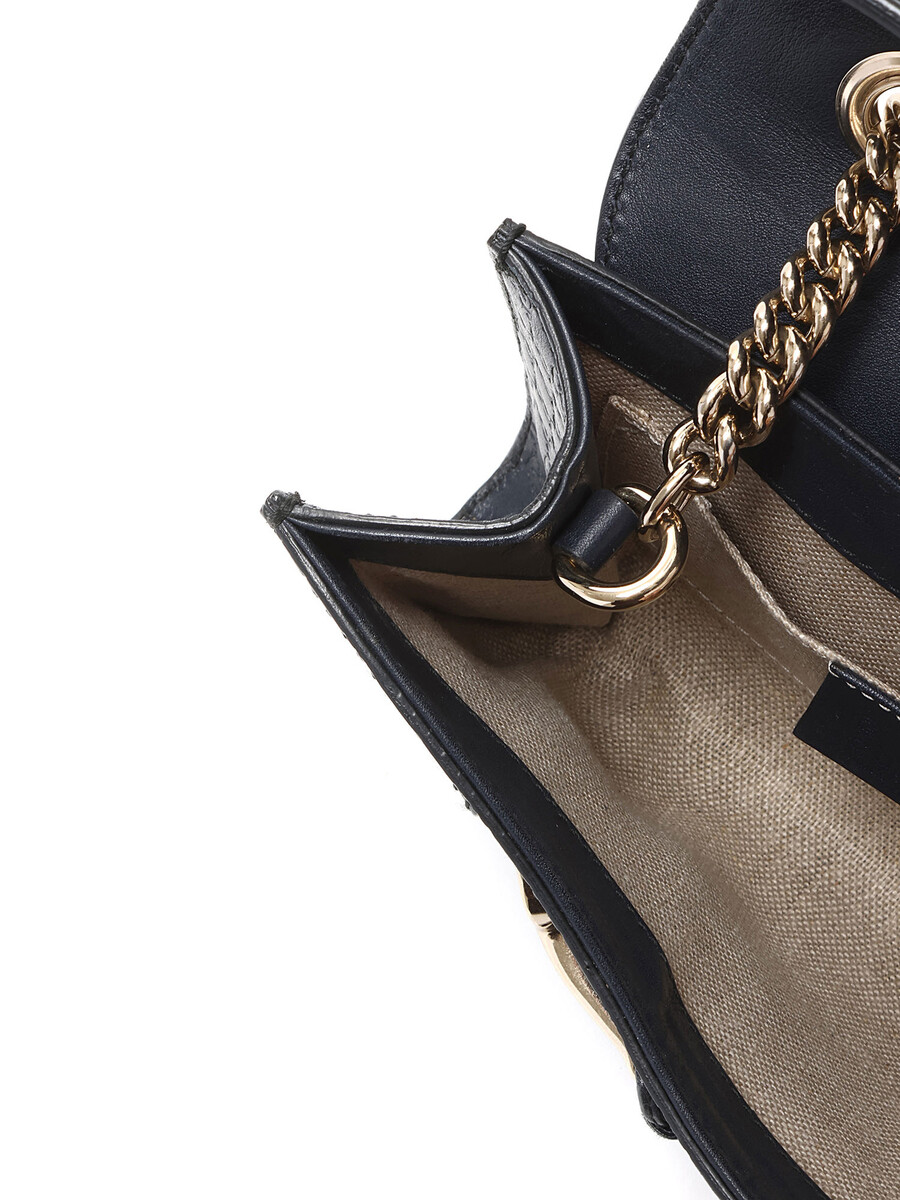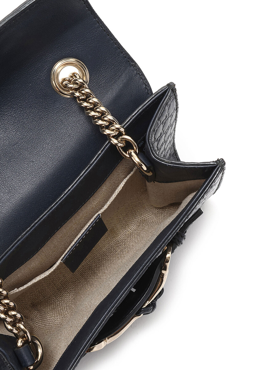 Mini Dionysus shoulder bag in interlocking G-patterned leather, navy blue. Flap closure with signature tiger head spur buckle. Silver tone chain shoulder strap with leather pad.