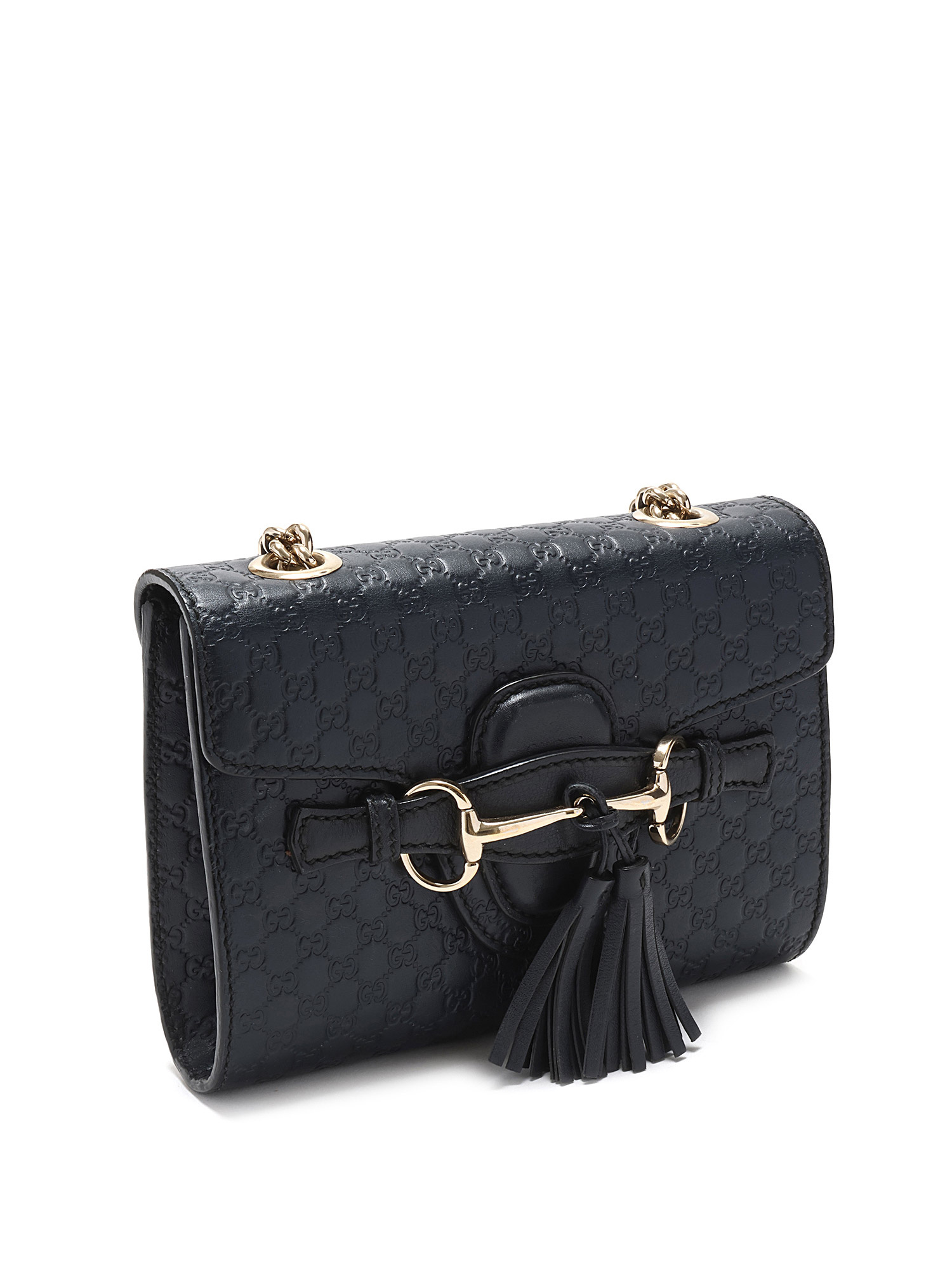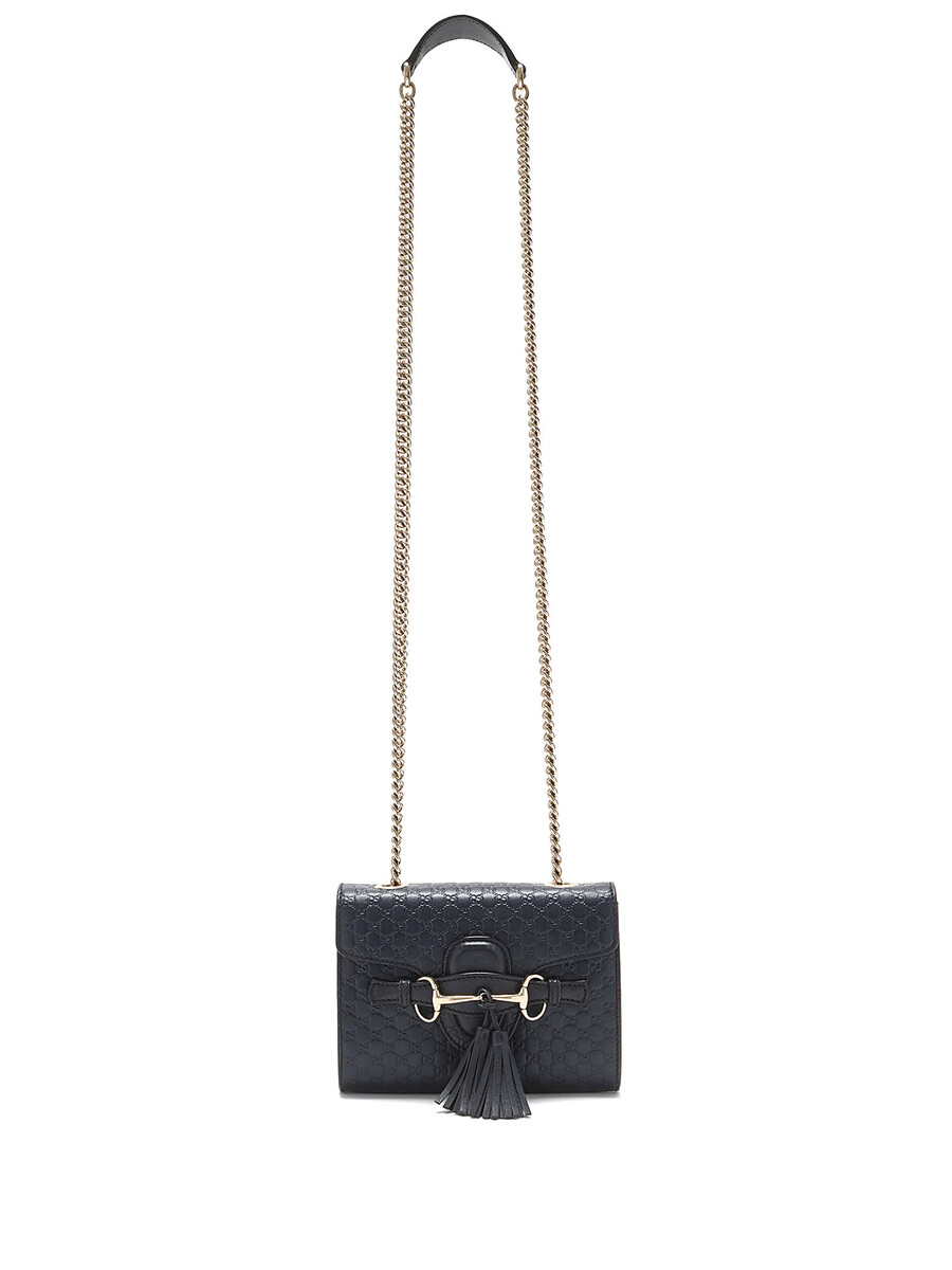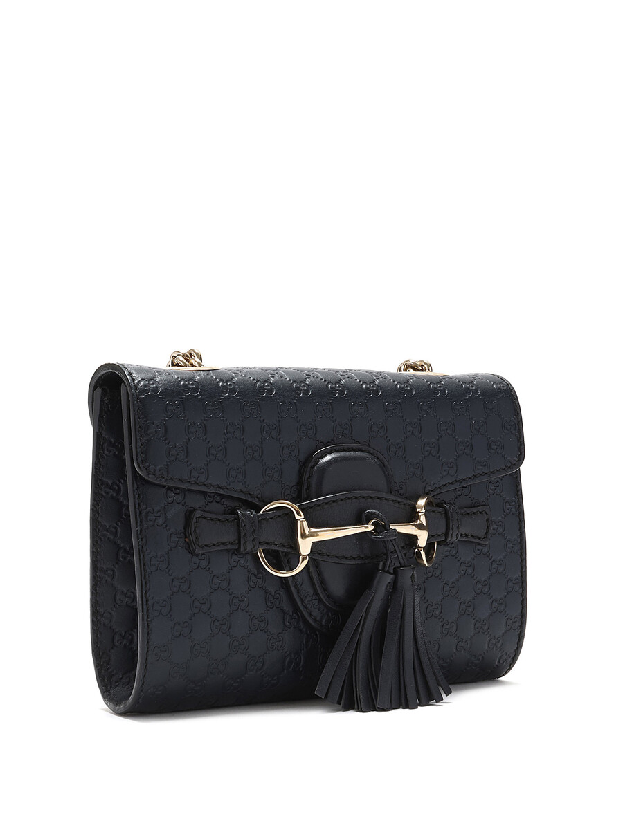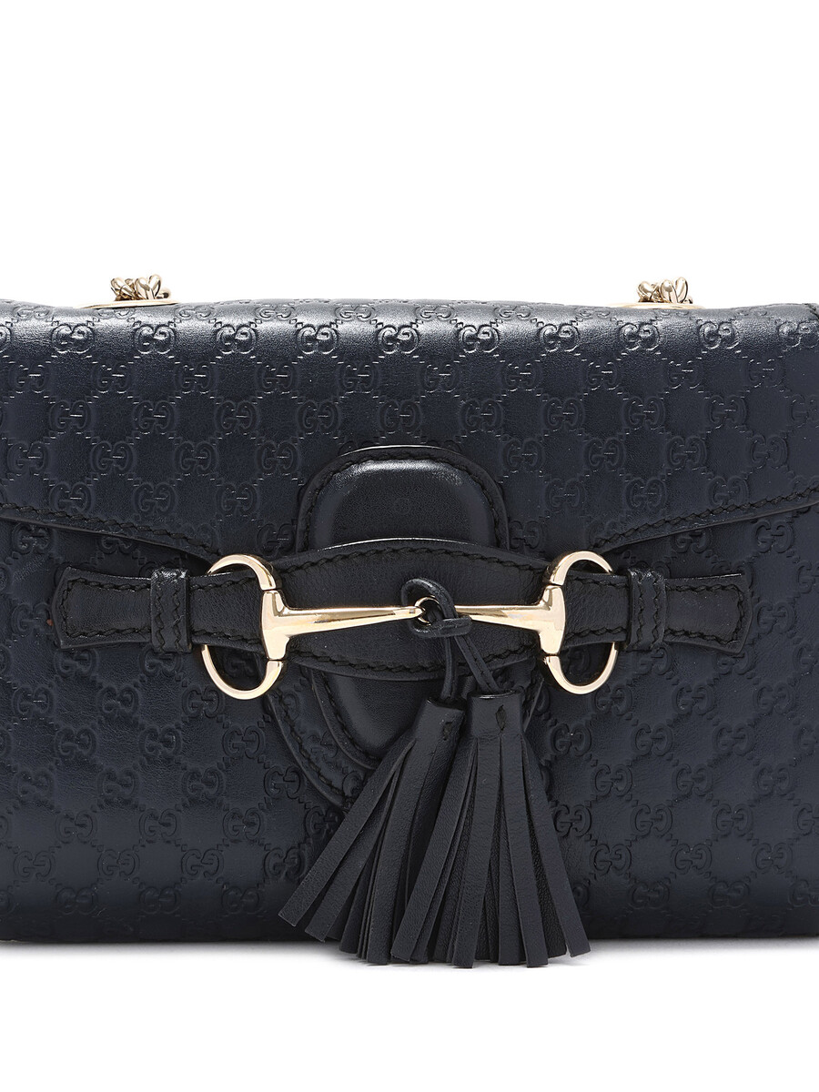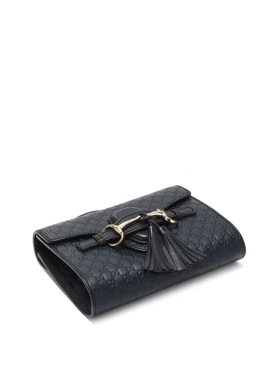 Mini Dionysus shoulder bag in interlocking G-patterned leather, navy blue. Flap closure with signature tiger head spur buckle. Silver tone chain shoulder strap with leather pad.