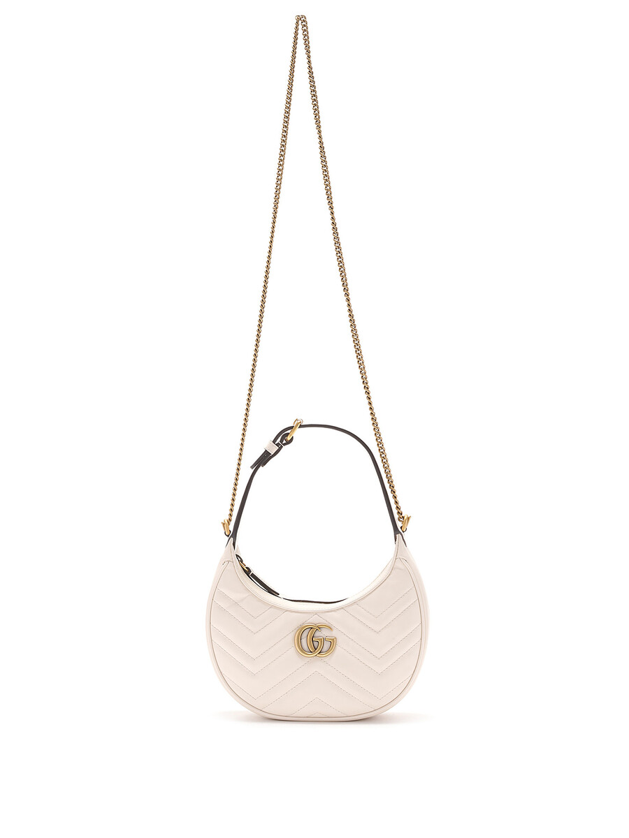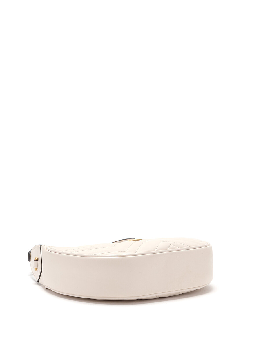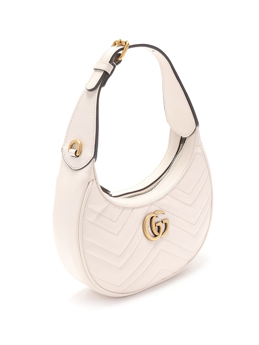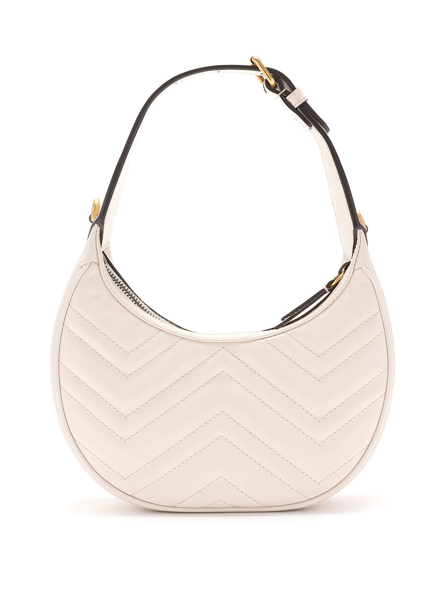 Ivory leather half-moon bag featuring a quilted chevron pattern. Zip closure. Adjustable strap. Removable chain shoulder strap. Antique gold-tone metal hardware. With dust bag.
