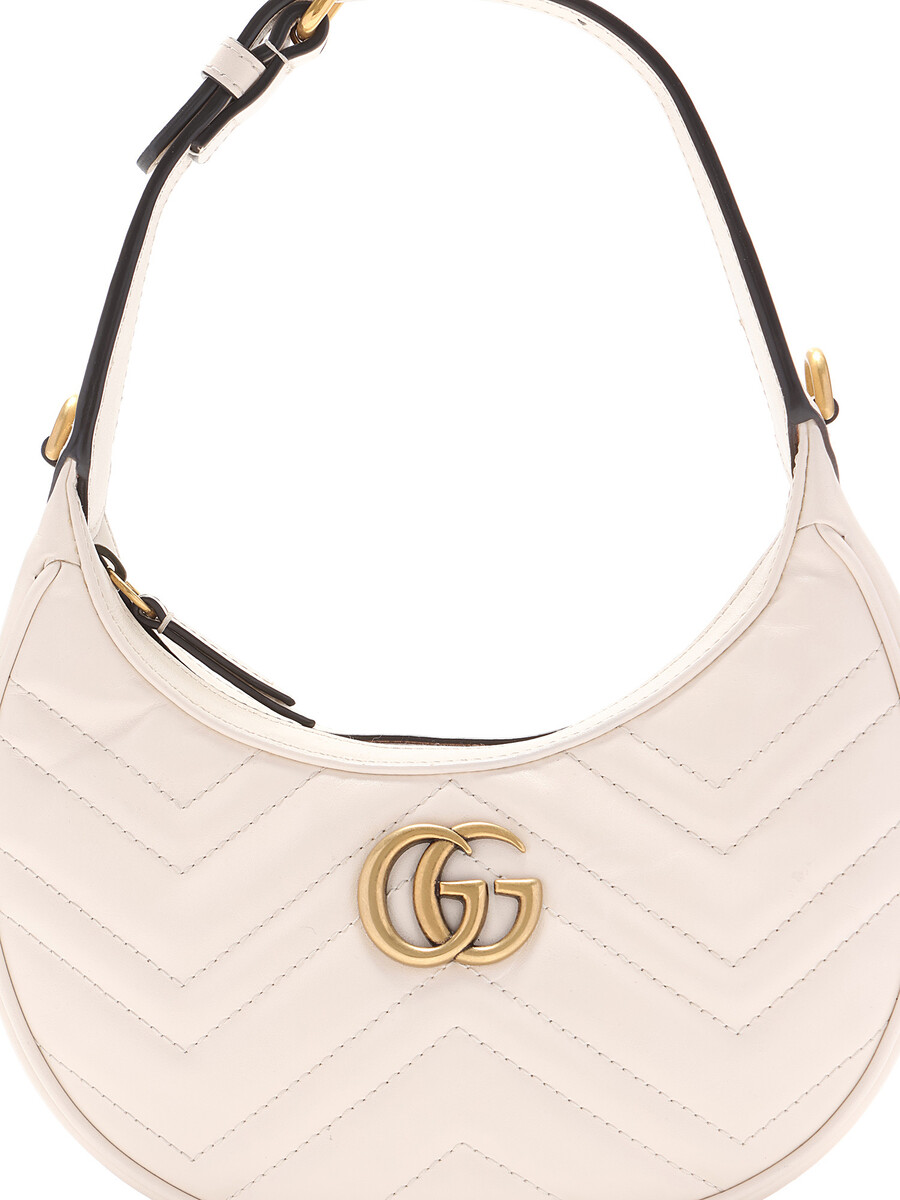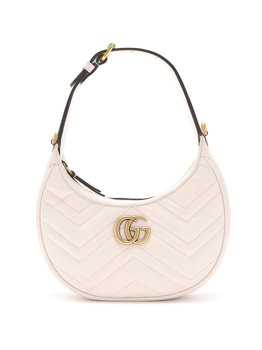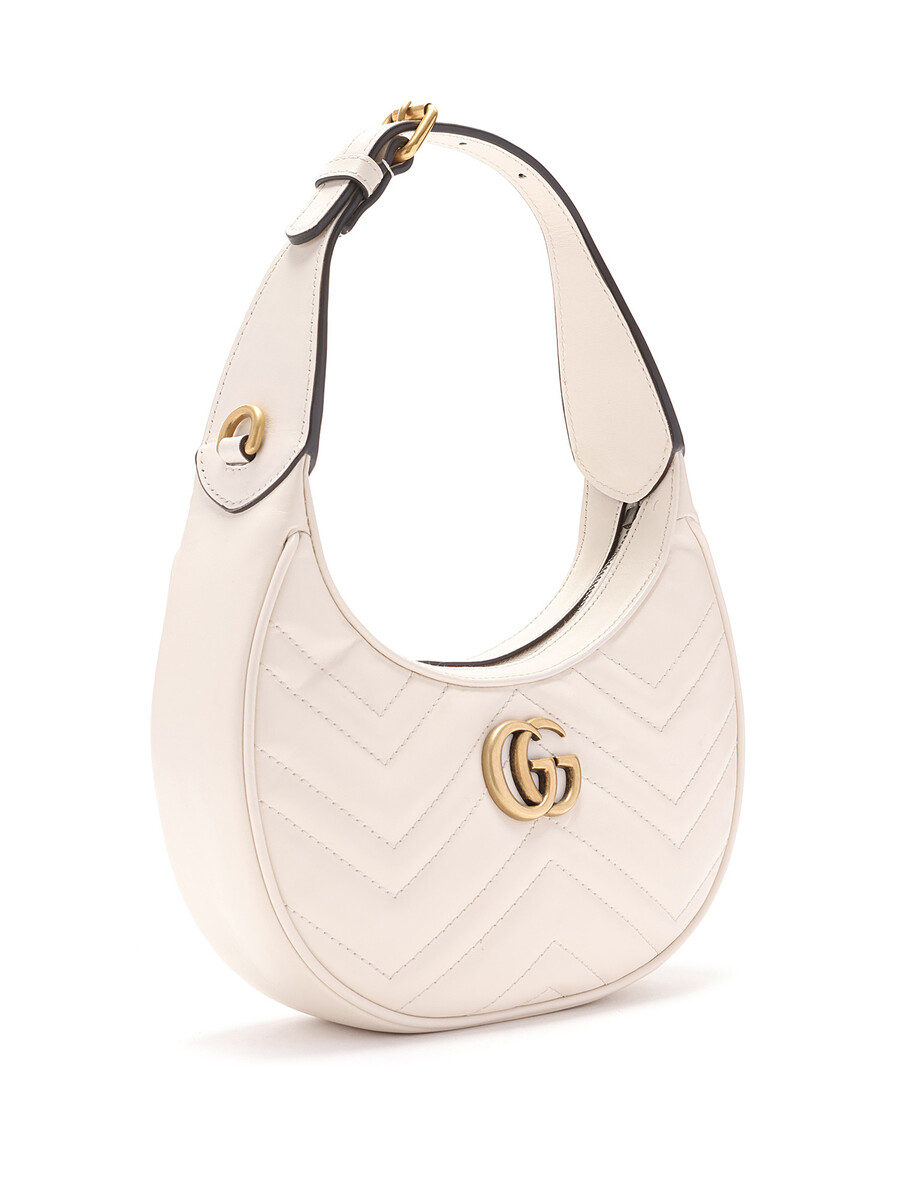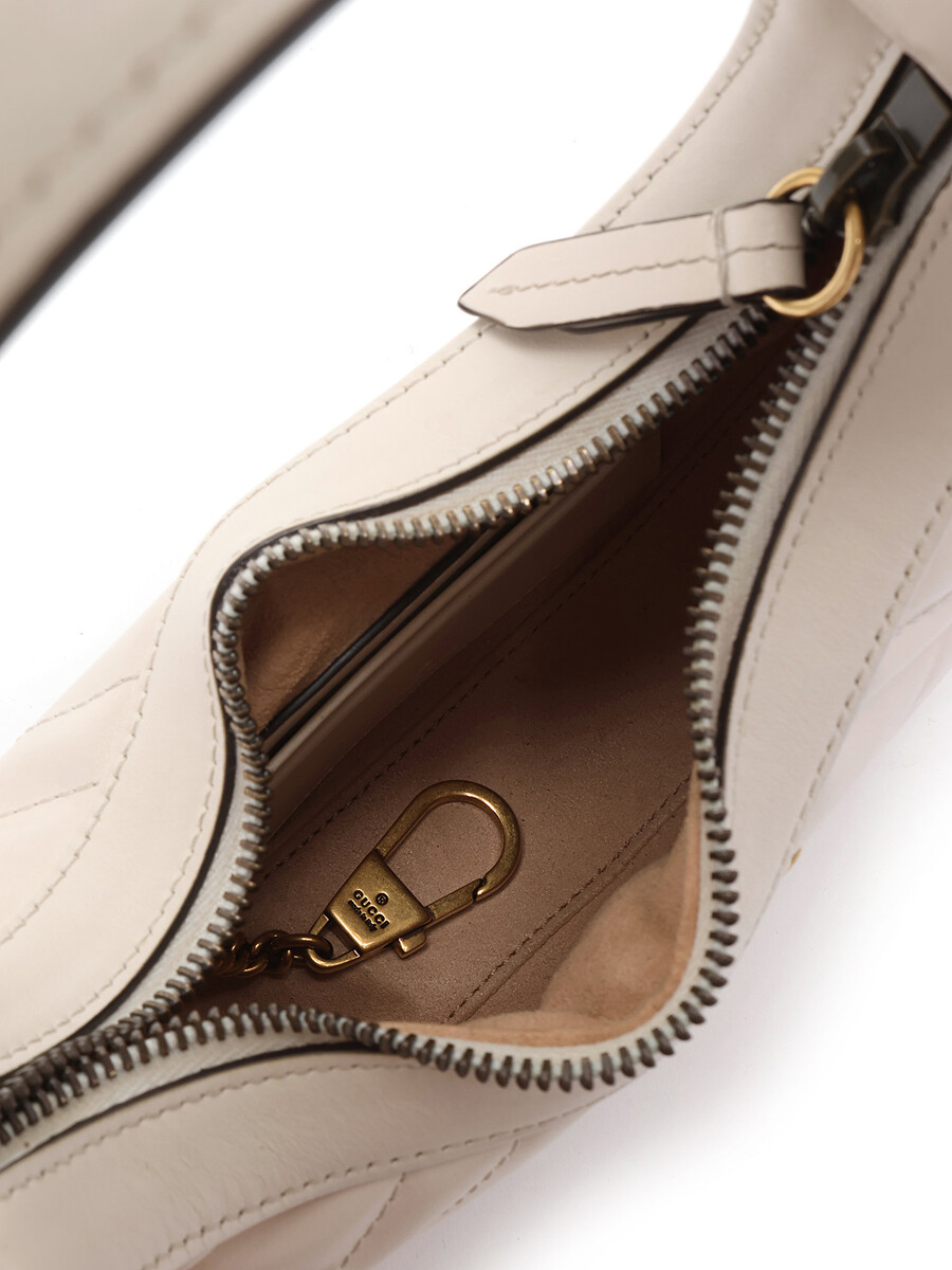 Ivory leather half-moon bag featuring a quilted chevron pattern. Zip closure. Adjustable strap. Removable chain shoulder strap. Antique gold-tone metal hardware. With dust bag.