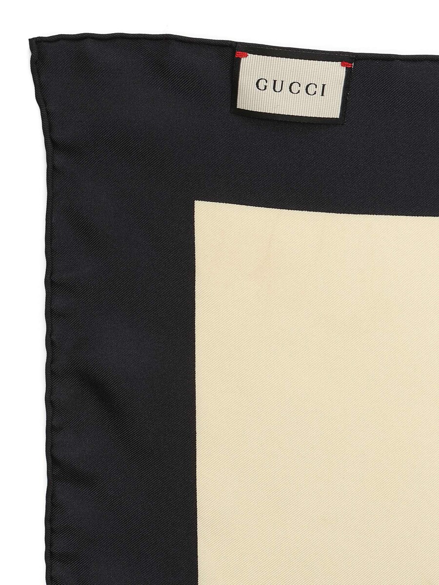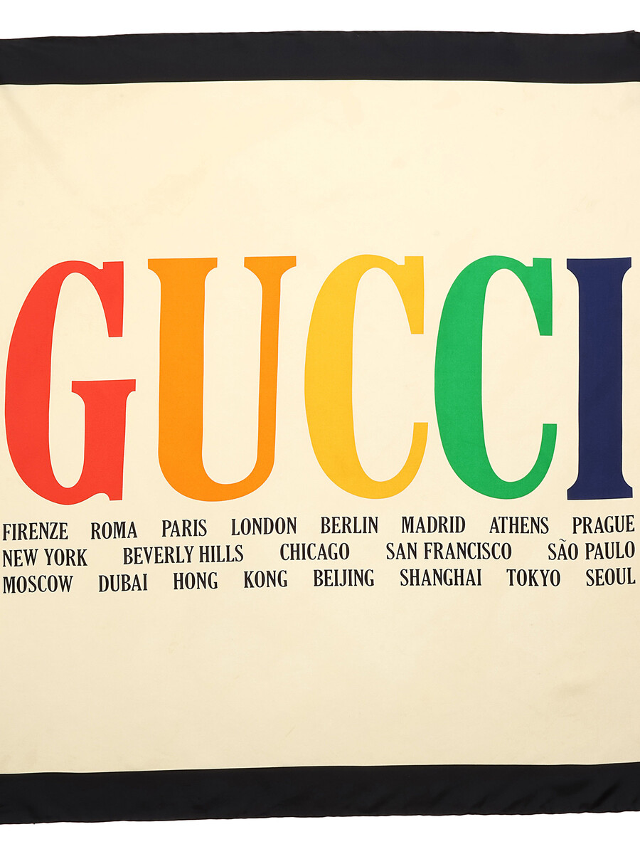Square scarf with a multicolored Gucci logo pattern and city names on a white background. Black border.