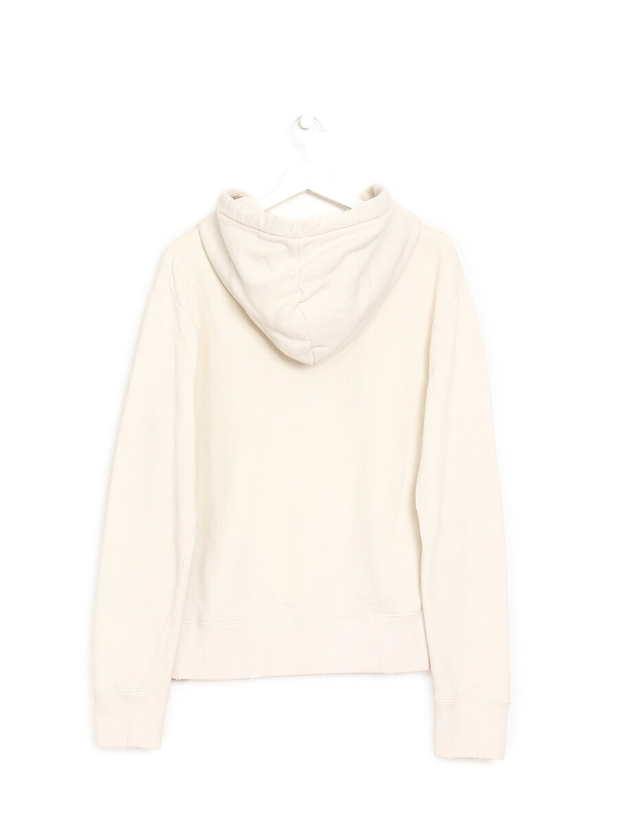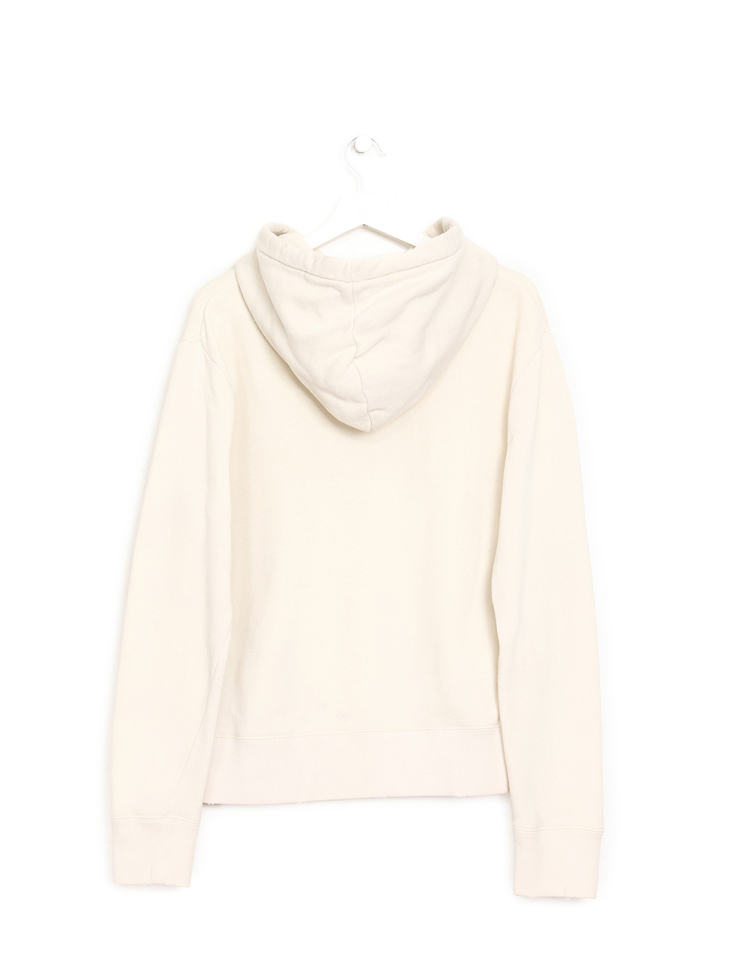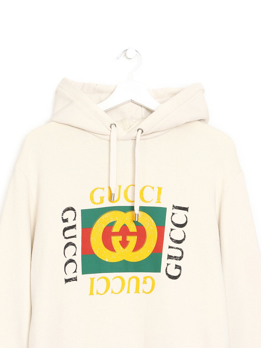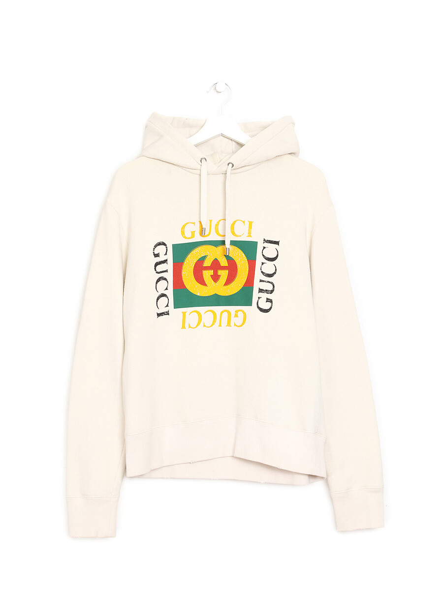 Cream graphic logo hoodie featuring Gucci logo design on front. Distressed details at hems adding a rugged touch. Attached hood with drawstrings. Long sleeves. Ribbed cuffs and hem.