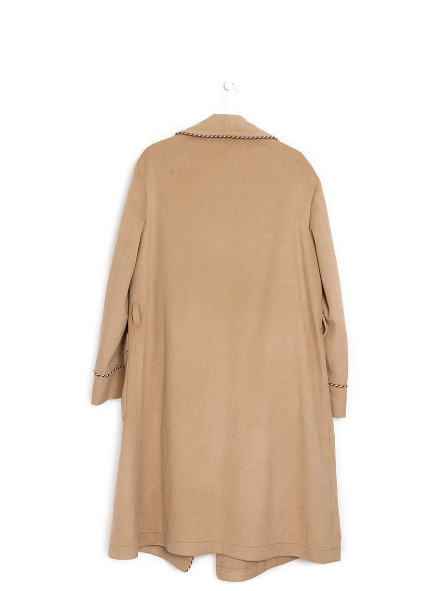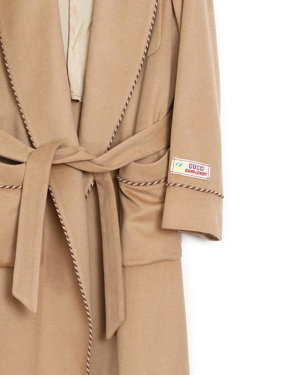 Long-sleeved cashmere coat in soft black. Features a tie-front closure and shawl collar. Fully lined with viscose for smooth layering.