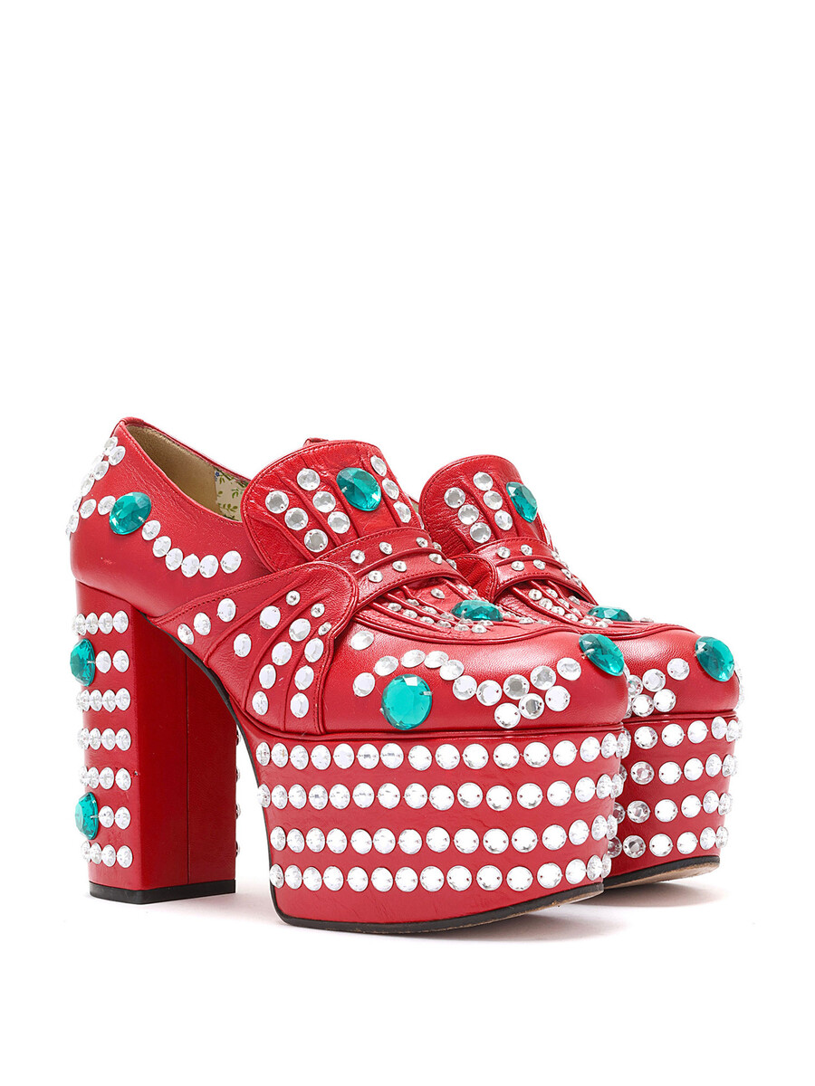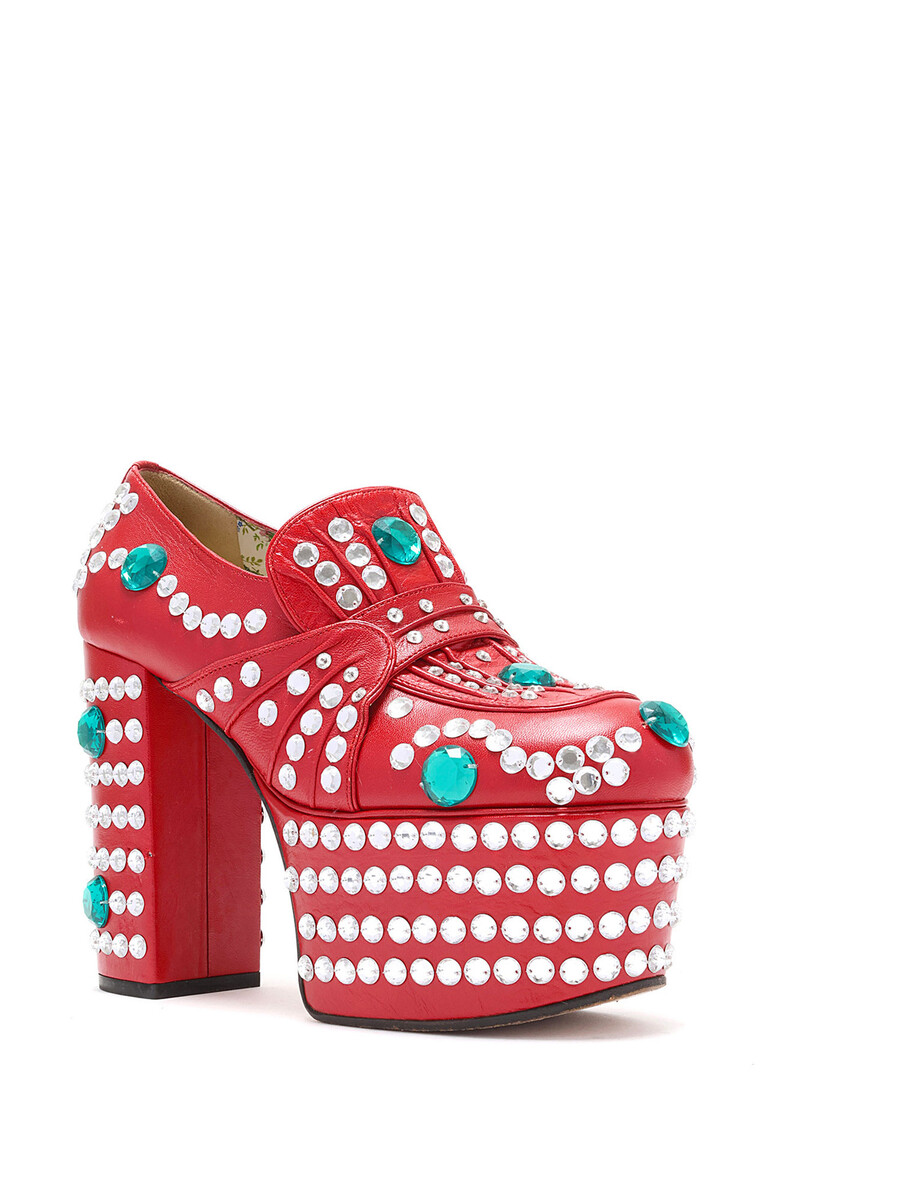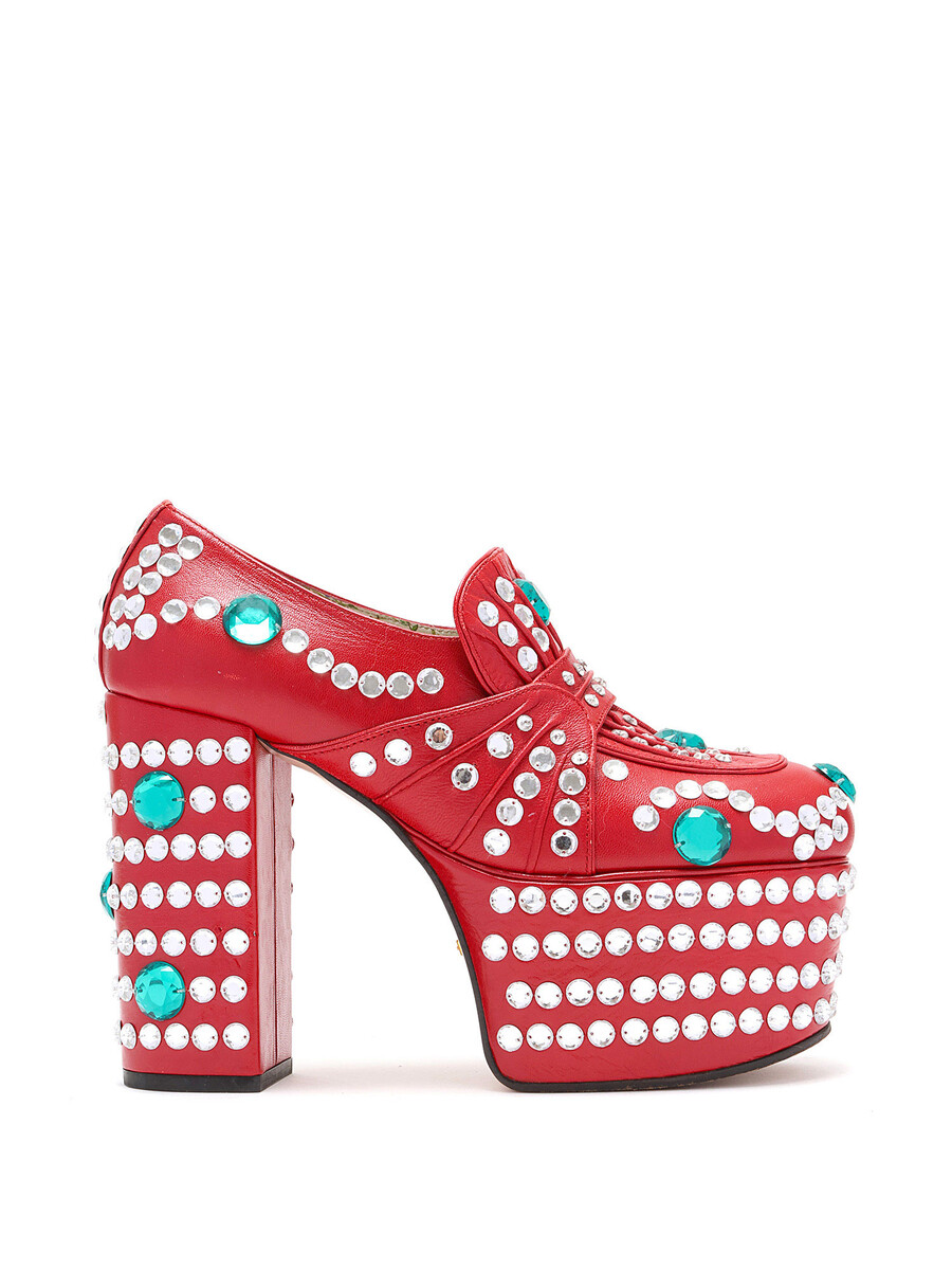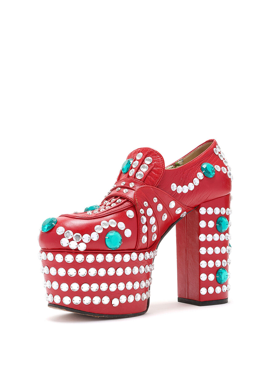 Crystal-embellished red platform loafers with white and green accents. Round toe silhouette. Slip-on style. Leather soles.