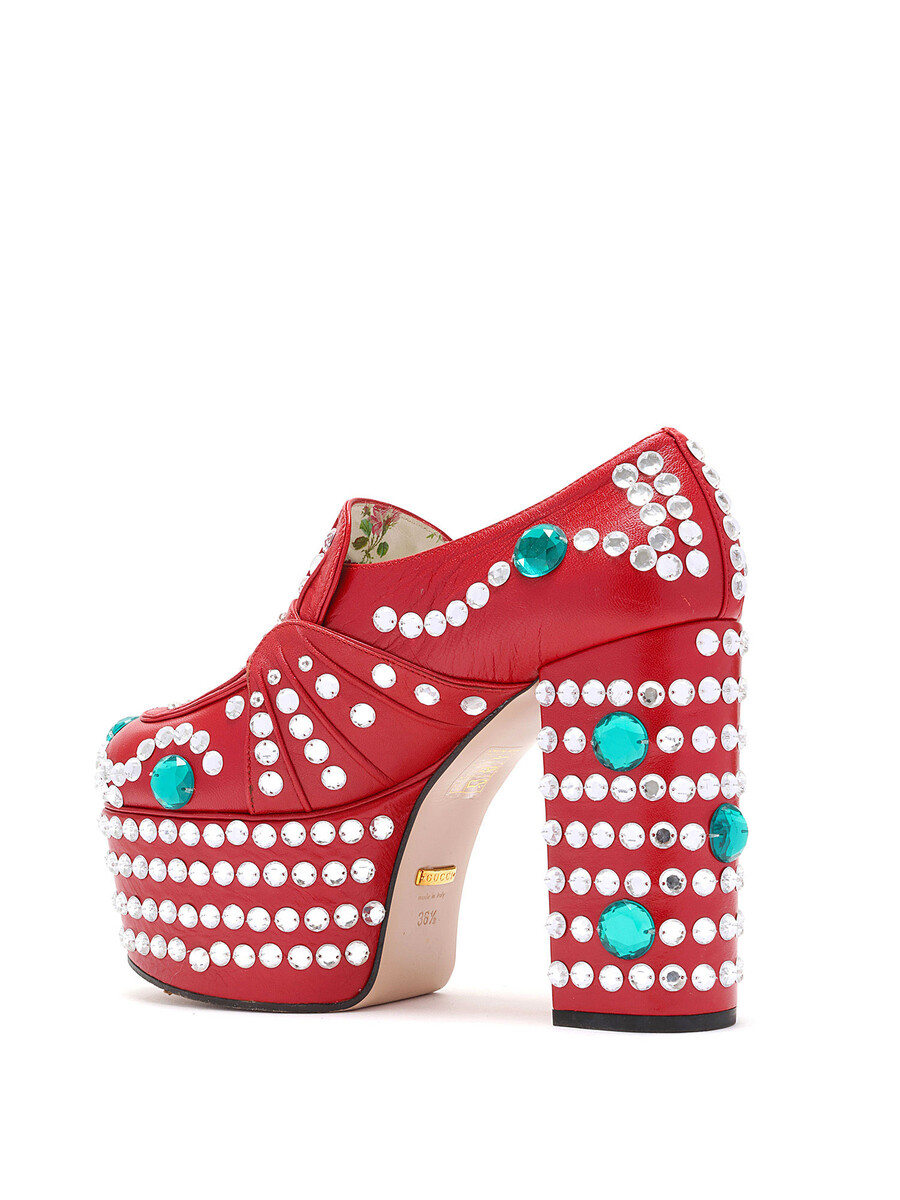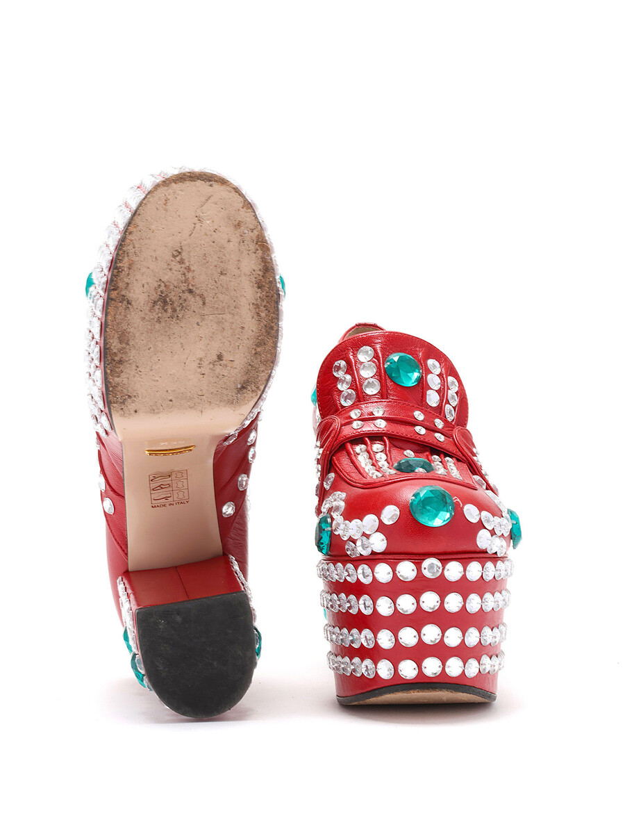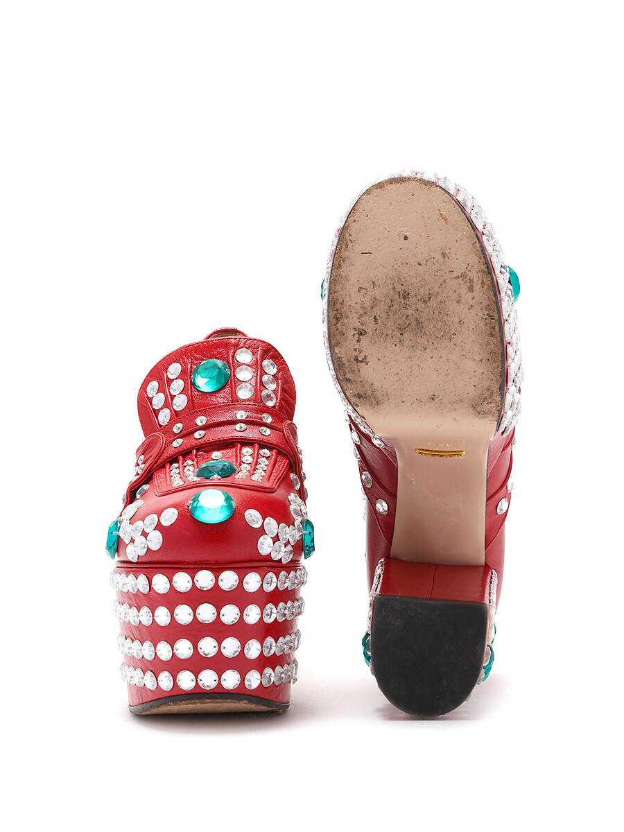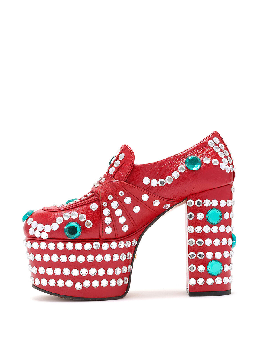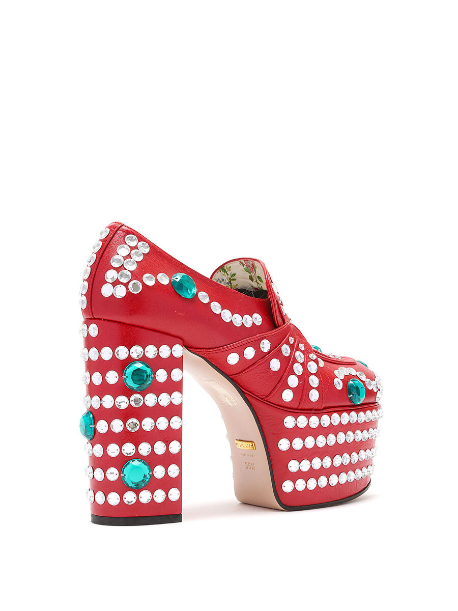 Crystal-embellished red platform loafers with white and green accents. Round toe silhouette. Slip-on style. Leather soles.