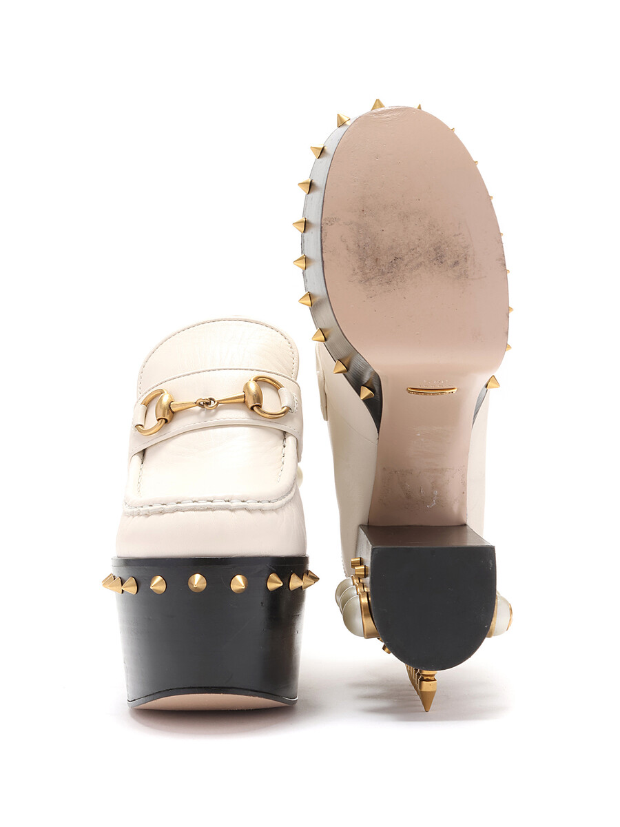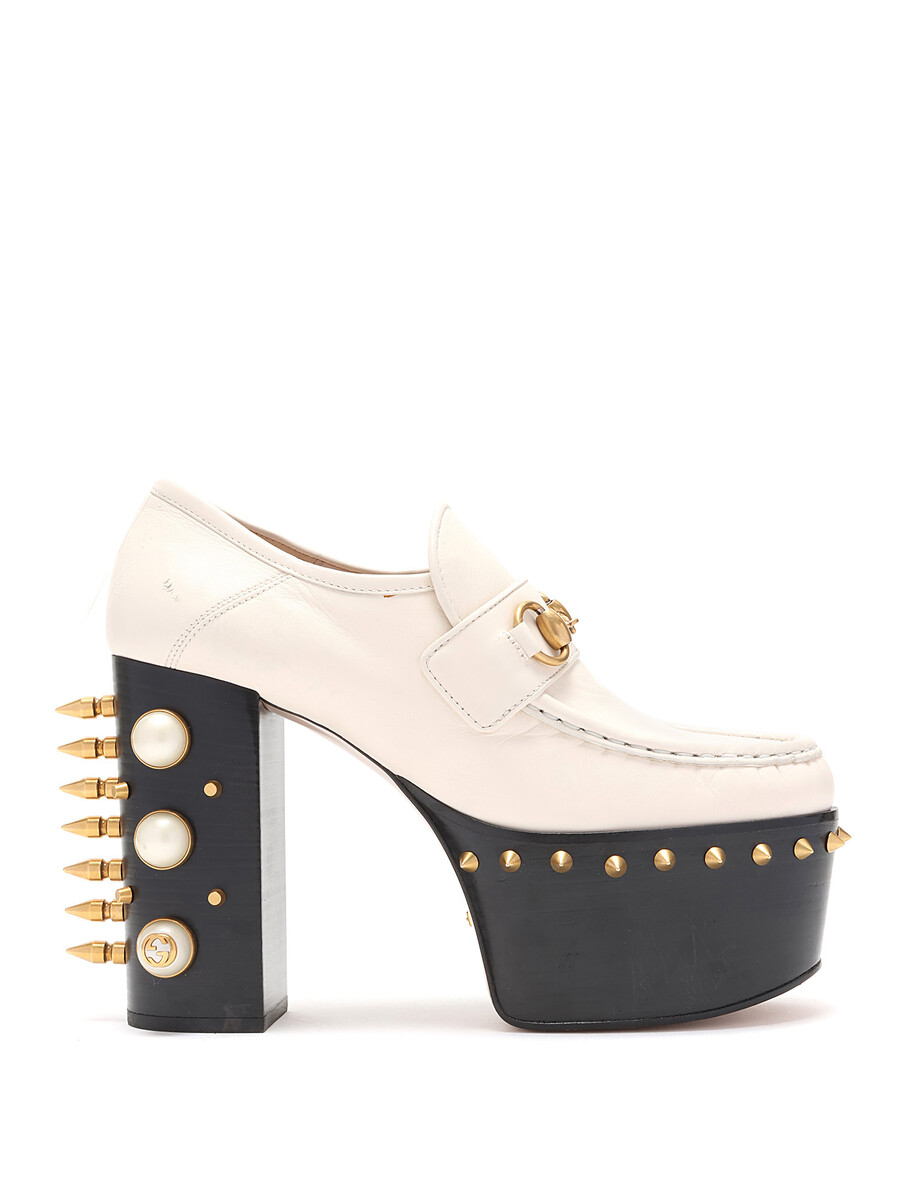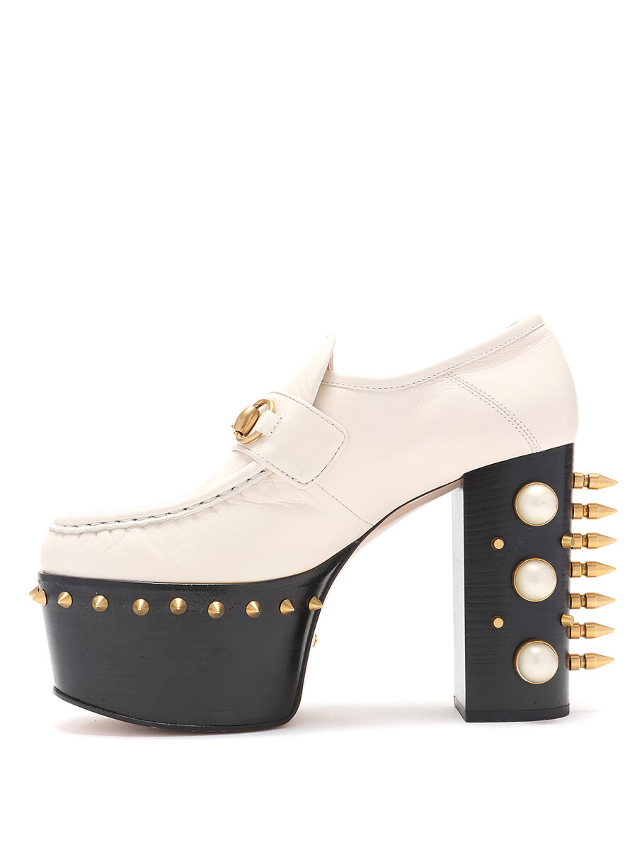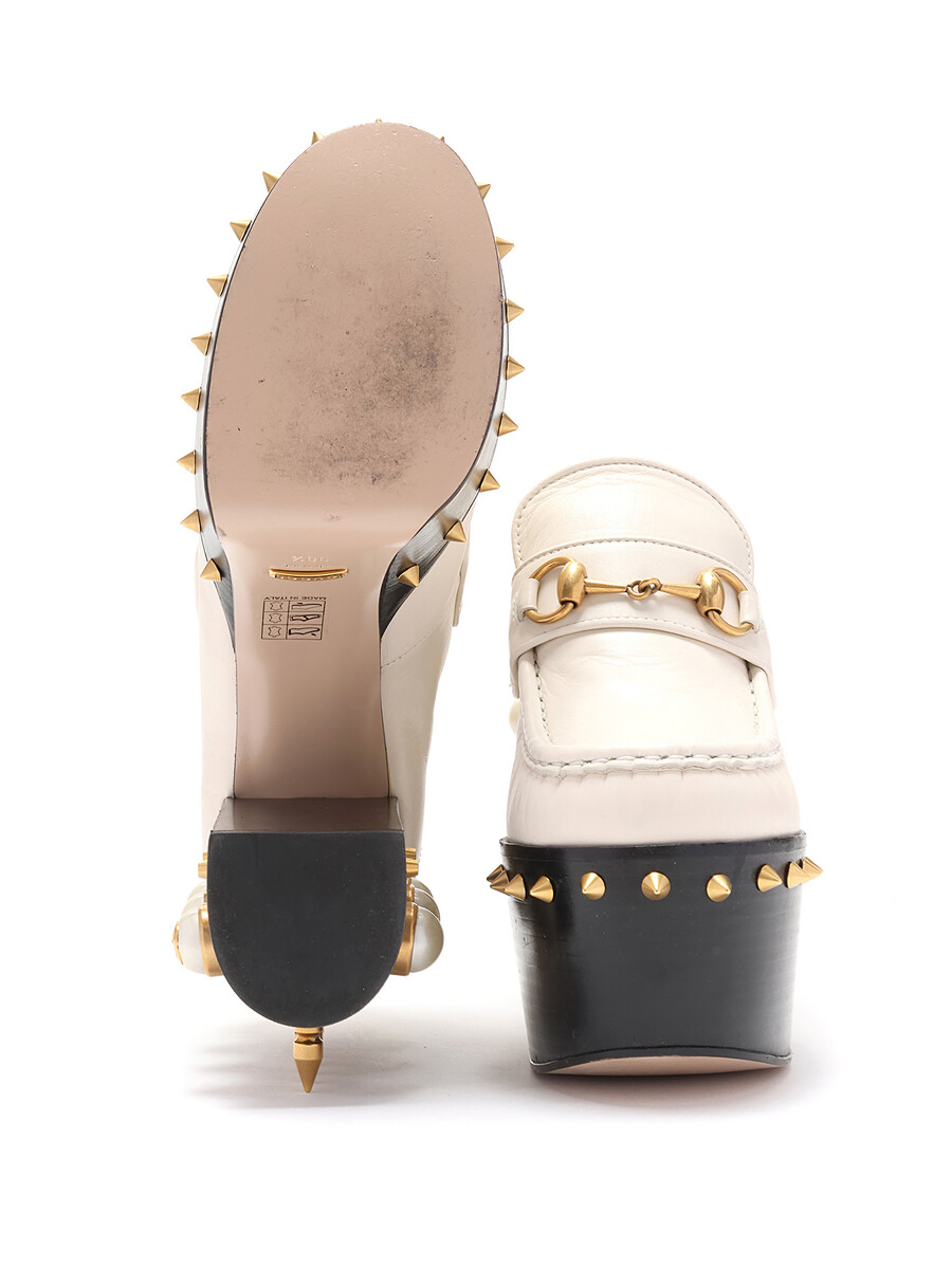 White leather platform loafers adorned with gold-tone metal studded details and pearl accents. Slip-on style with Horsebit detail at the toe. Round-toe silhouette. Layered wooden sole.