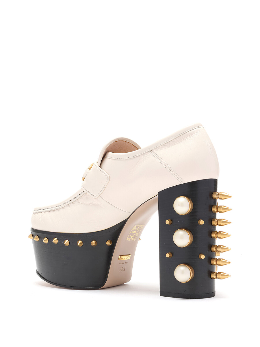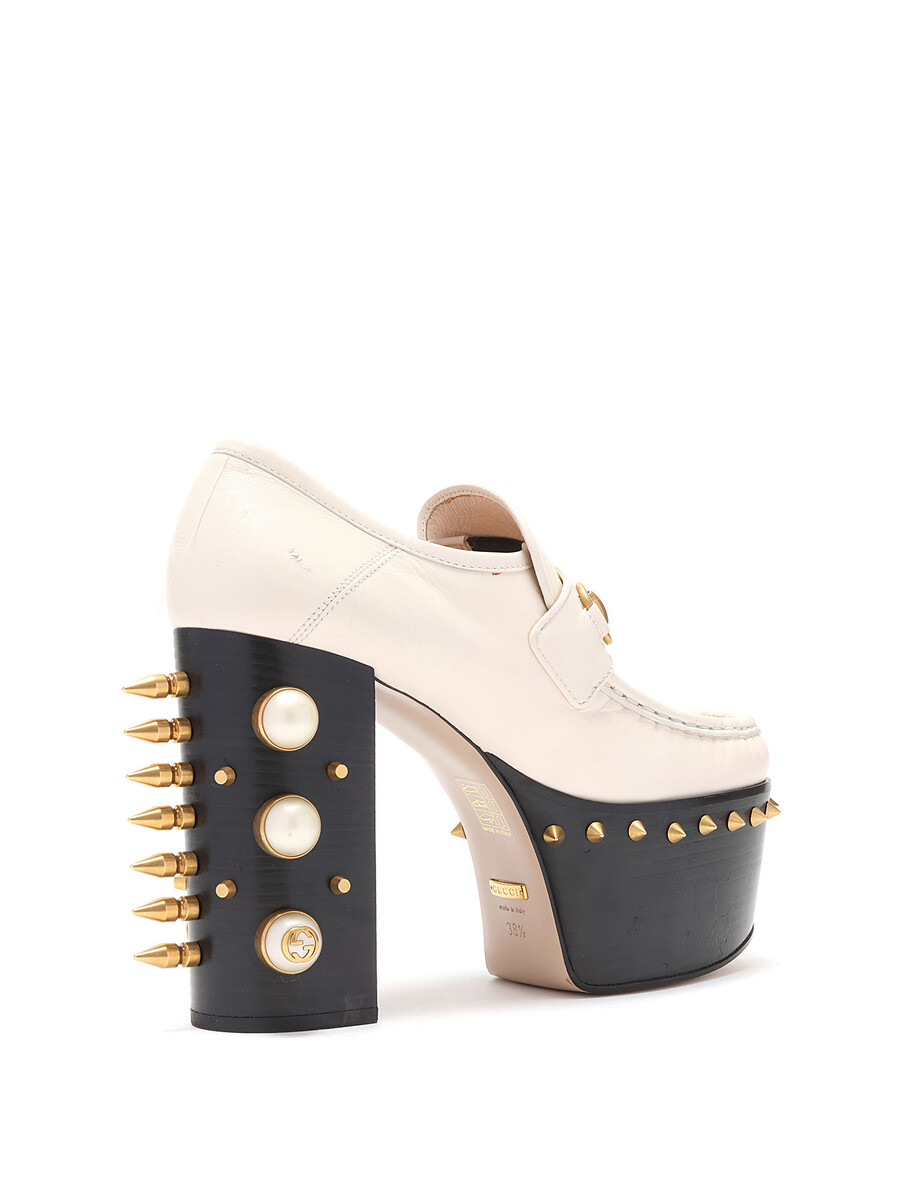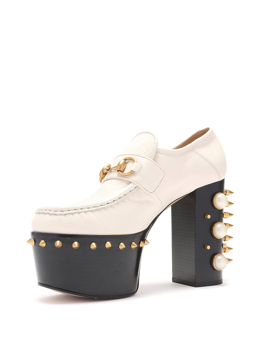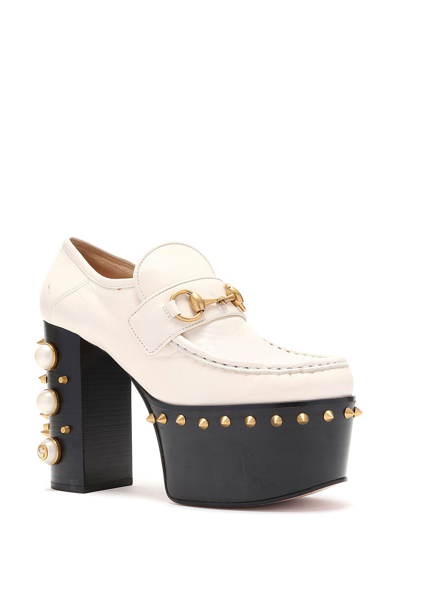 White leather platform loafers adorned with gold-tone metal studded details and pearl accents. Slip-on style with Horsebit detail at the toe. Round-toe silhouette. Layered wooden sole.