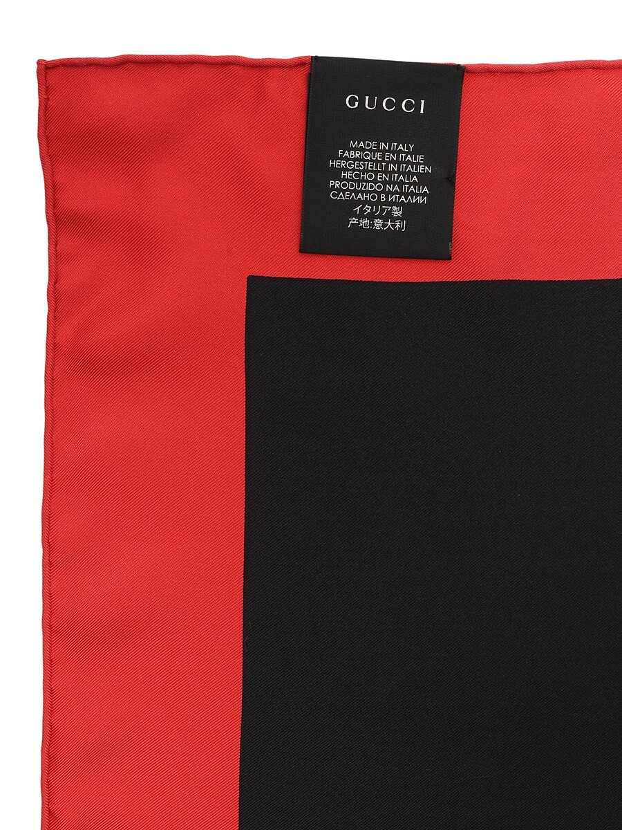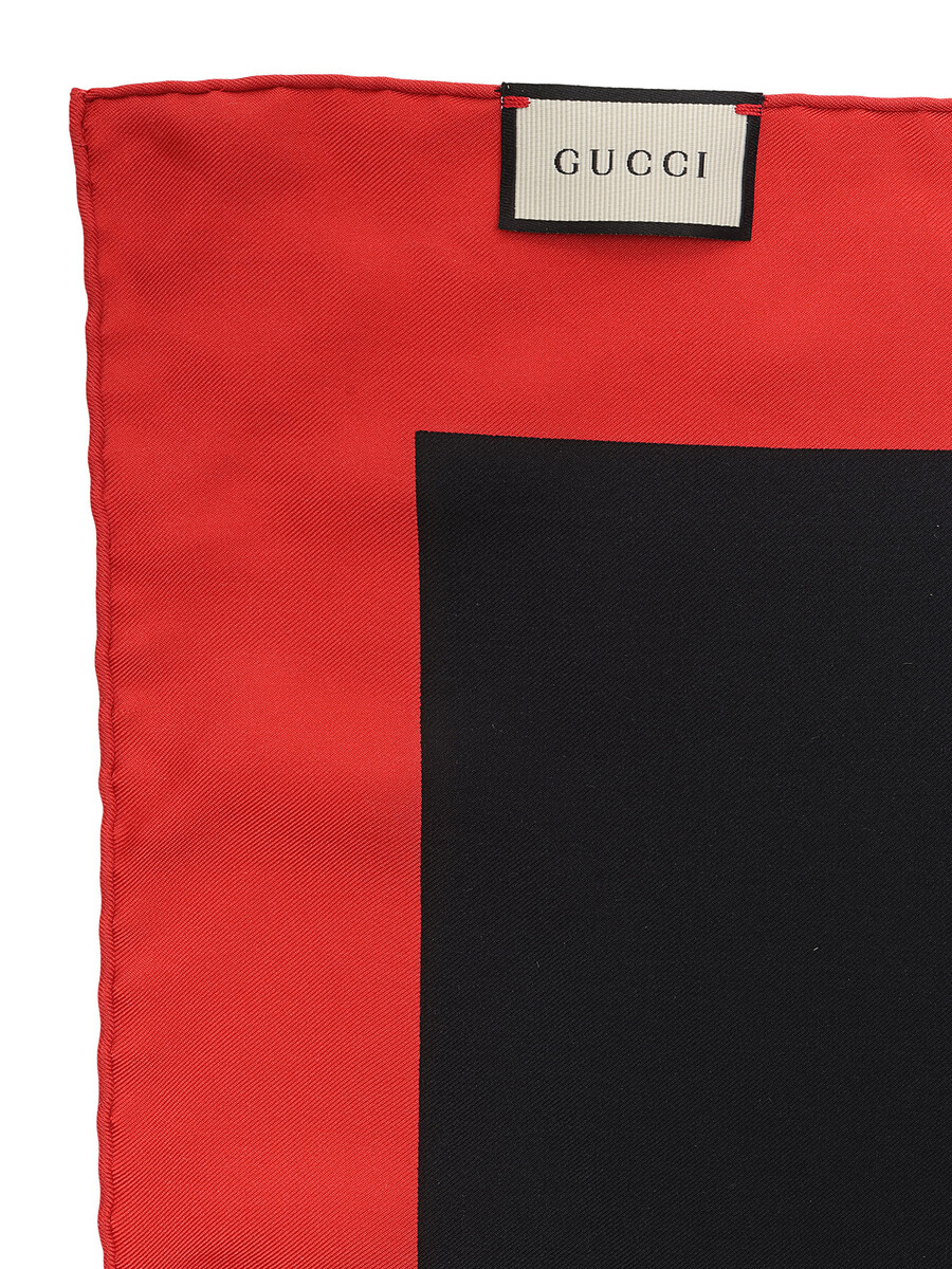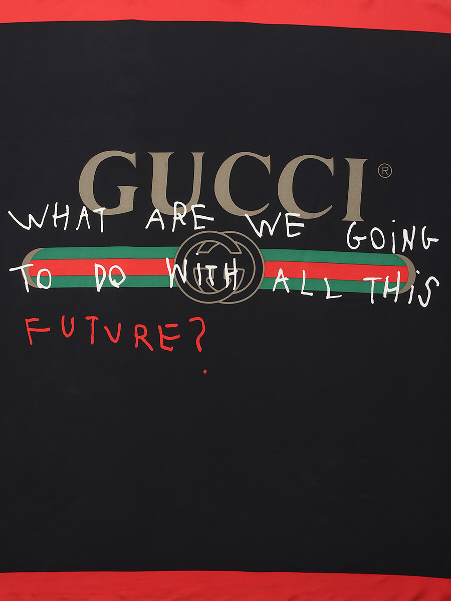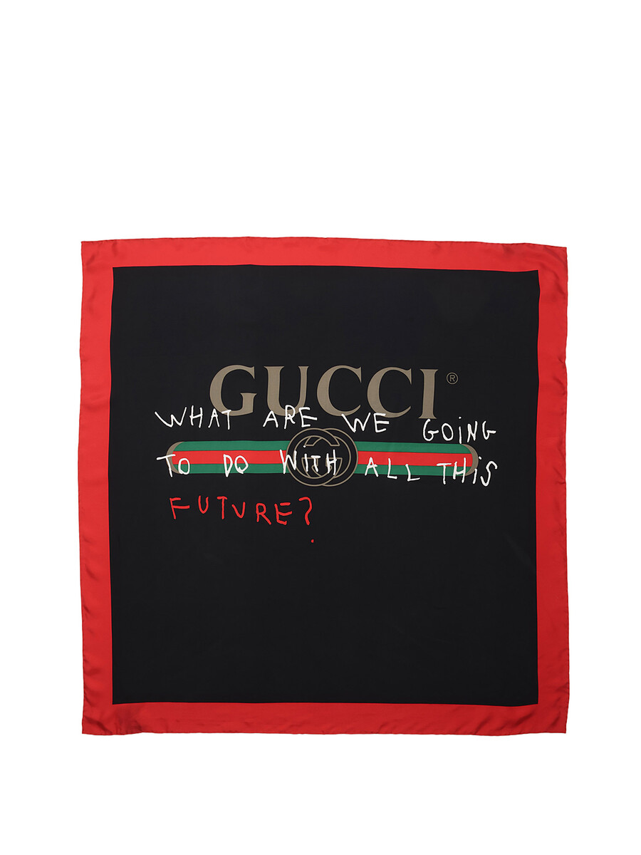 Square silk twill scarf featuring 'Future' graphic and logo in tones of black, red, beige and green. Hand-rolled edges.