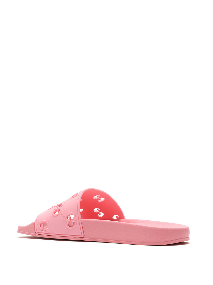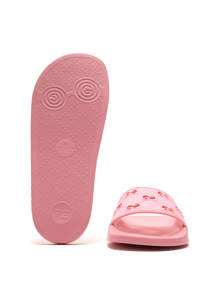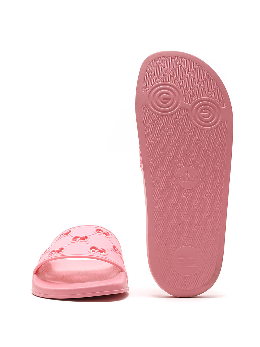 Rubber slip-on sandals in pink with embossed logo detail. Open toe design. Rubber sole. With box.
