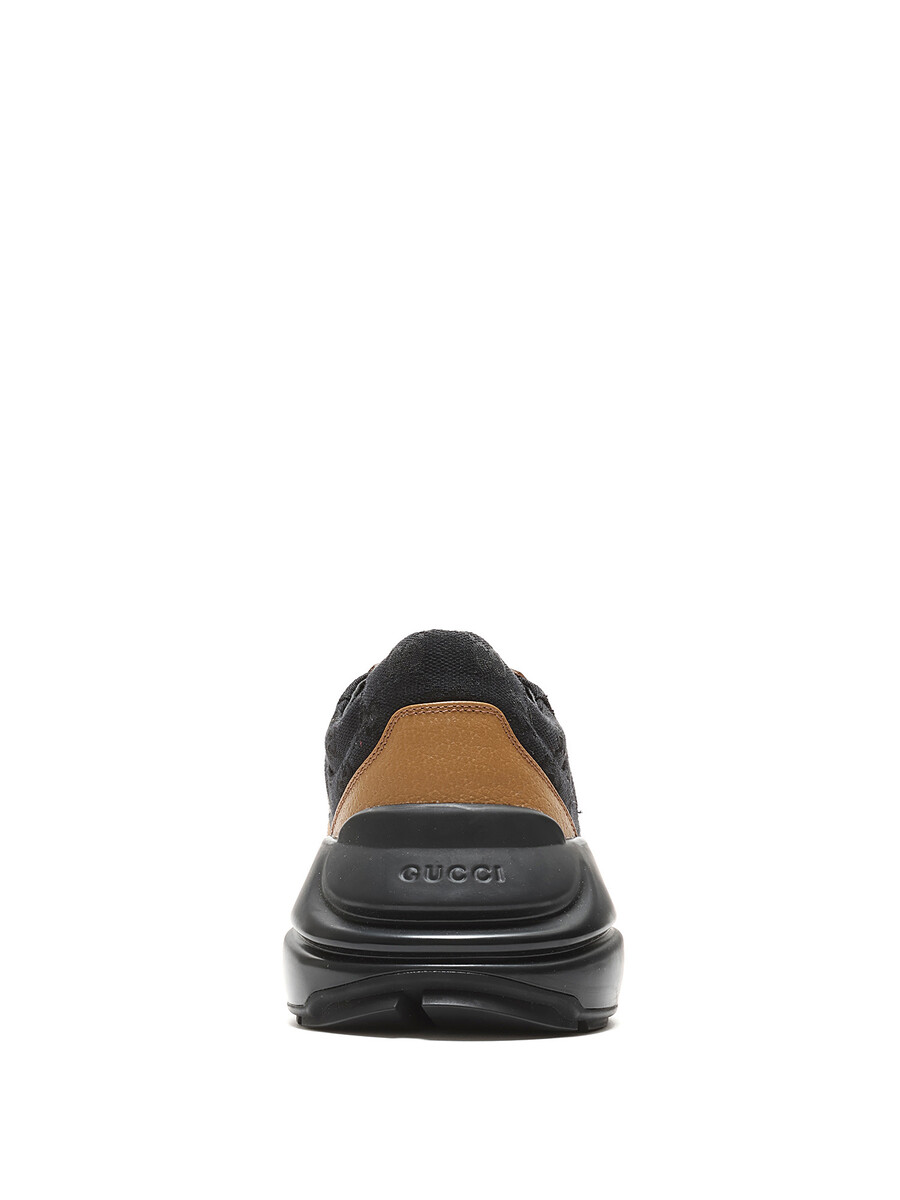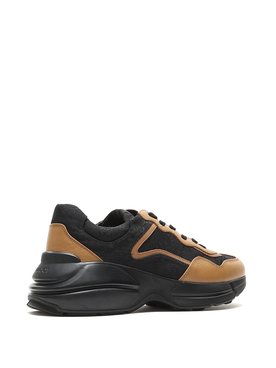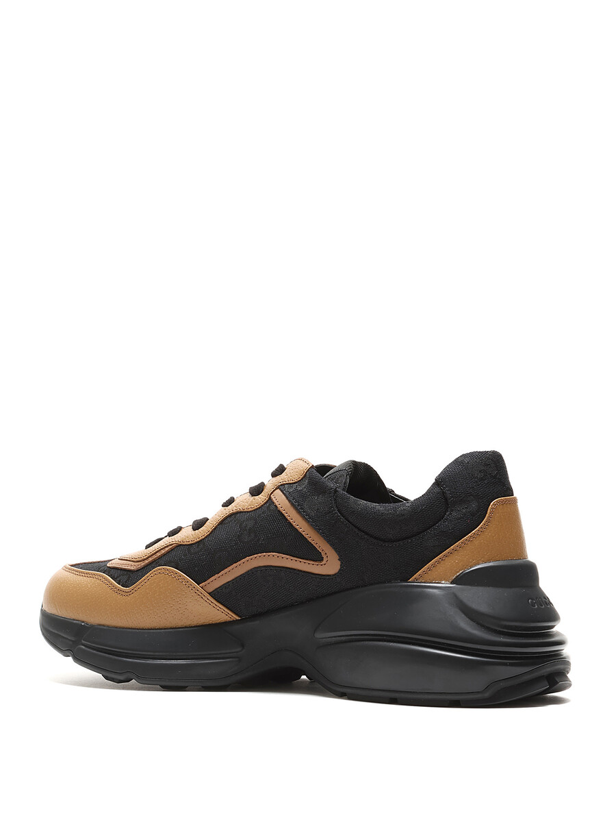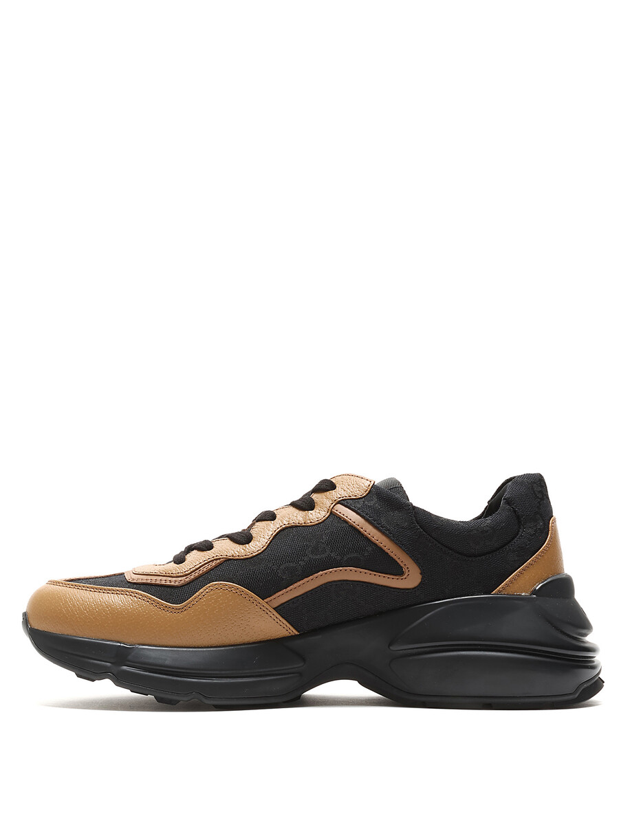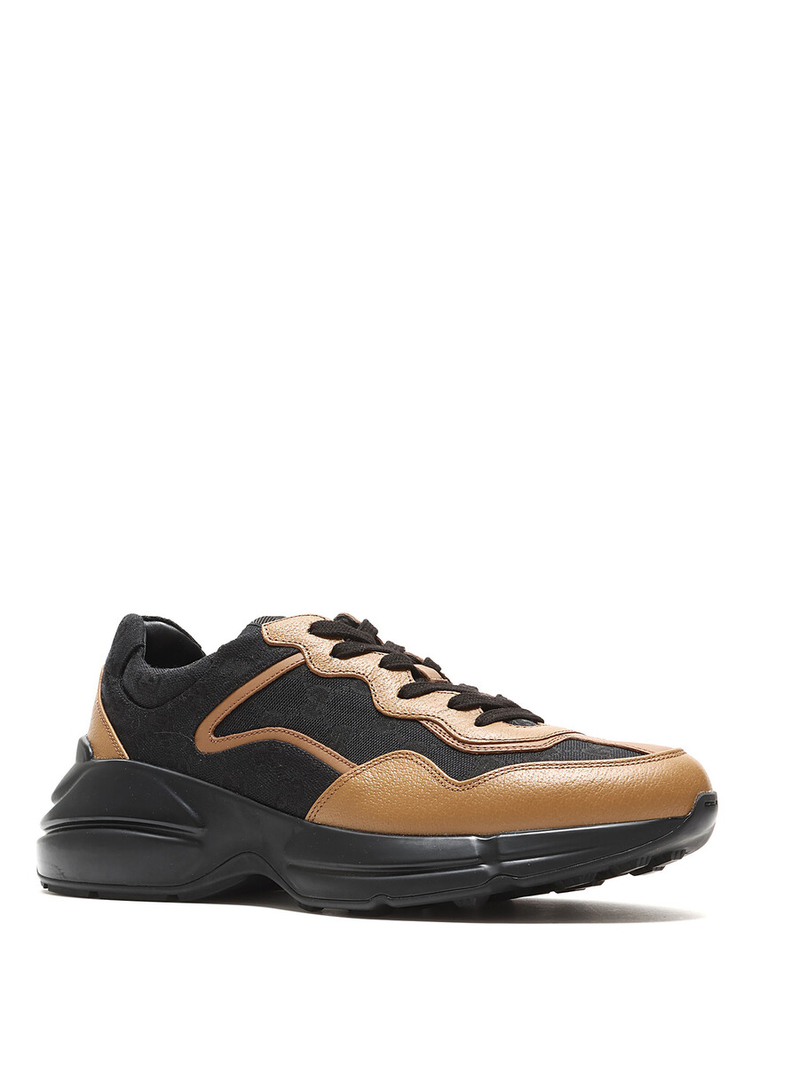 Color-blocked low top sneakers in black and tan, combining leather and fabric for a dynamic look. Contrast leather panels and a lace-up closure highlight the design. Rounded closed toe and rubber sole.