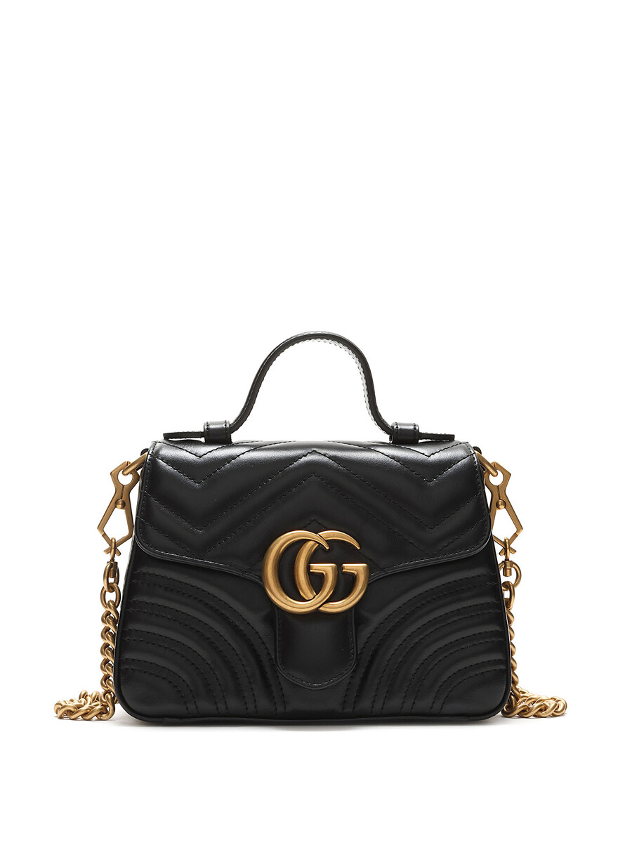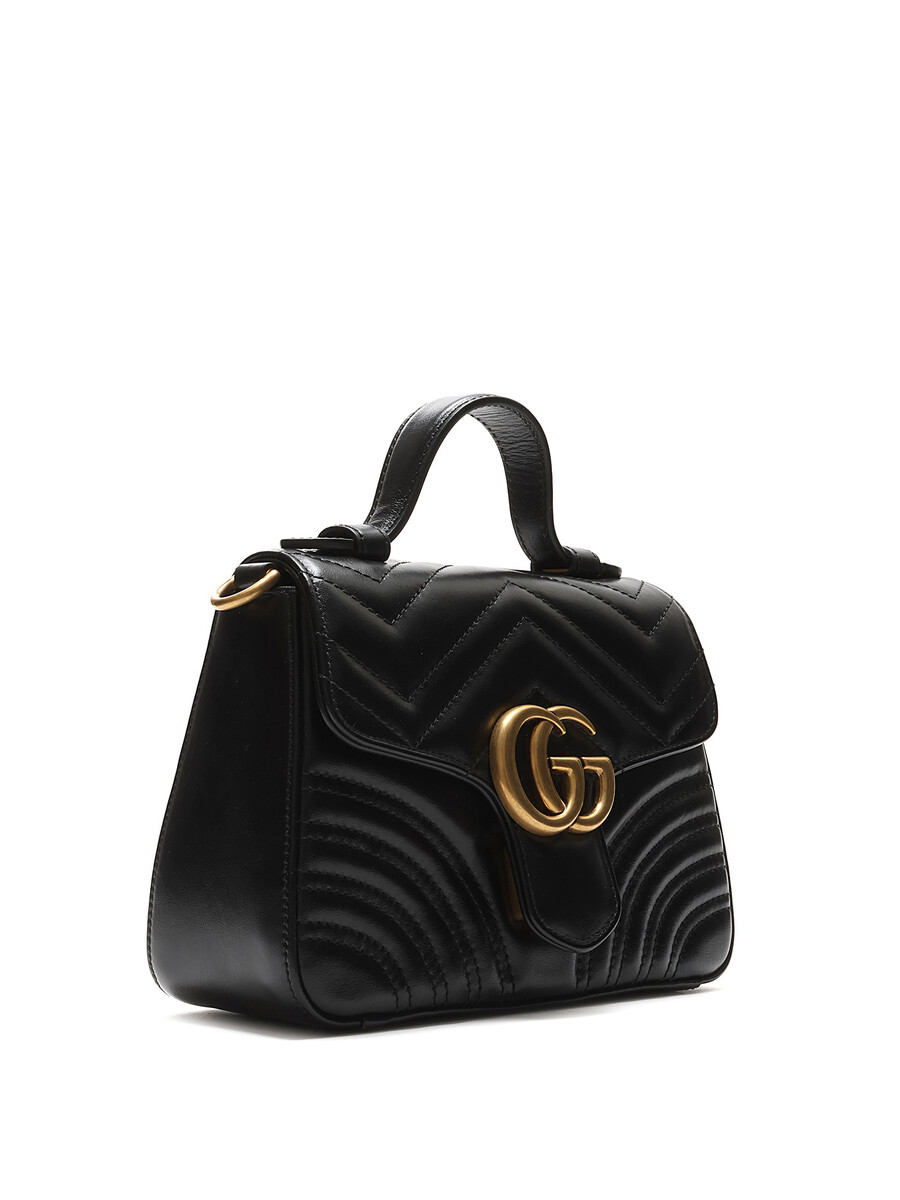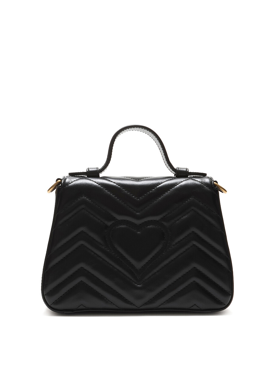 Small GG Marmont top handle bag in quilted chevron-pattern leather in black. Flap top with press-lock closure. Detachable chain and leather shoulder strap. Gold-tone hardware.