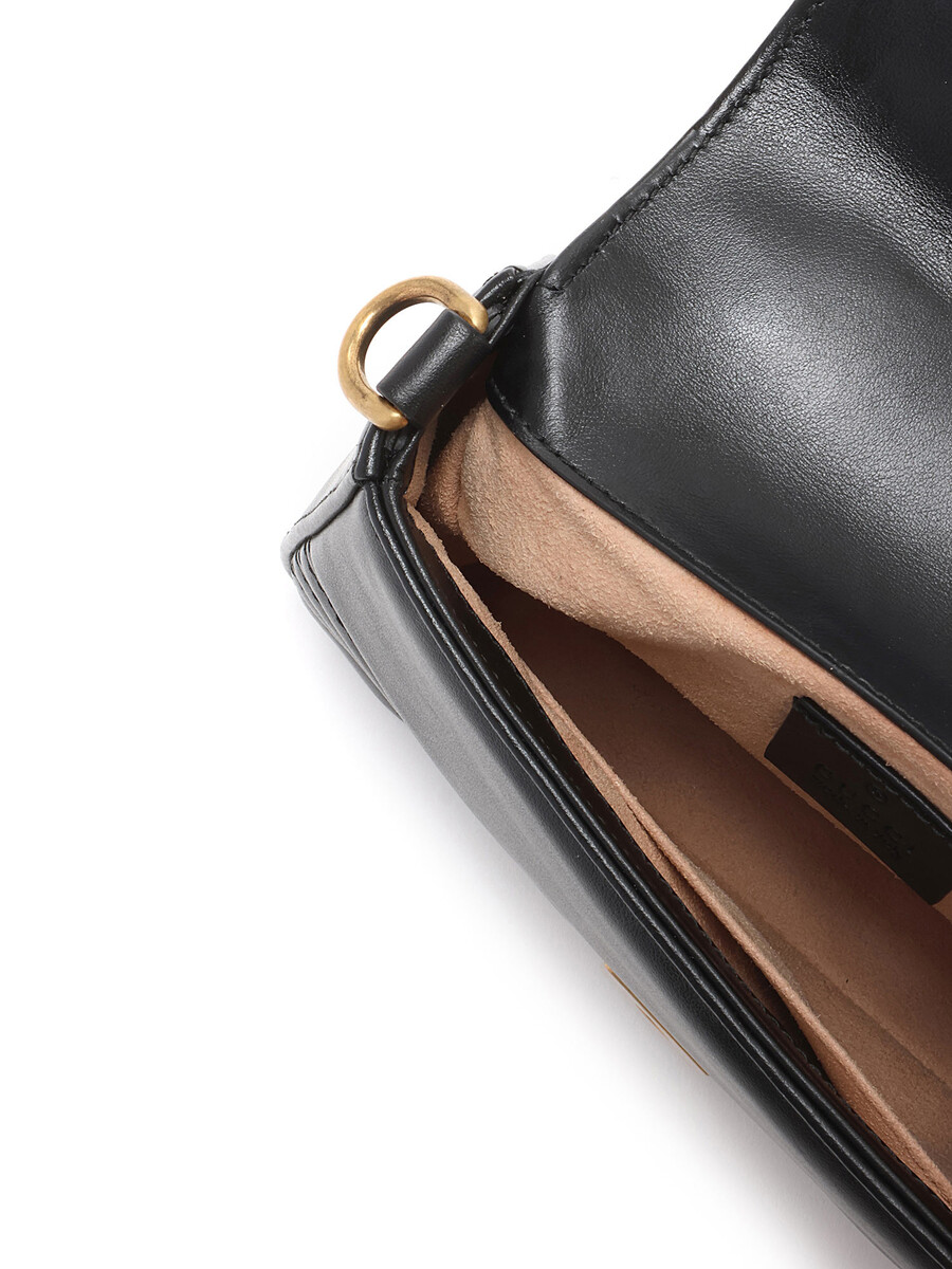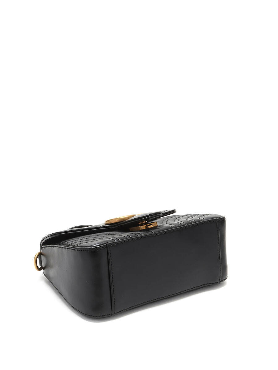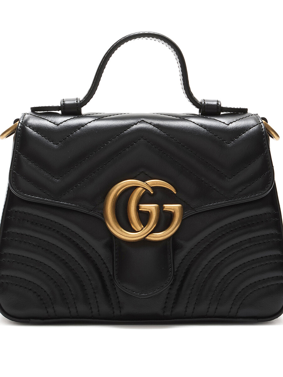 Small GG Marmont top handle bag in quilted chevron-pattern leather in black. Flap top with press-lock closure. Detachable chain and leather shoulder strap. Gold-tone hardware.