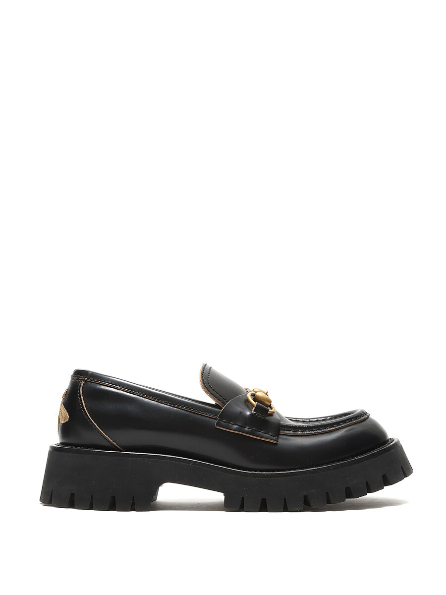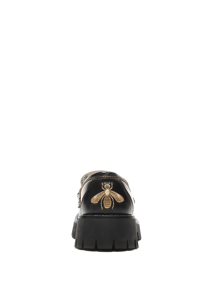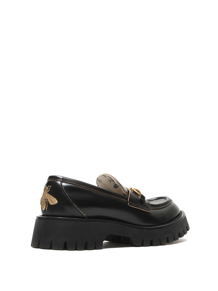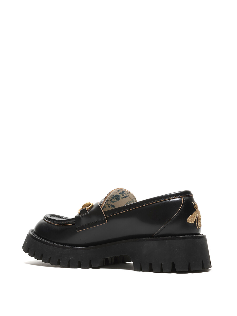 Leather loafers with brass horsebit detail and gold bee pattern at the heel. Slip-on style with round toe. Rubber lug sole. Floral lining.