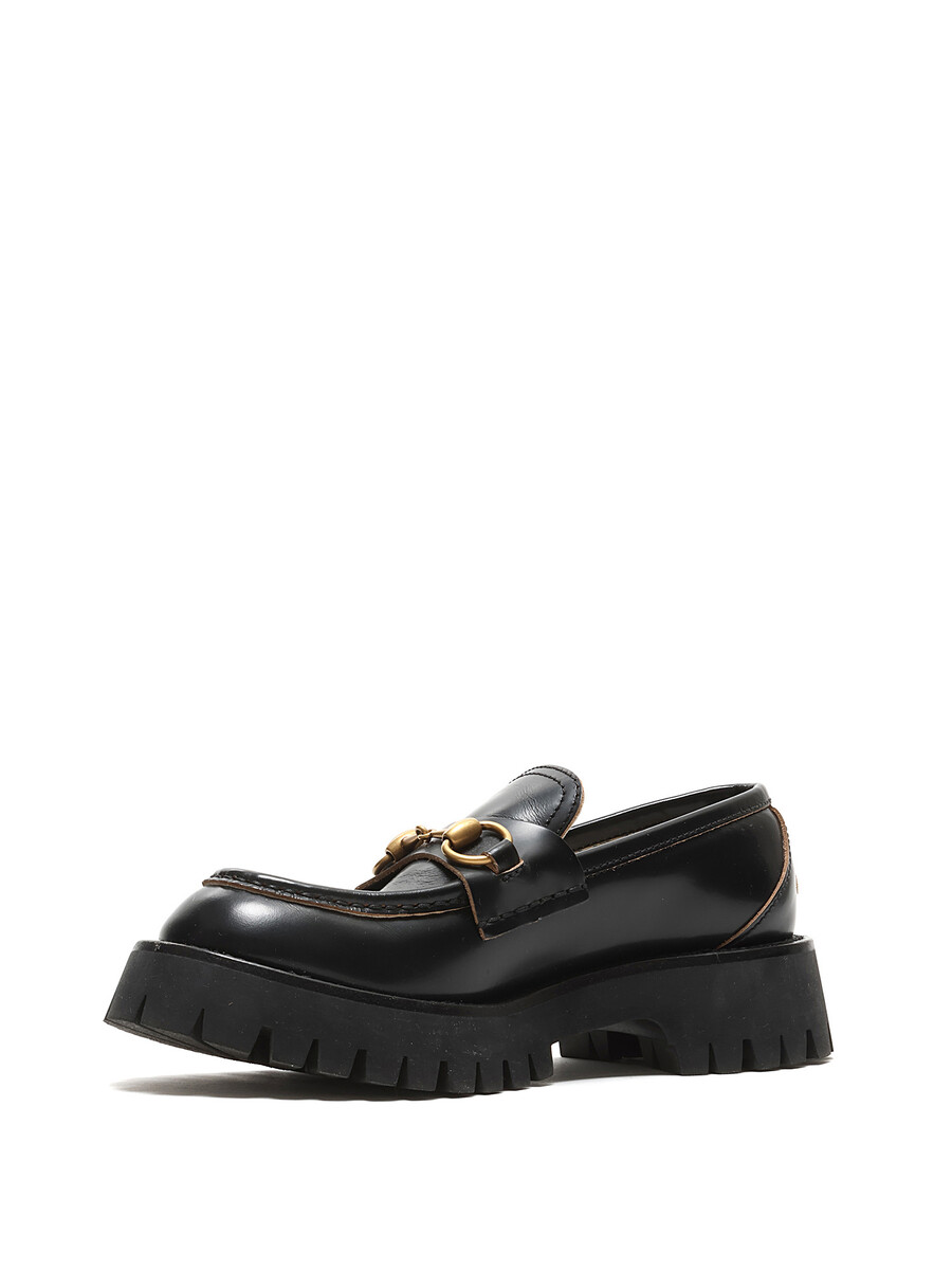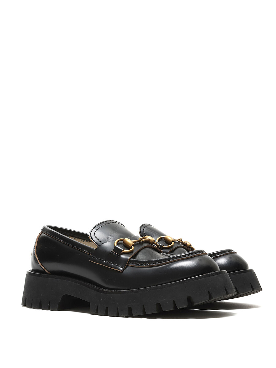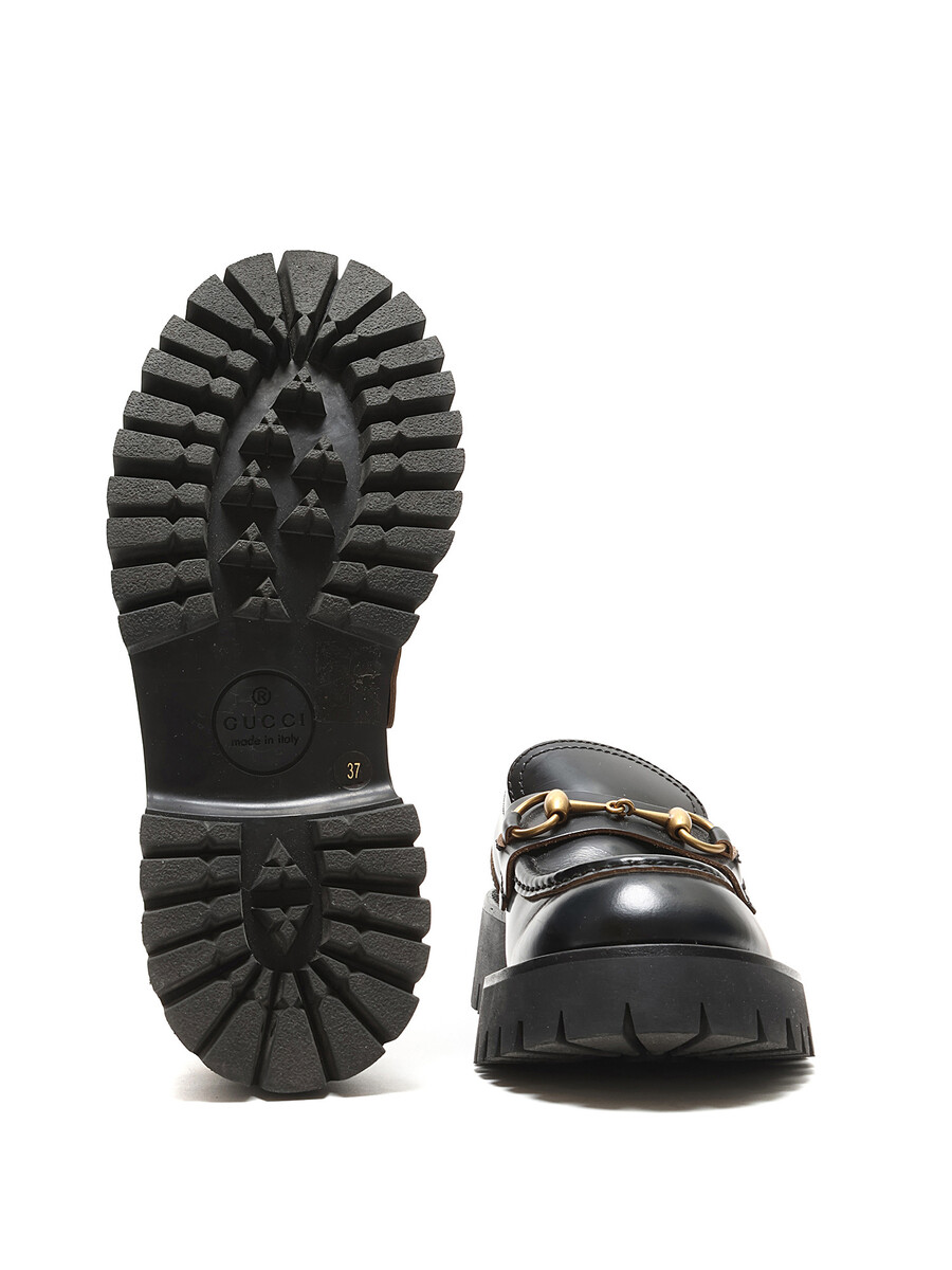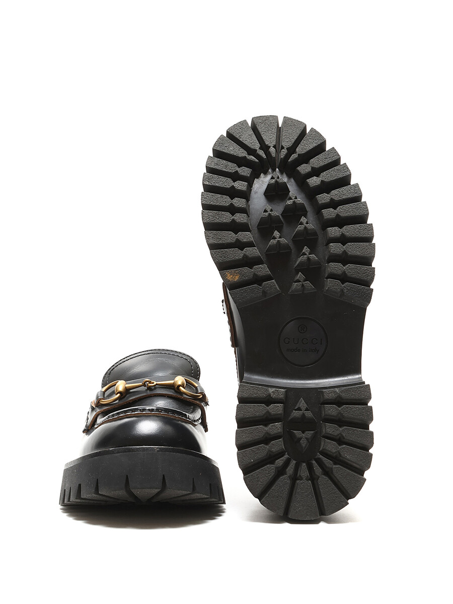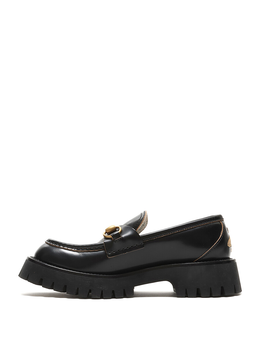 Leather loafers with brass horsebit detail and gold bee pattern at the heel. Slip-on style with round toe. Rubber lug sole. Floral lining.
