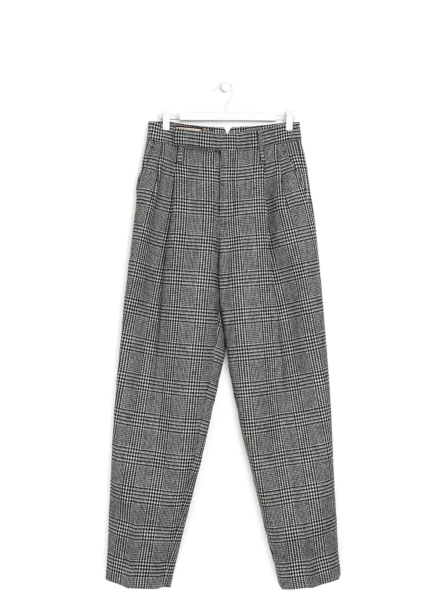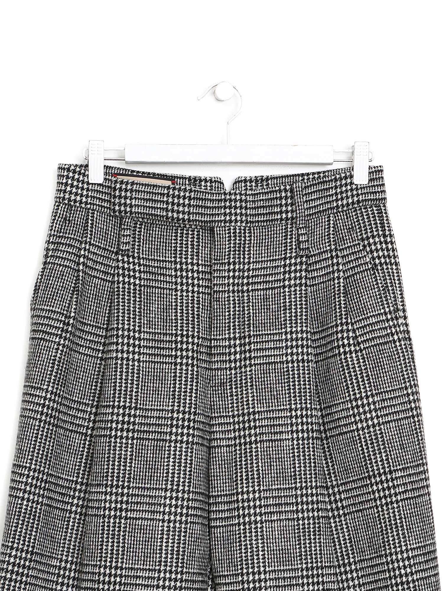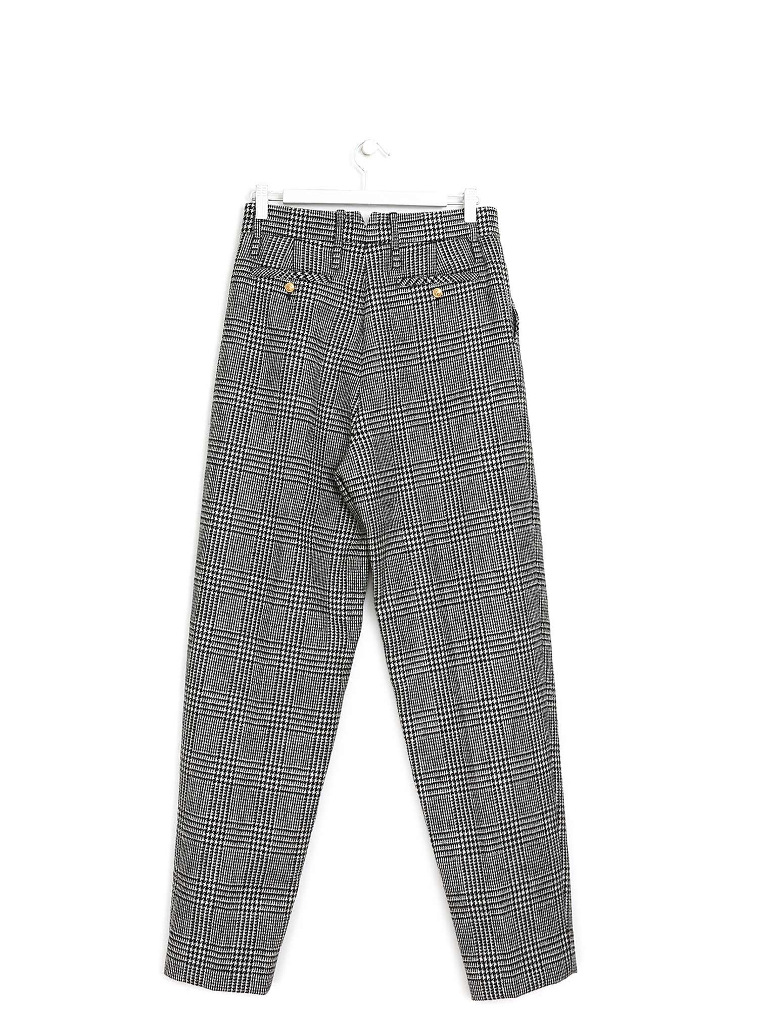 Wool plaid trousers in shades of white and black. Four pockets. Golden metal hardware. Button closure at the front.