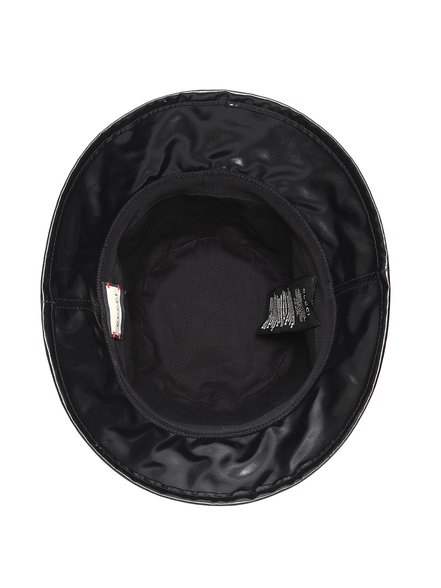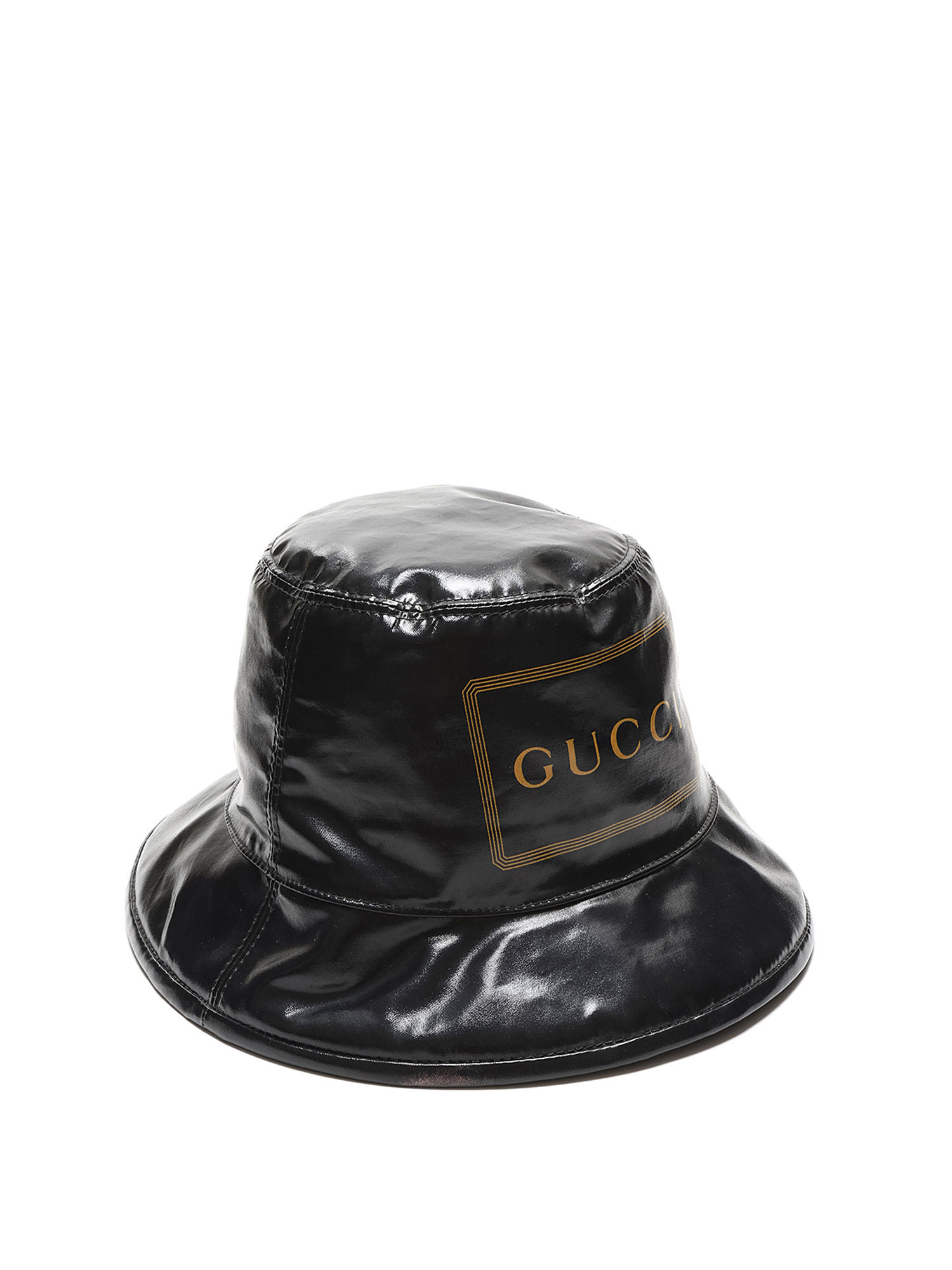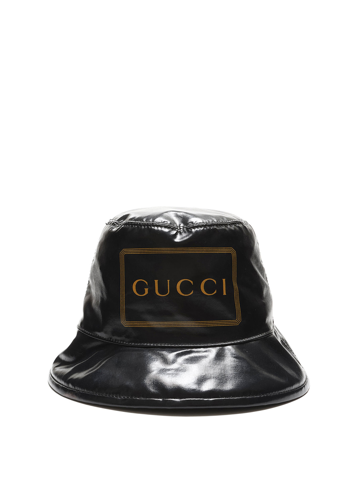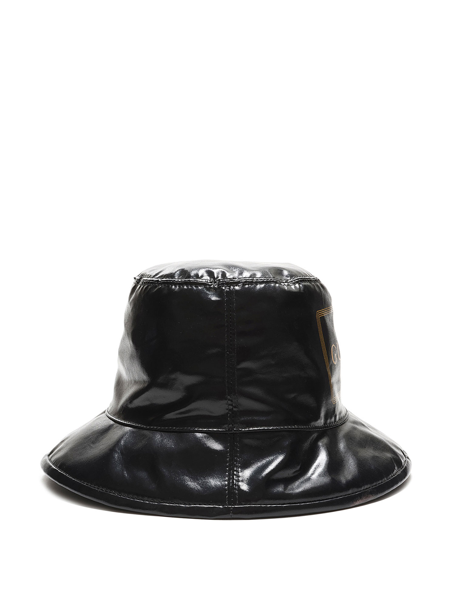 Laminated cotton bucket hat in black with gold logo at front. Subtle sheen finish.