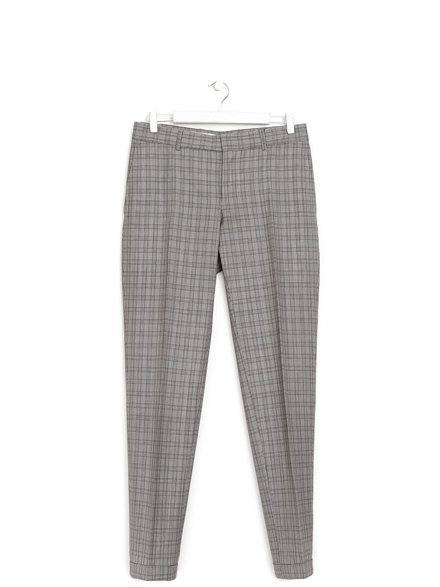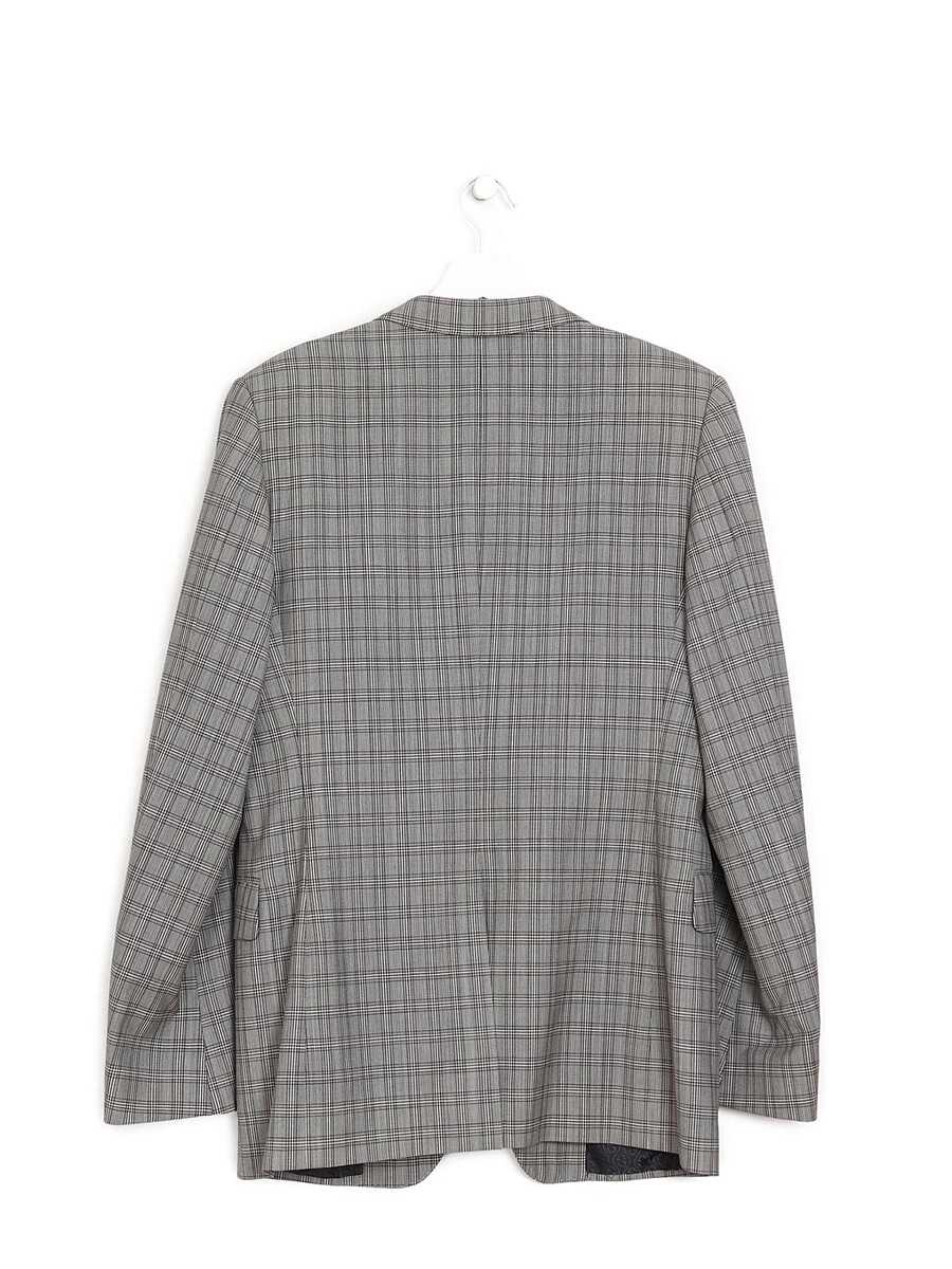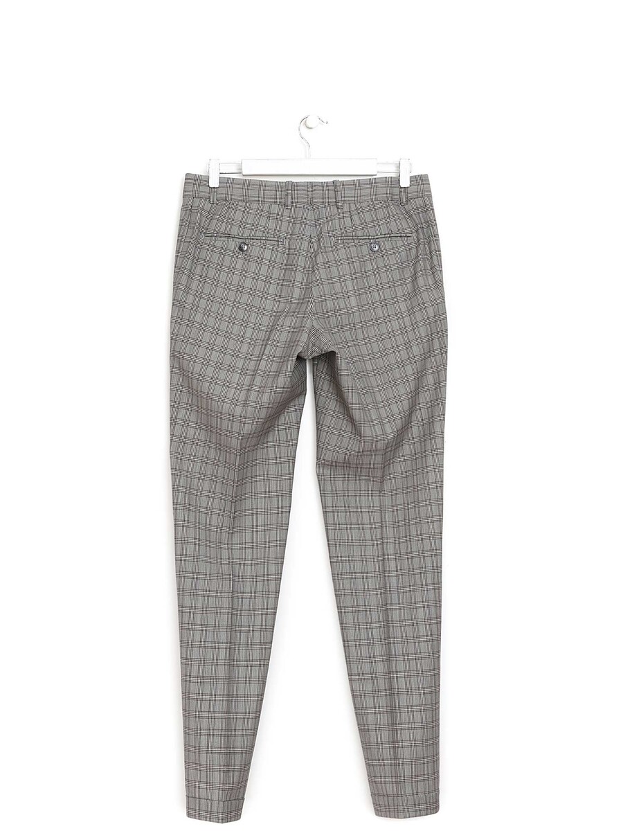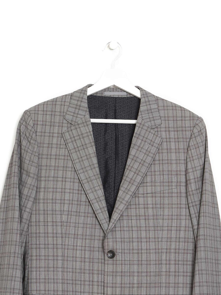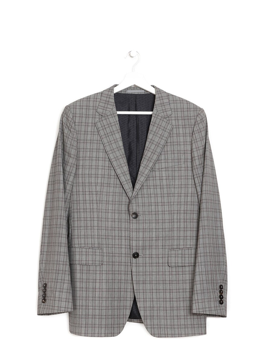 Plaid pattern suit in gray, featuring a slim-leg trouser and a long-sleeve blazer. Trousers have a button front closure and back welt pockets. The blazer includes a button front closure, lapel notch collar, and flap pockets.