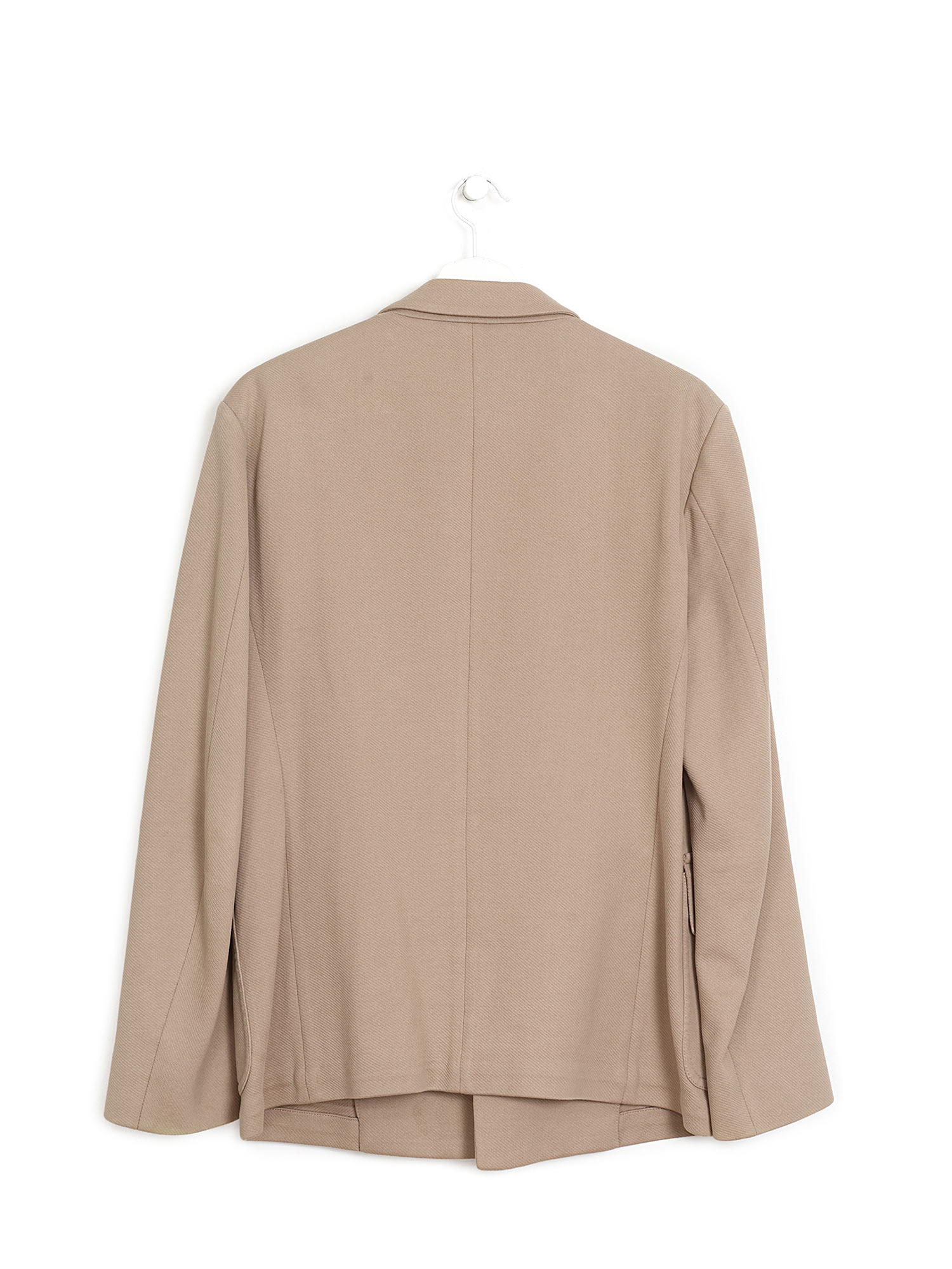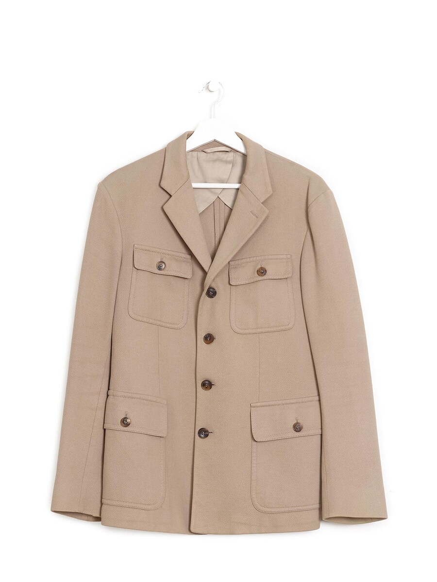 Double-breasted long sleeve jacket in beige. Notch lapel collar. Four patch pockets with flap and button closures.
