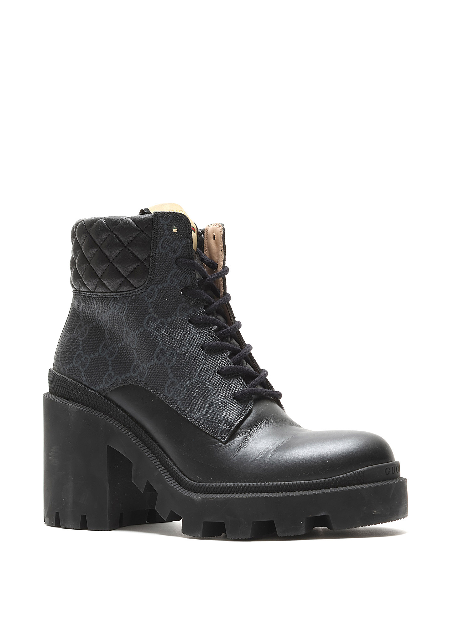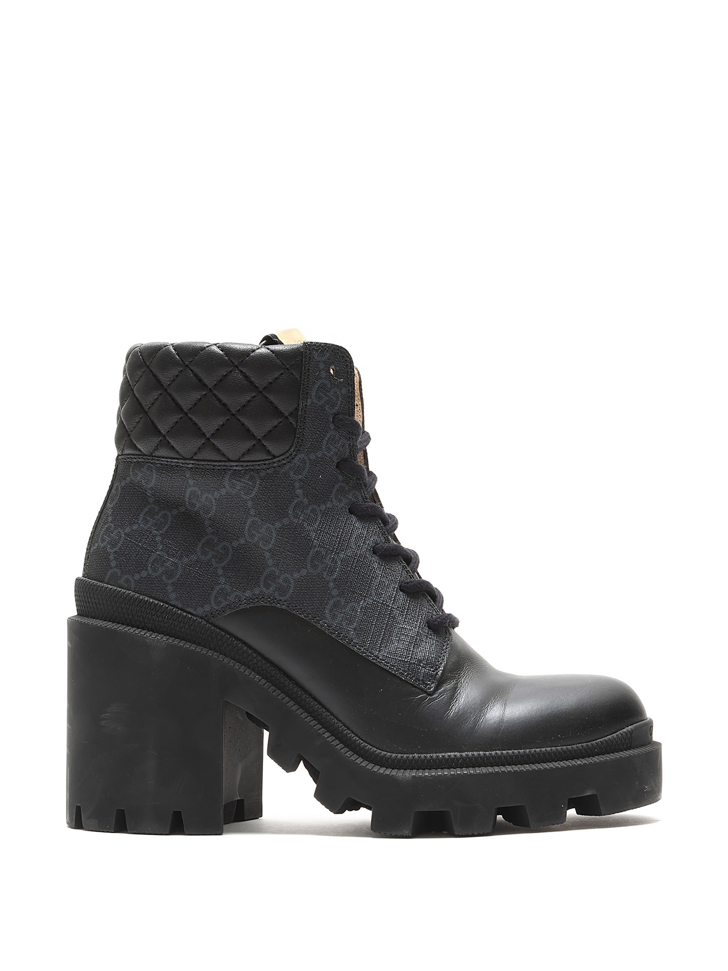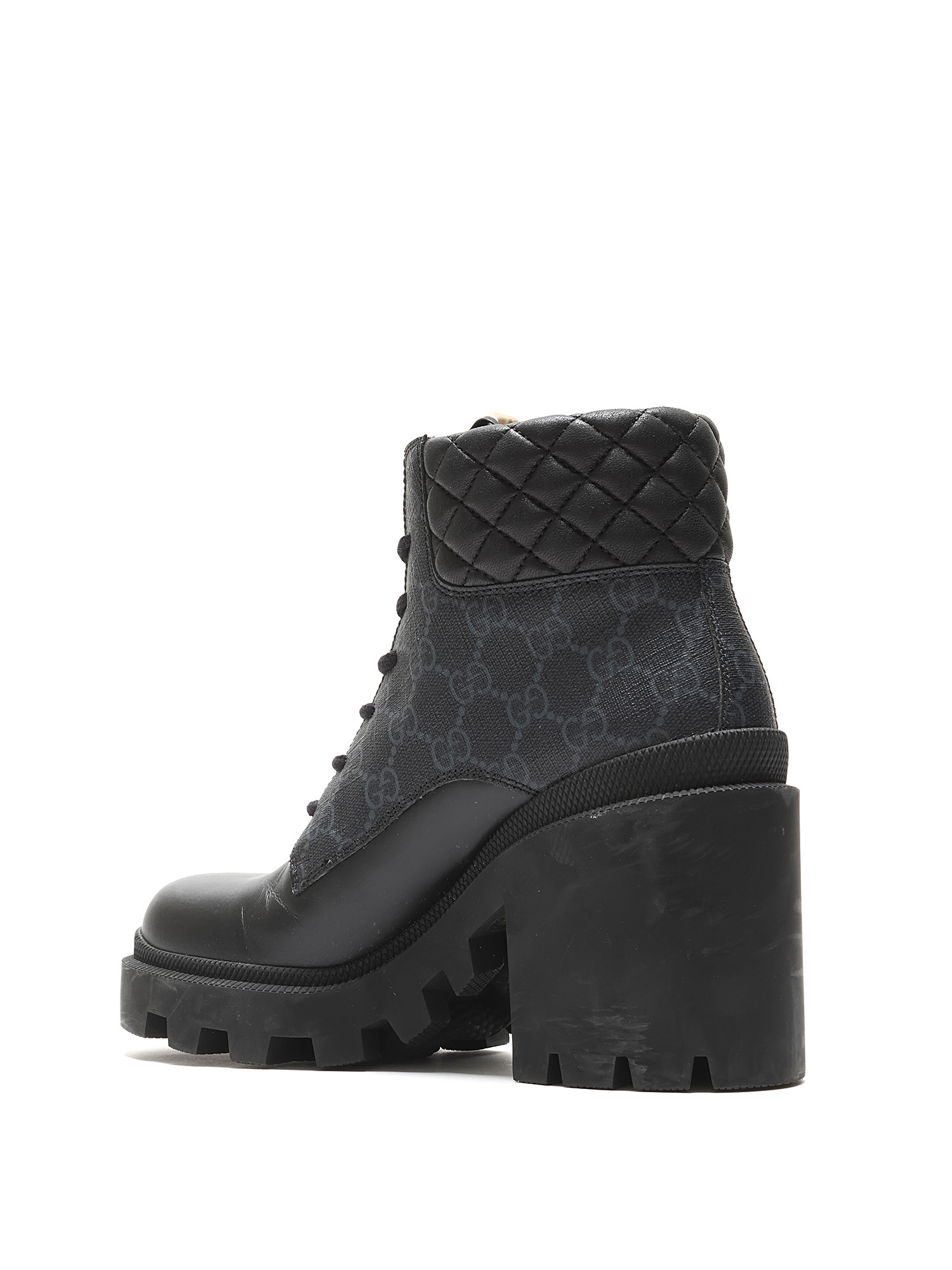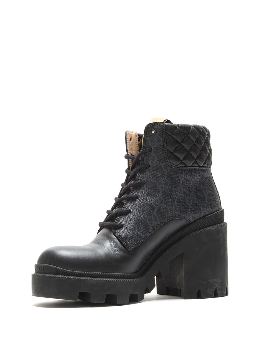 Ankle-height heeled leather boots in black featuring GG Supreme monogram motif throughout. Lace-up closure. Round toe style. Rubber lug sole.