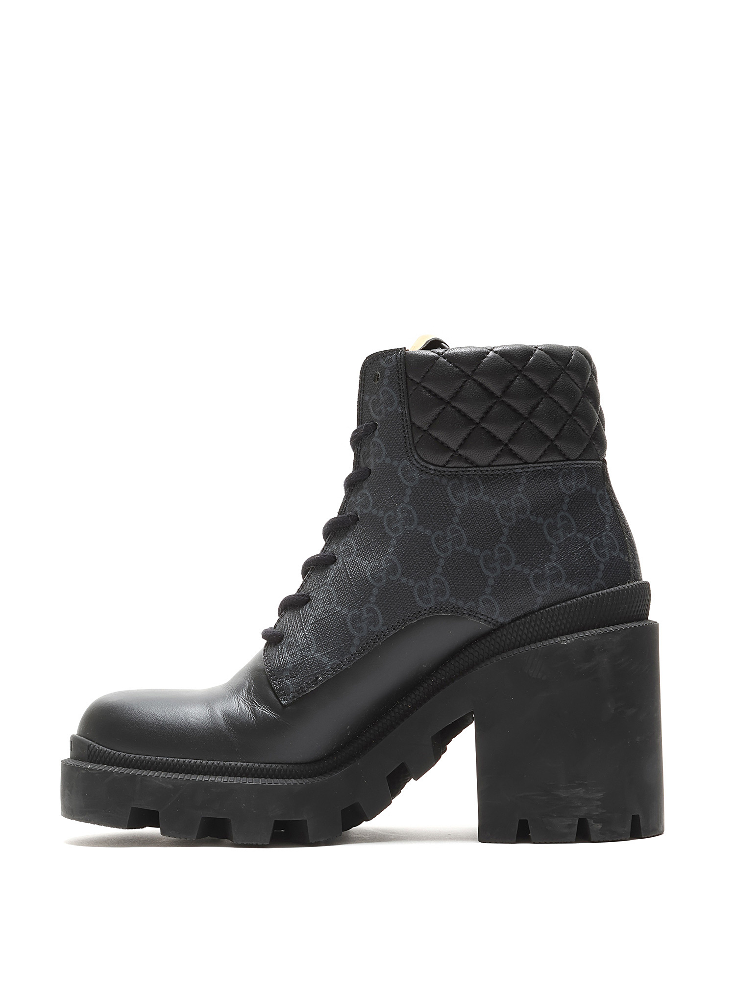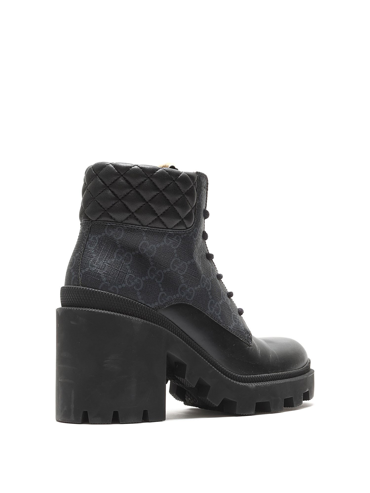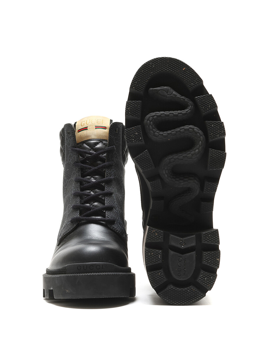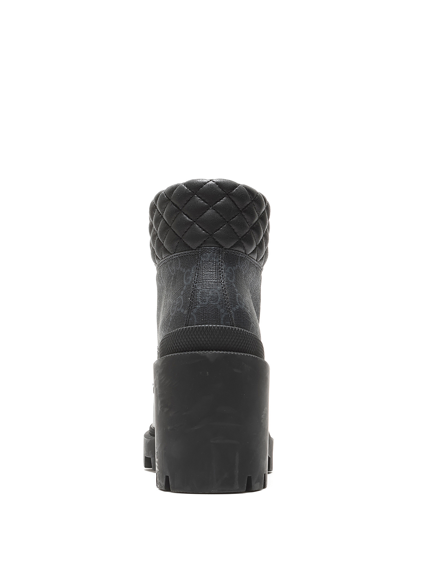 Ankle-height heeled leather boots in black featuring GG Supreme monogram motif throughout. Lace-up closure. Round toe style. Rubber lug sole.