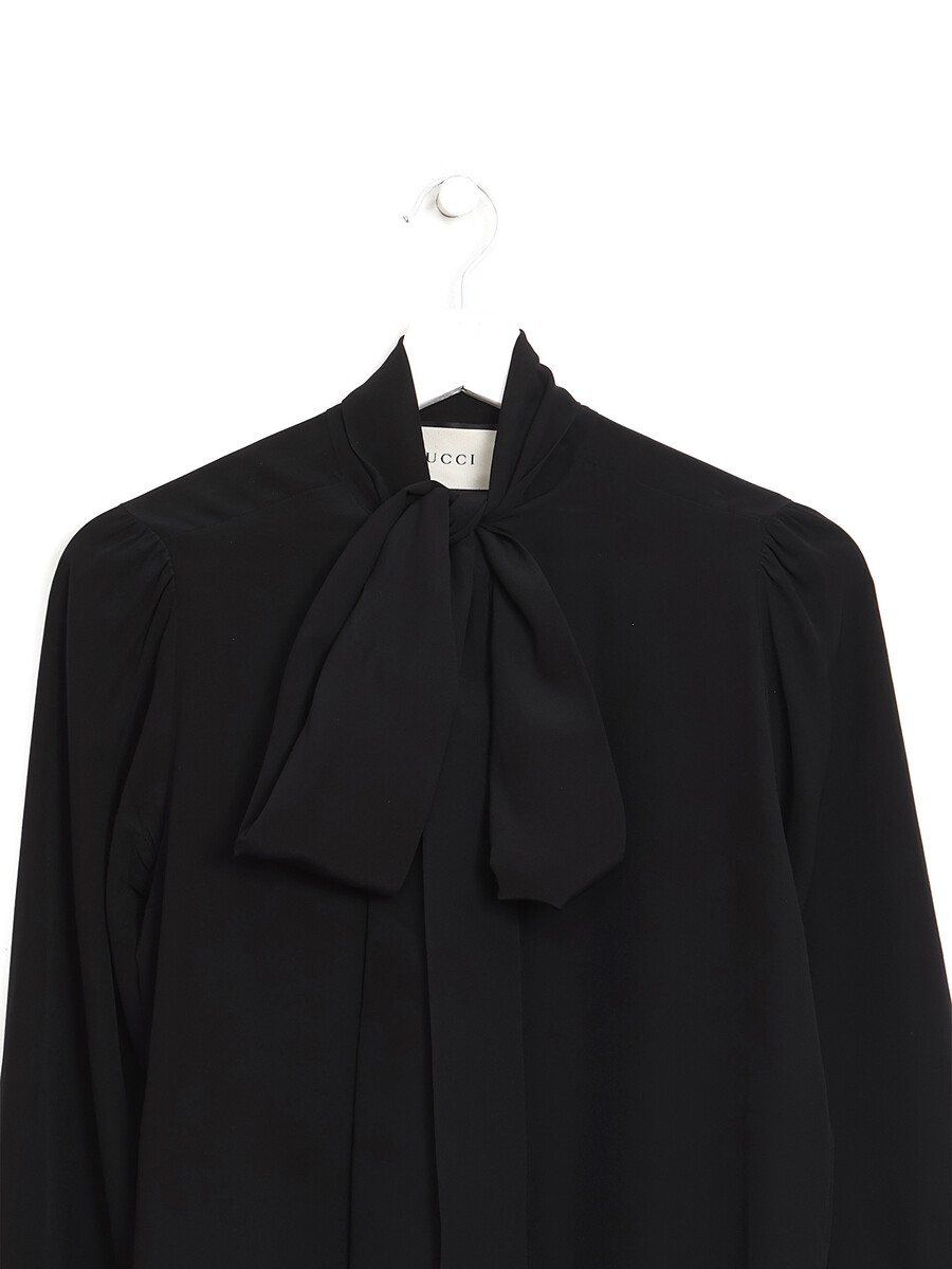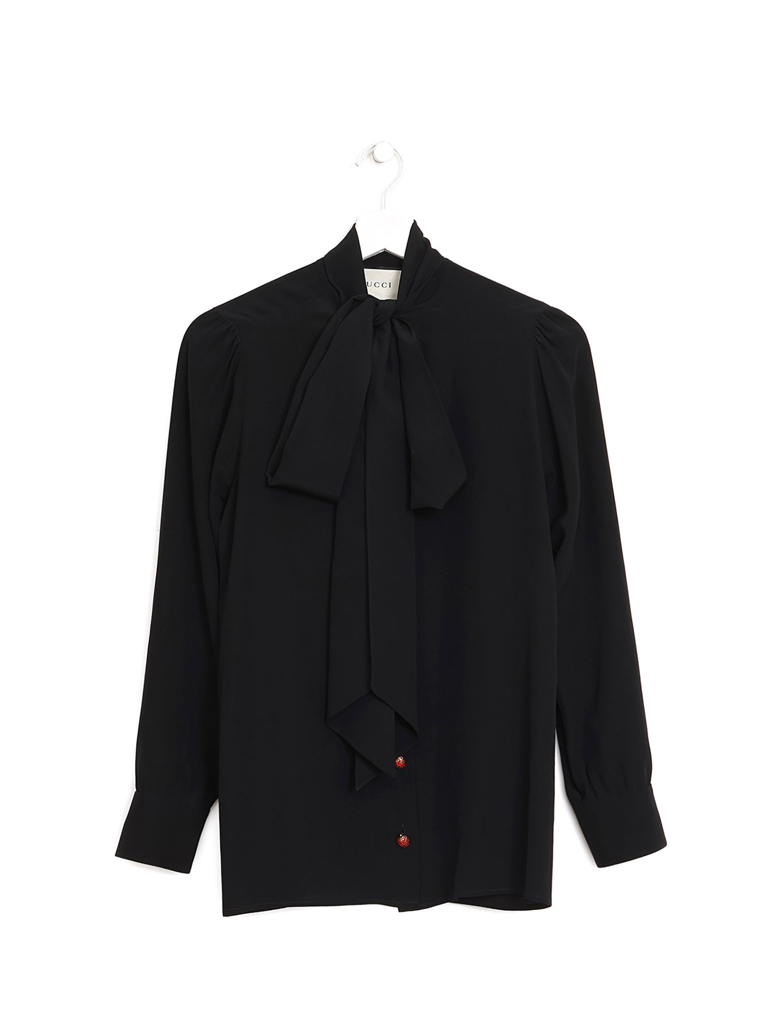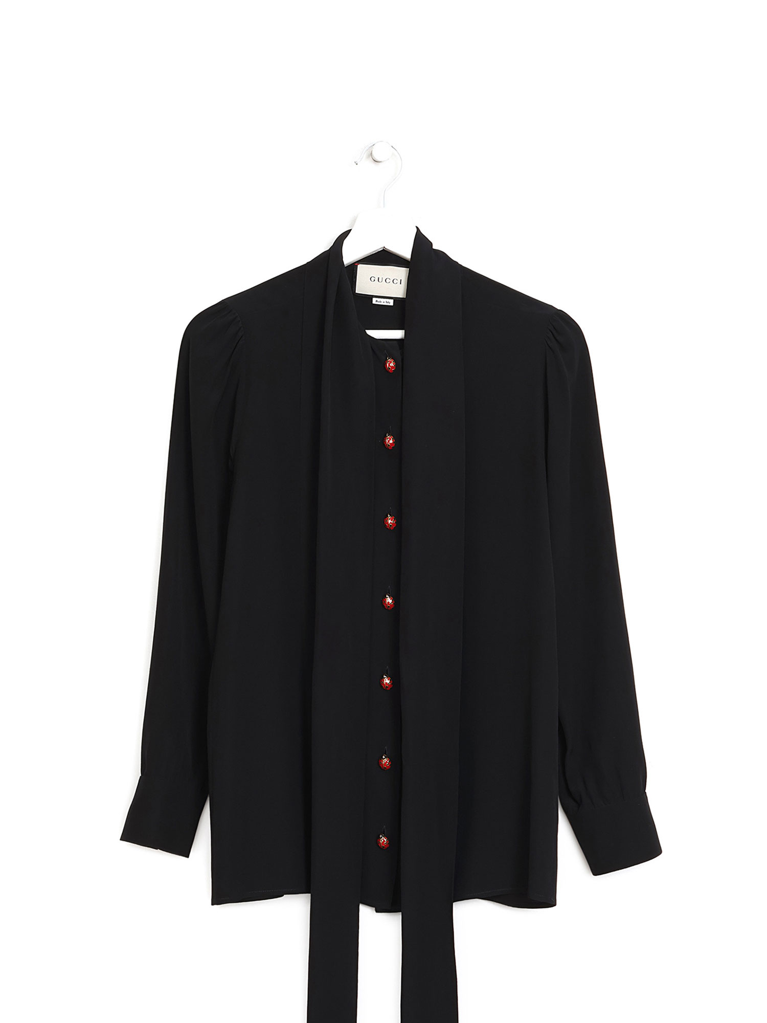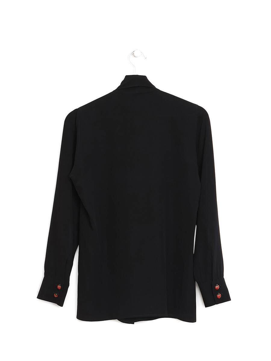 Long sleeve blouse featuring decorative ladybug buttons. Self-tie bowtie at the collar.