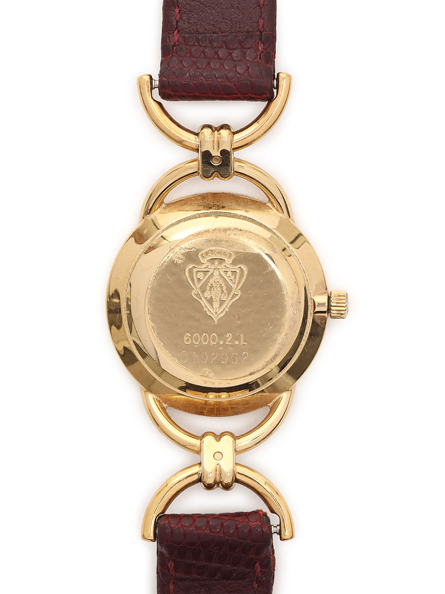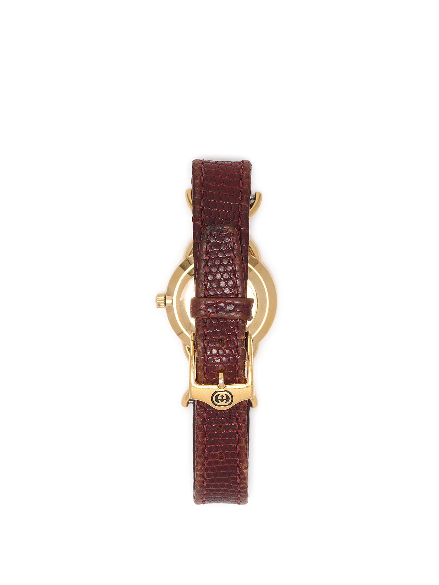 Round watch with mother-of-pearl dial and gold-tone case. Burgundy leather strap with gold-tone hardware.