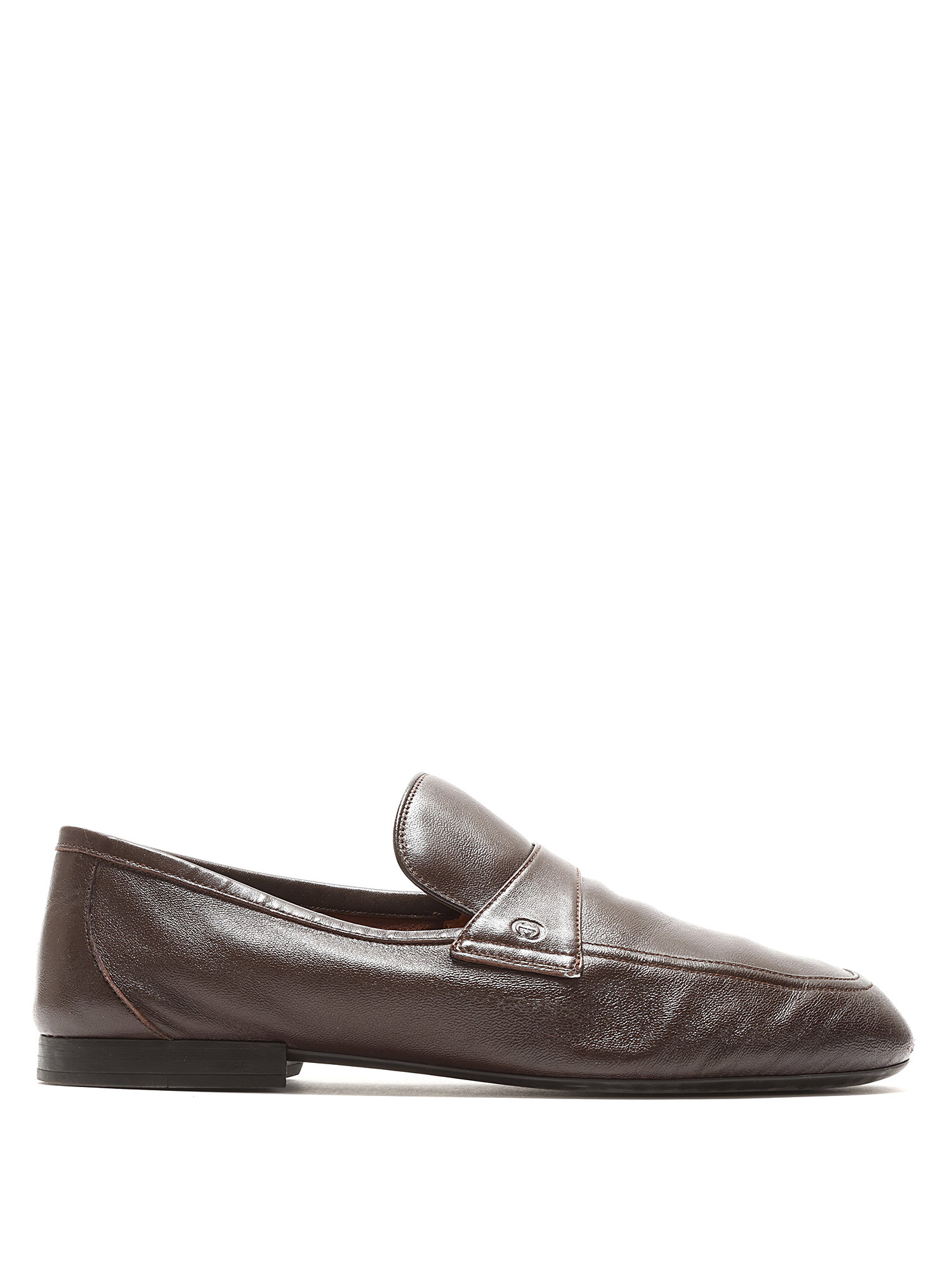 Classic brown leather loafers with slip-on closure. Round toe and flat rubber sole.