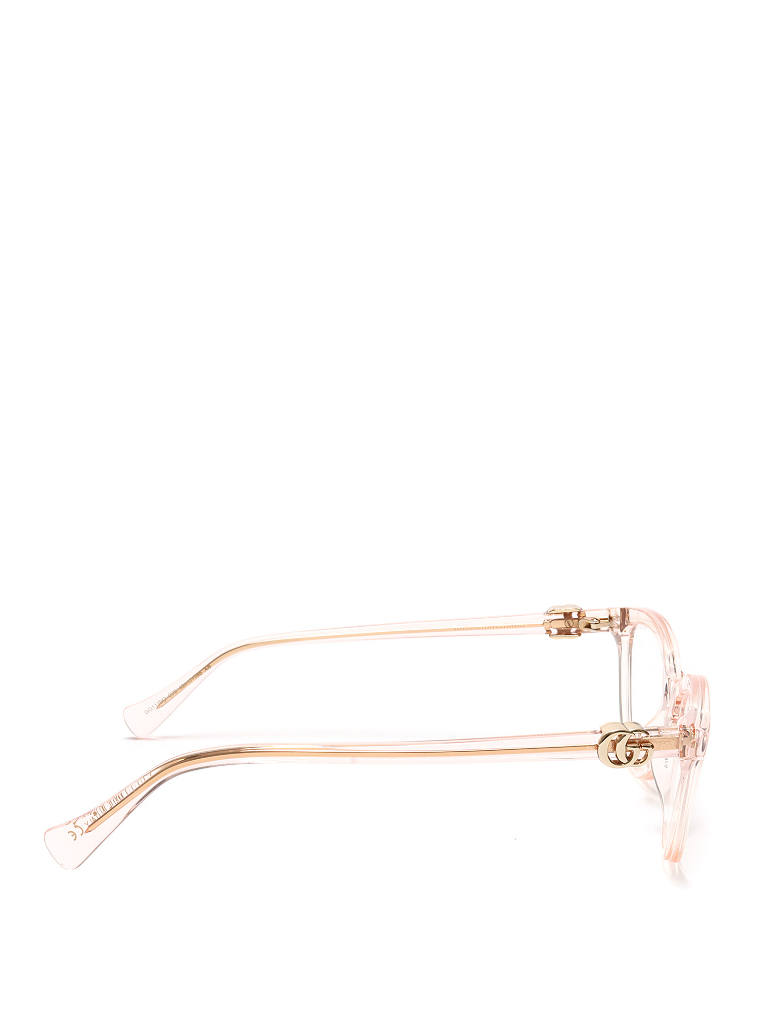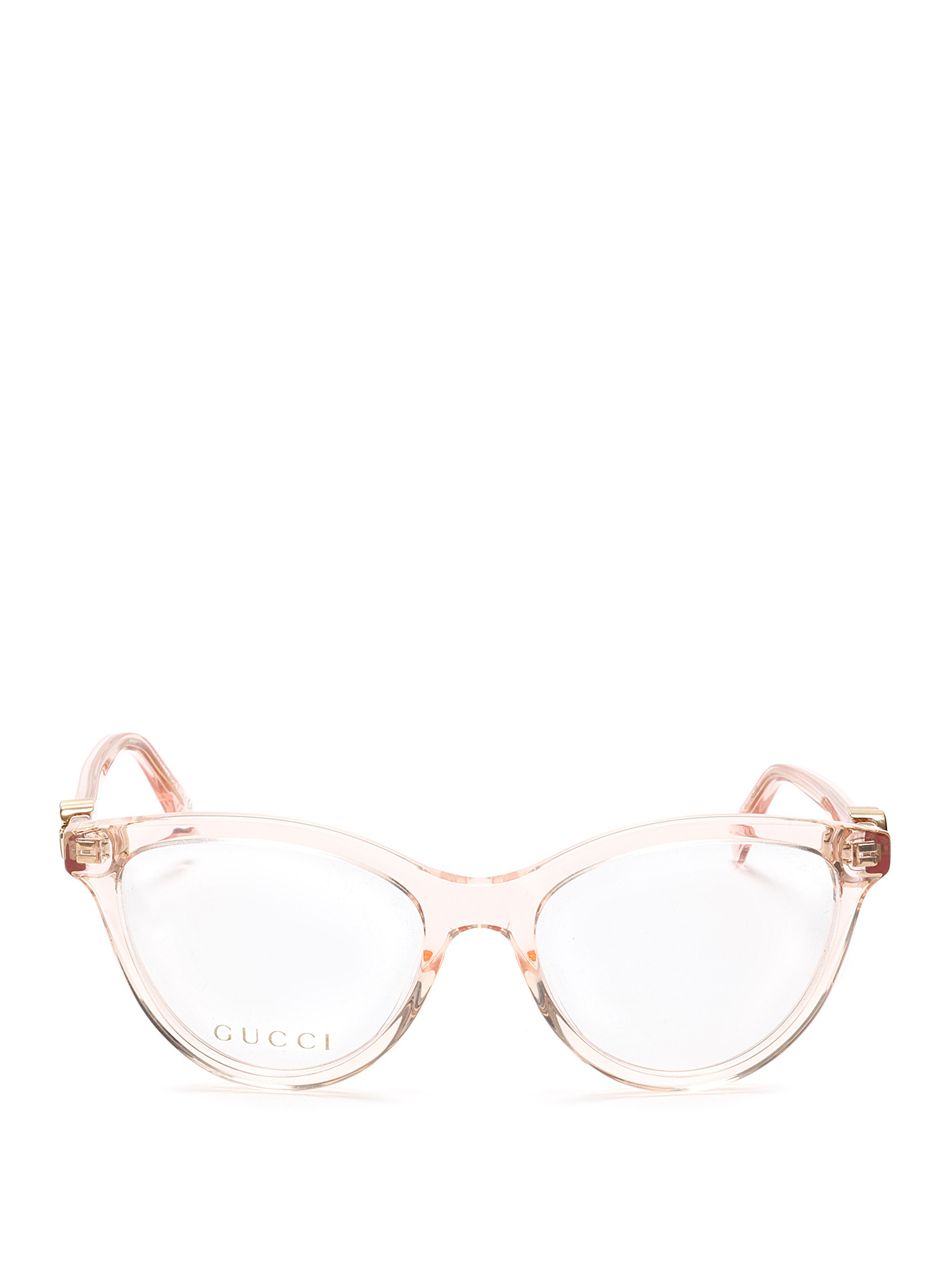 Transparent pink acetate sunglasses. Gold-tone hinges with logo detailing on temples.