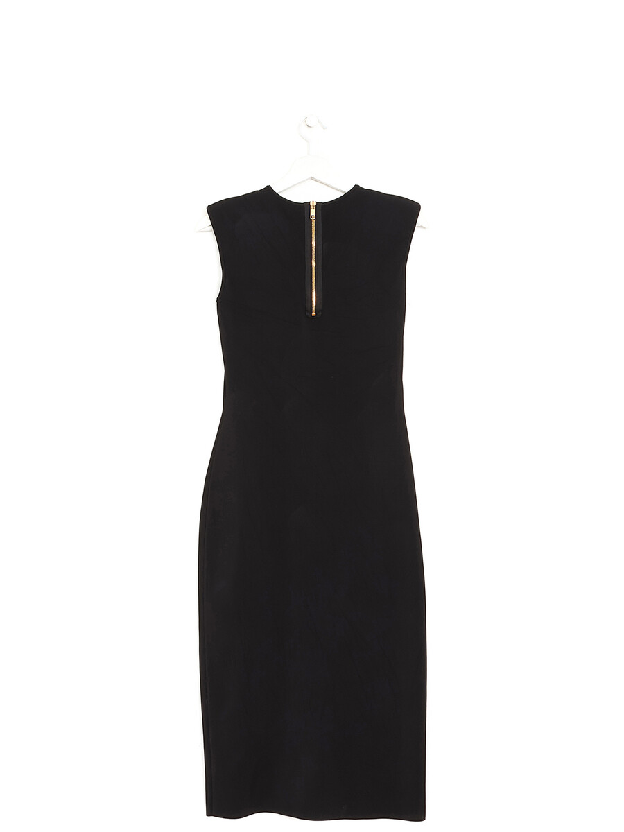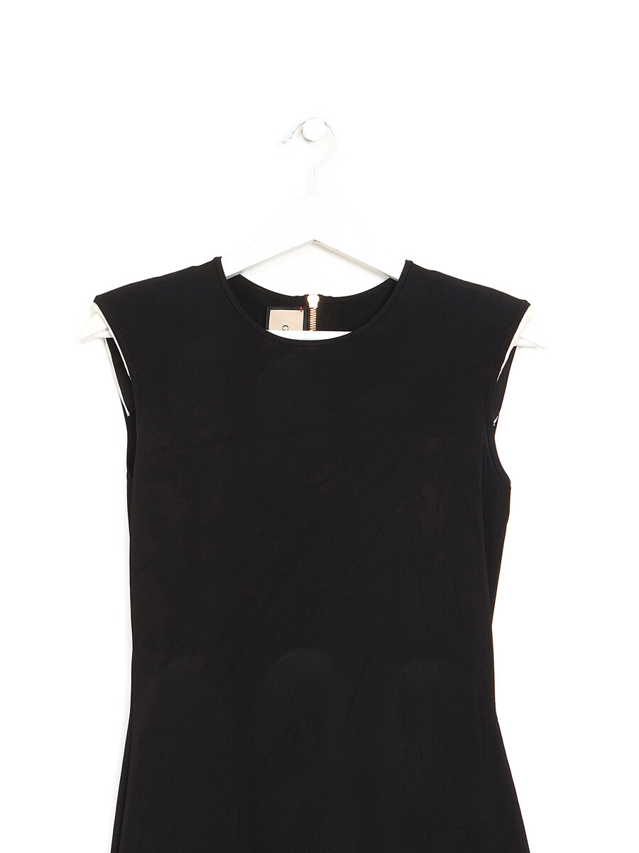 Sleeveless black dress with zip closure. Form-fitting silhouette with a sleek finish.