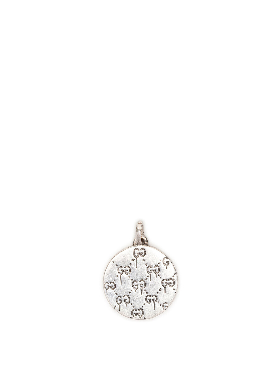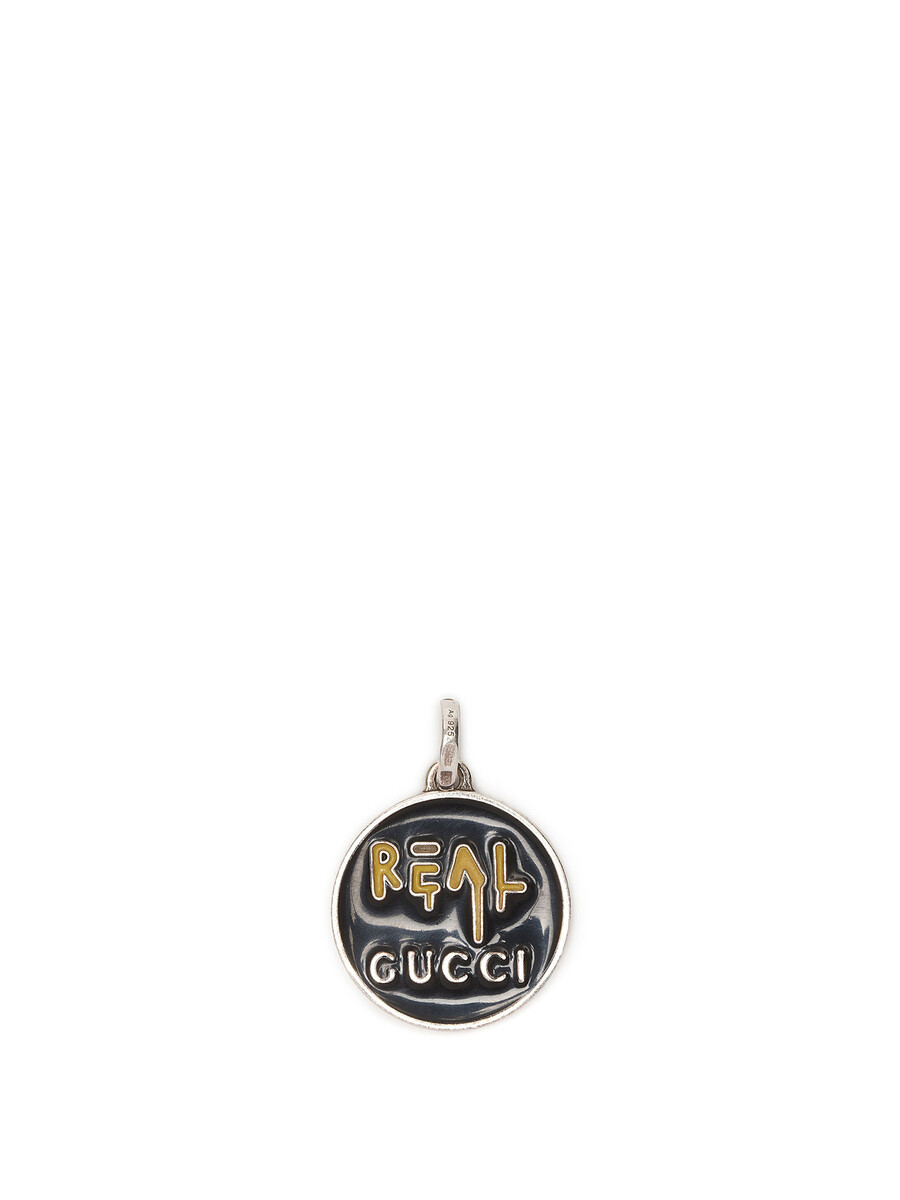 Round enamel and sterling silver pendant with 'REAL GUCCI' engraving. Monogram pattern on reverse side.