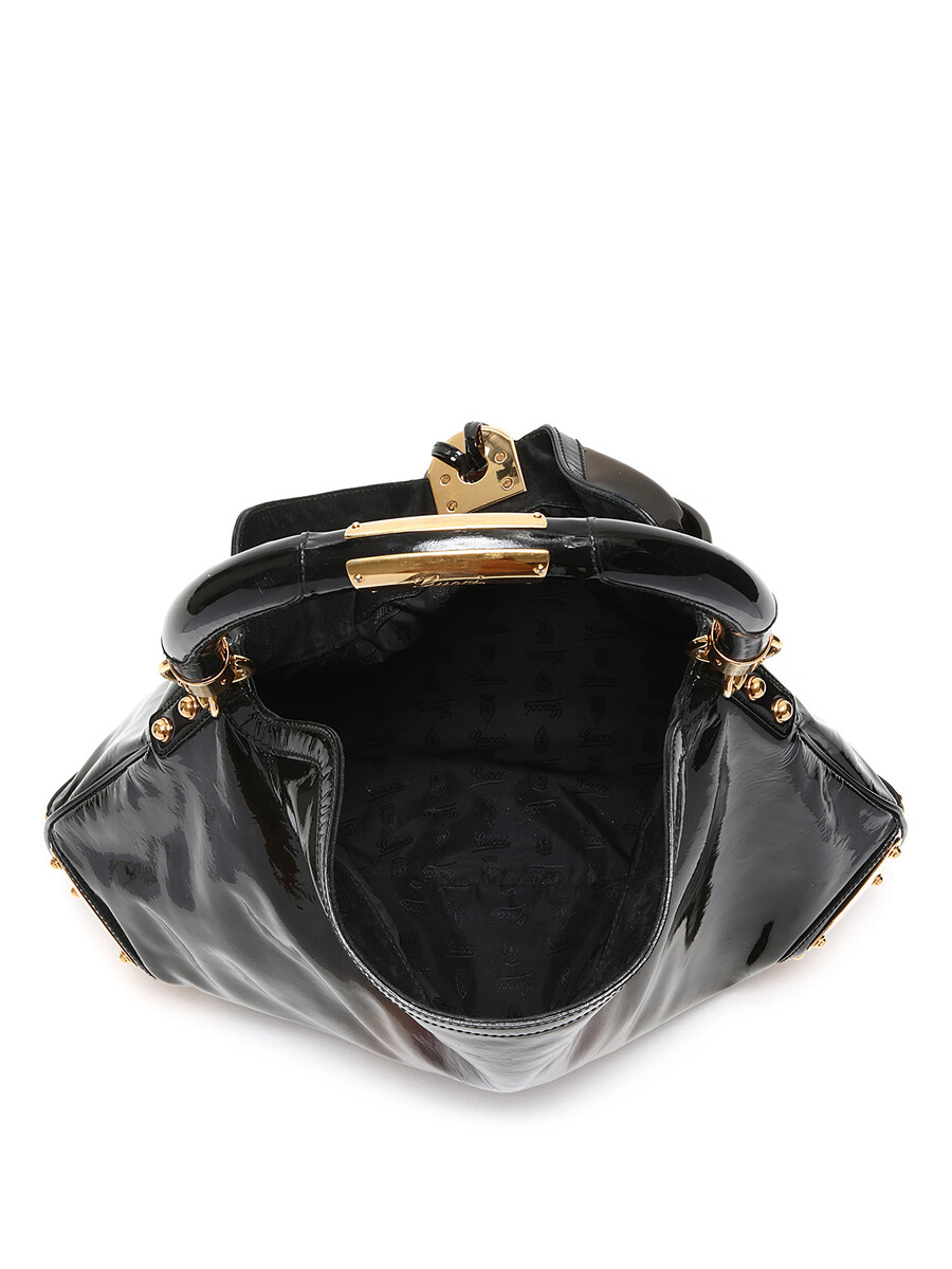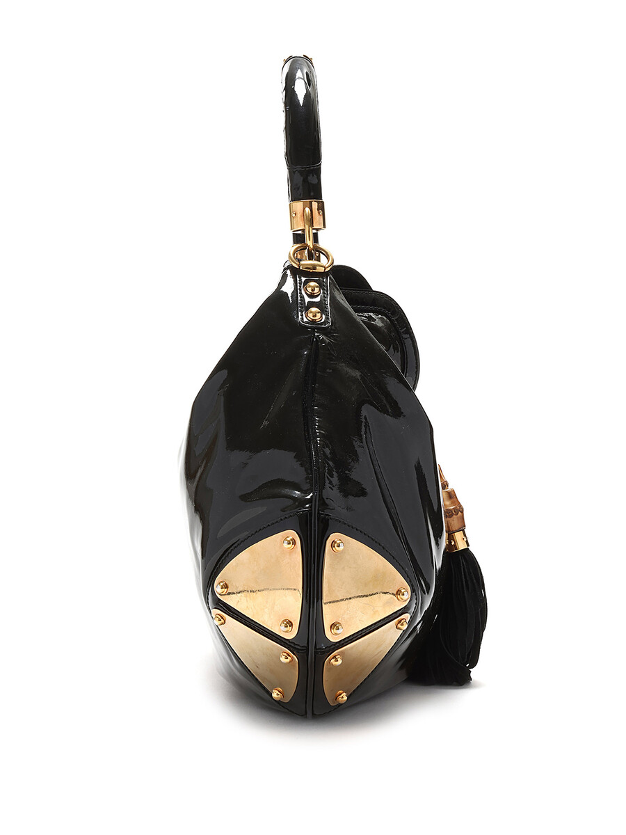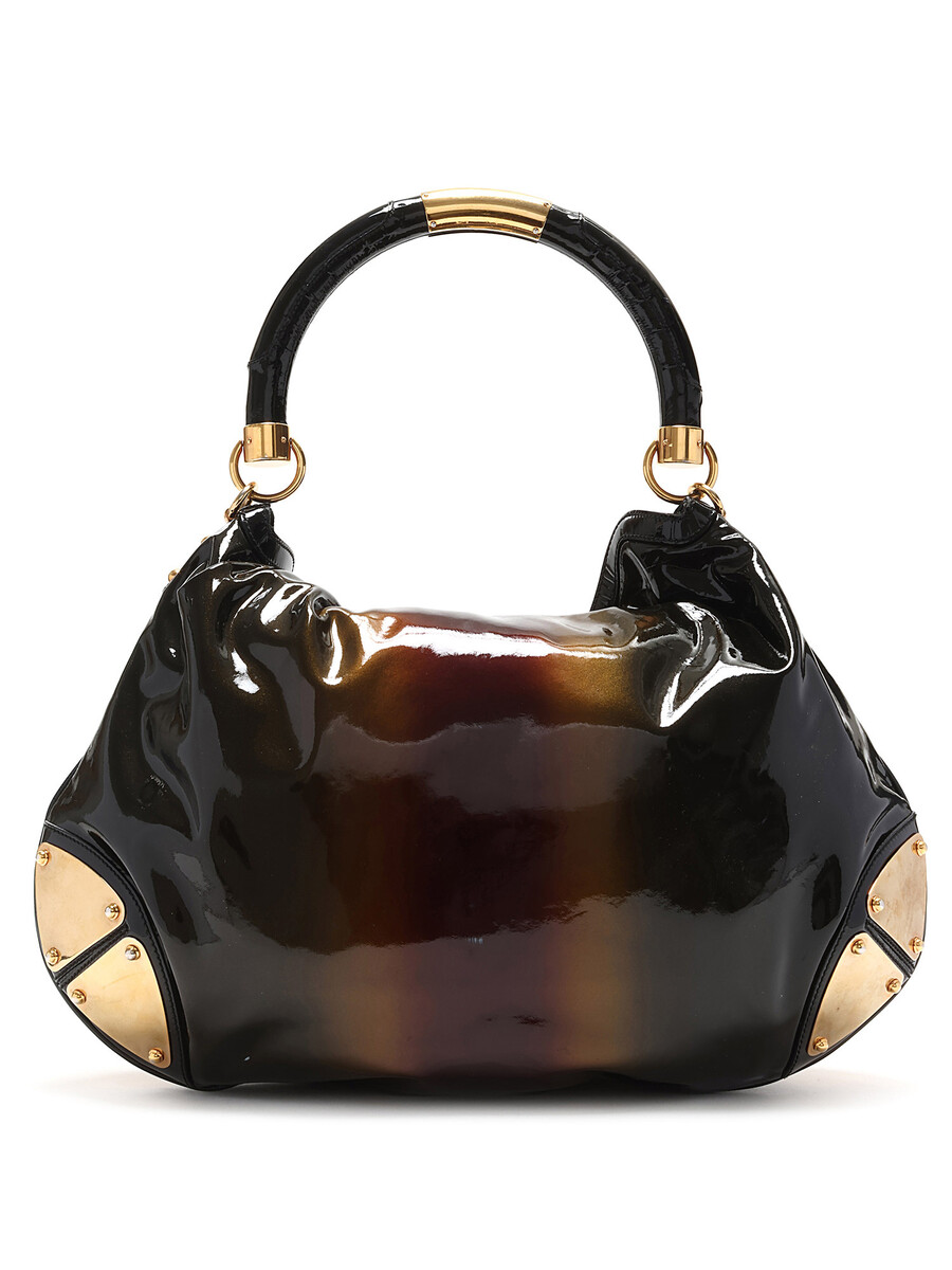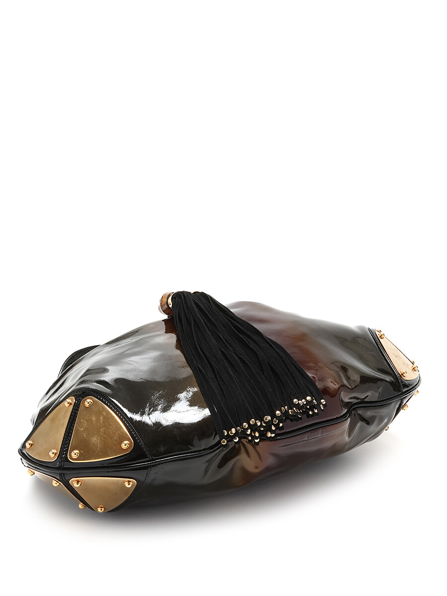 Patent leather hobo bag featuring a glossy finish and iridescent sheen in black and brown. Top closure adorned with bamboo tassel accent. Sturdy leather handle with gold hardware detailing. Intricately engraved logo on gold-tone hardware. Elegant leather trims.