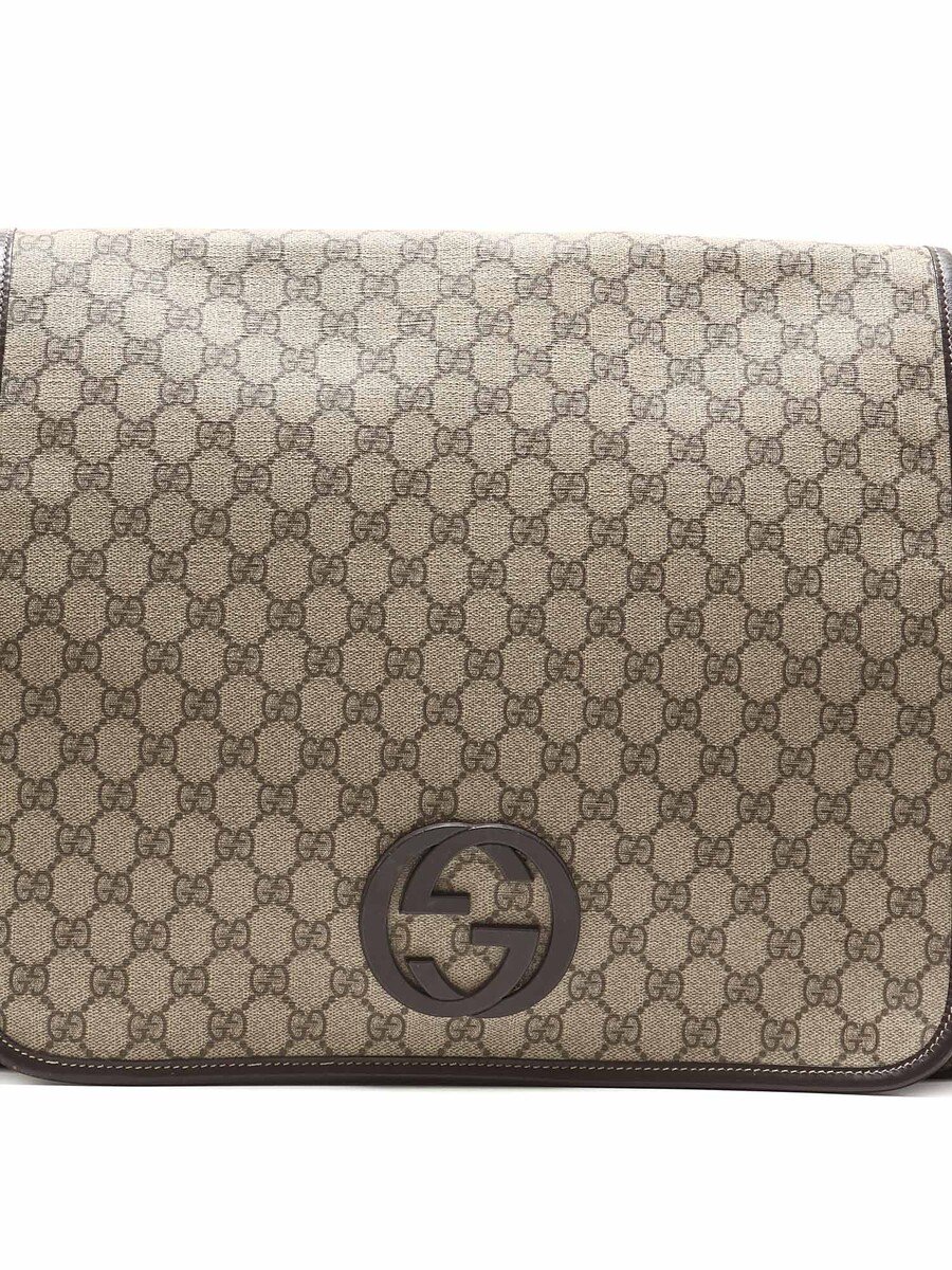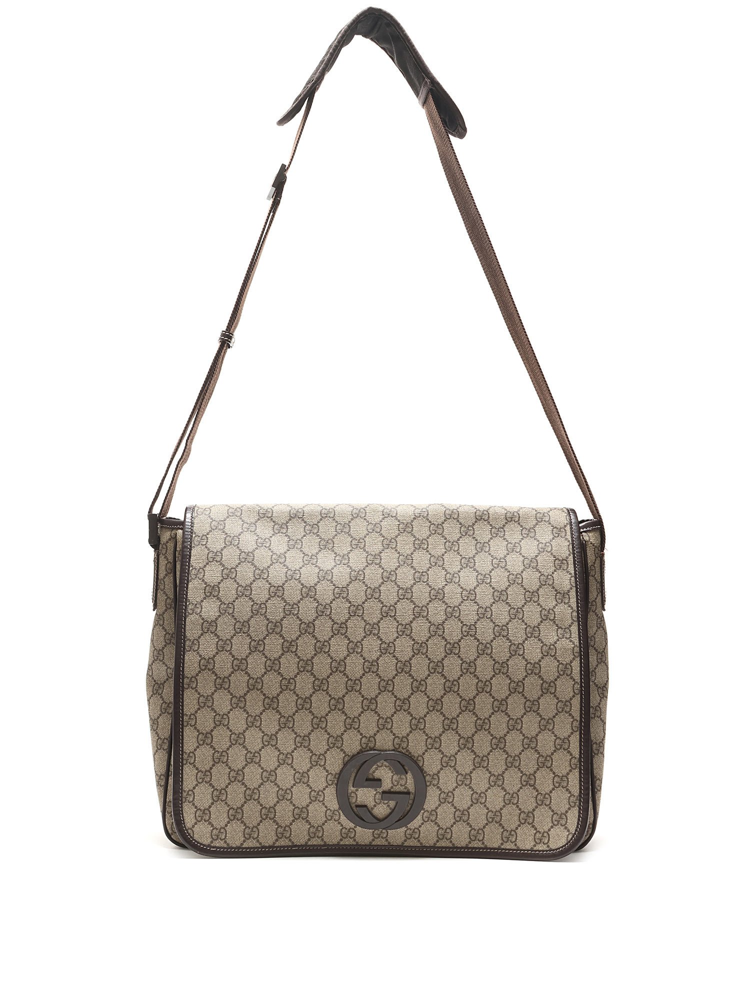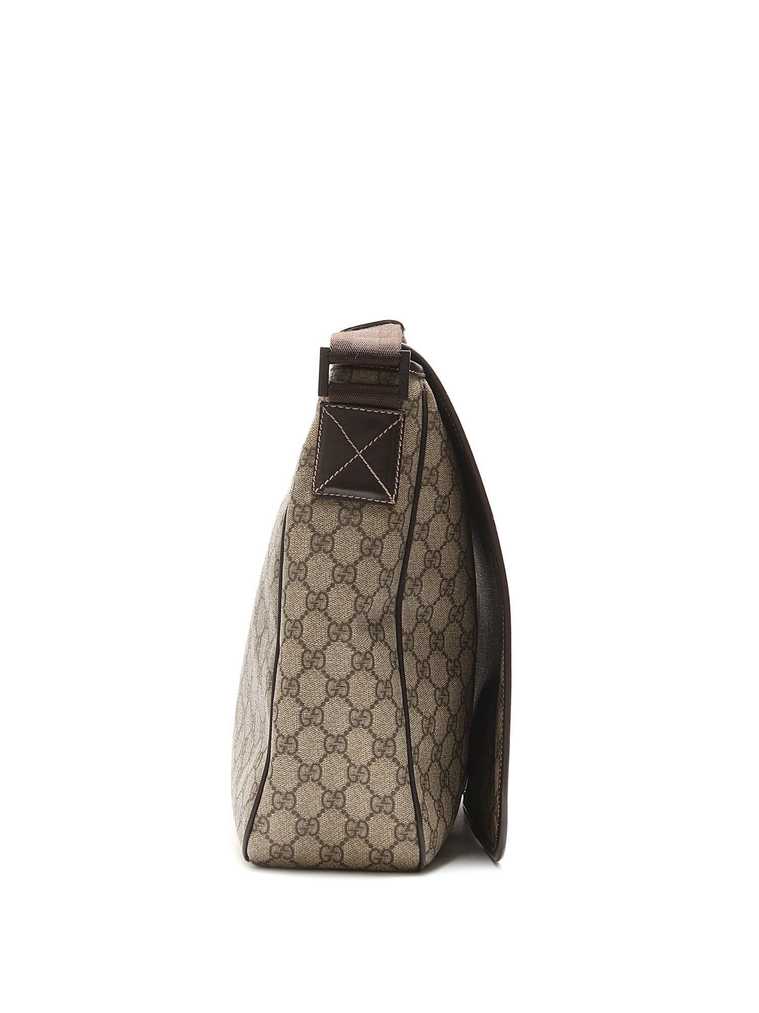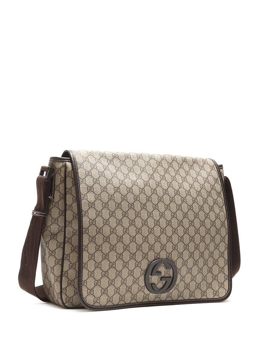 GG Monogram canvas messenger bag in beige with brown details. Velcro closure. Adjustable canvas shoulder strap. Leather trims. Metal hardware.