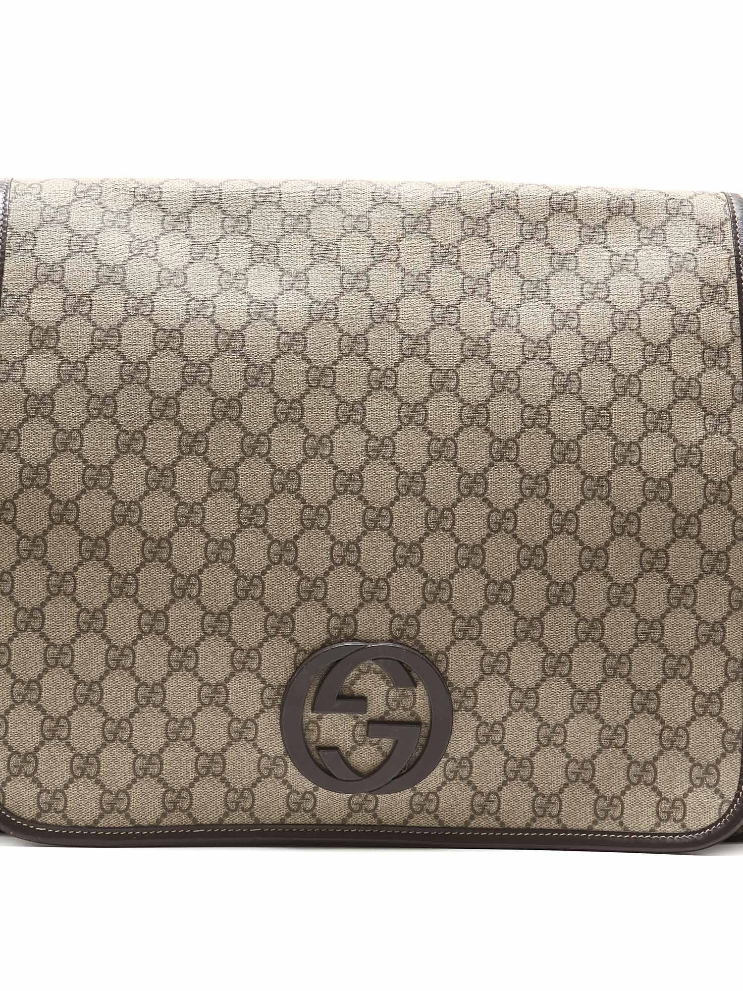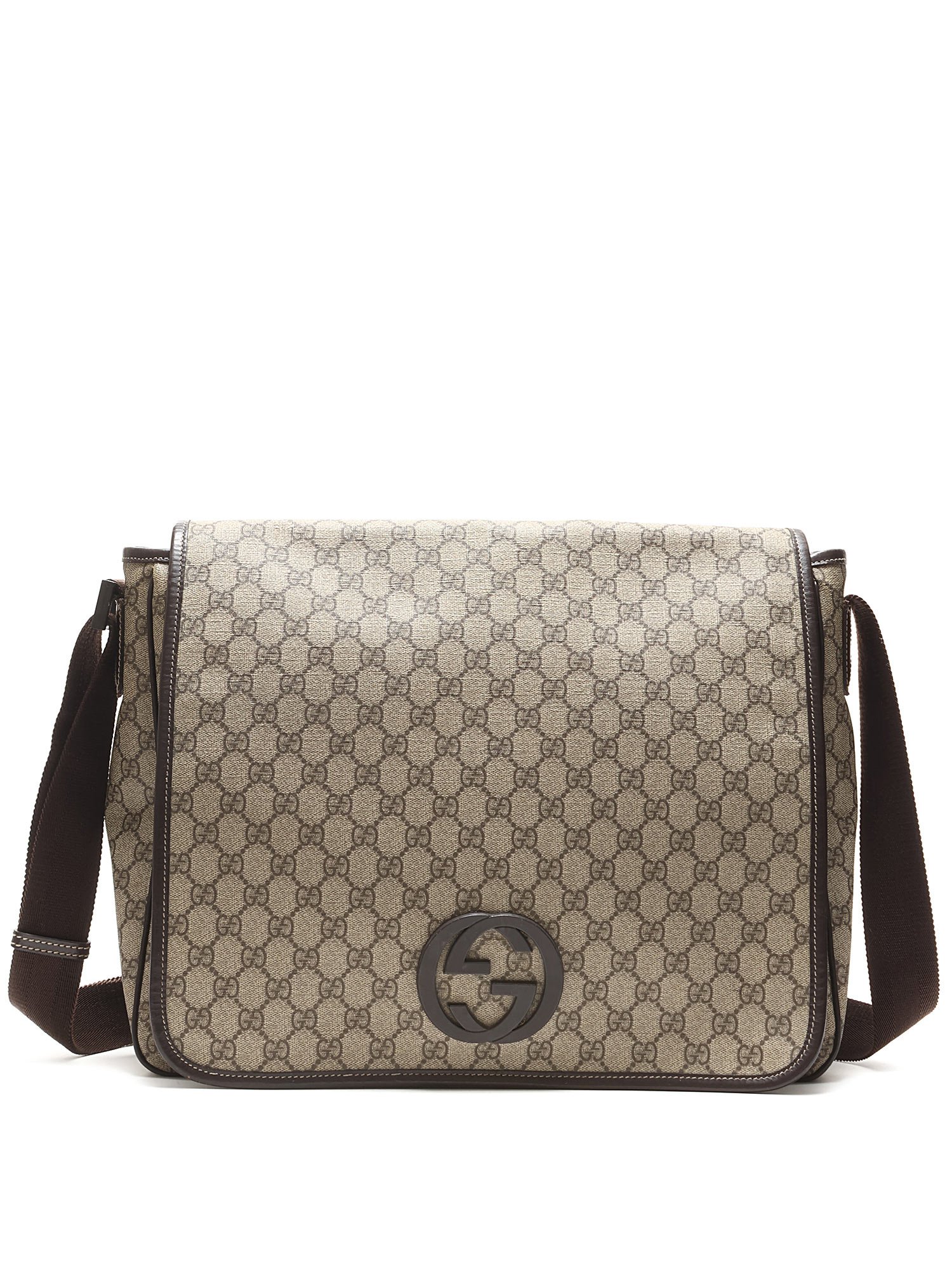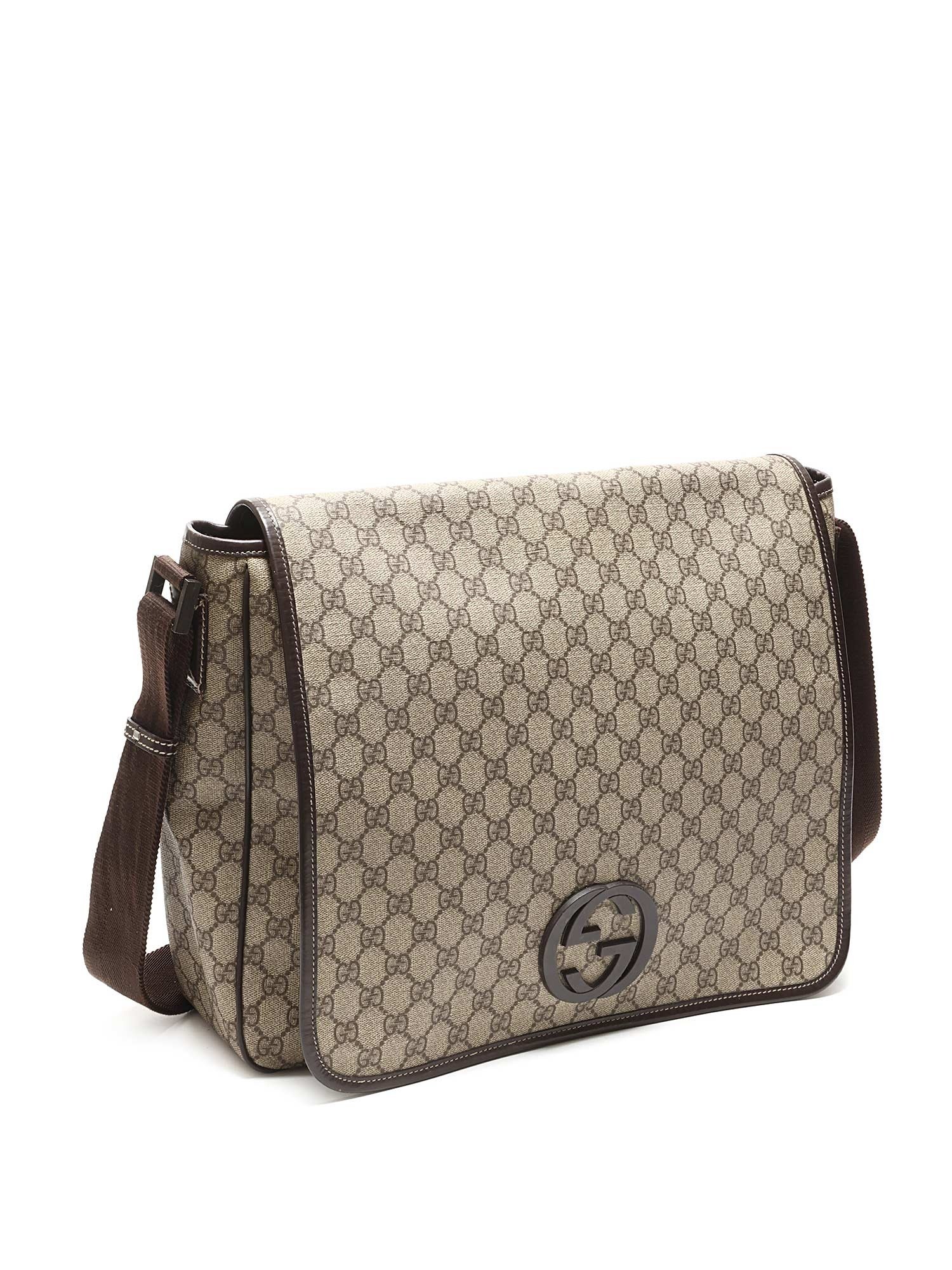GG Monogram canvas messenger bag in beige with brown details. Velcro closure. Adjustable canvas shoulder strap. Leather trims. Metal hardware.