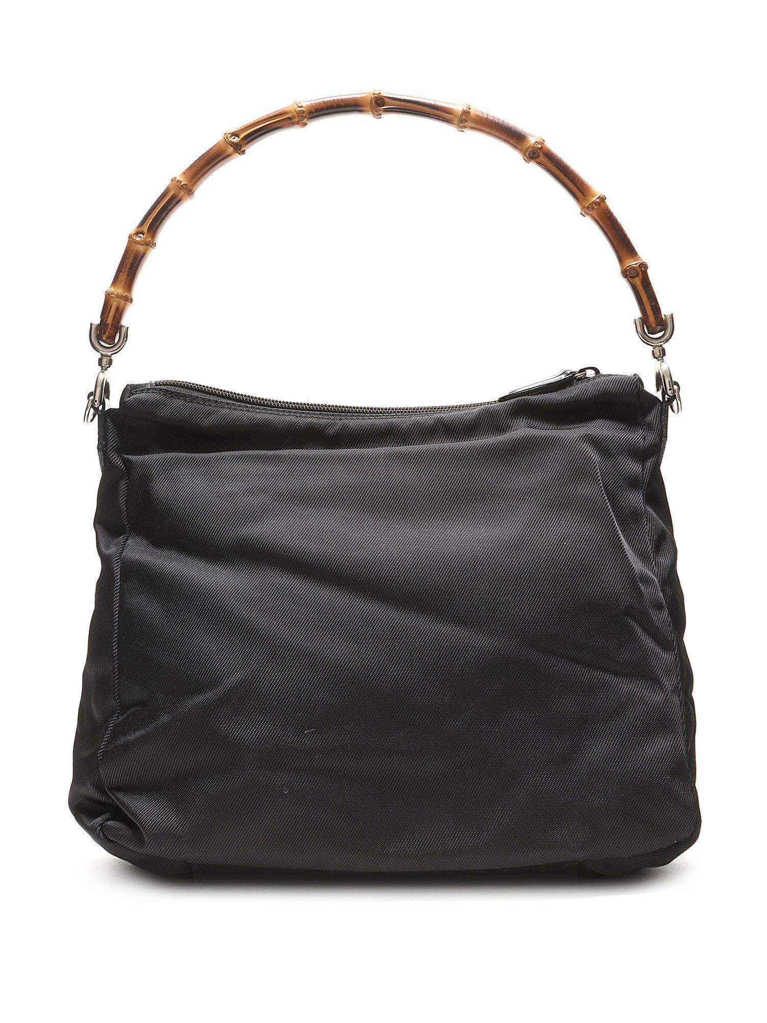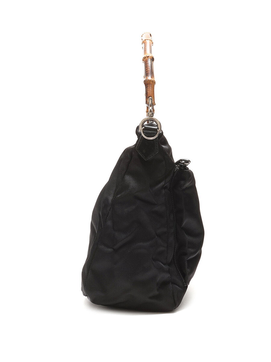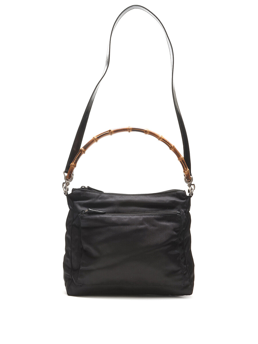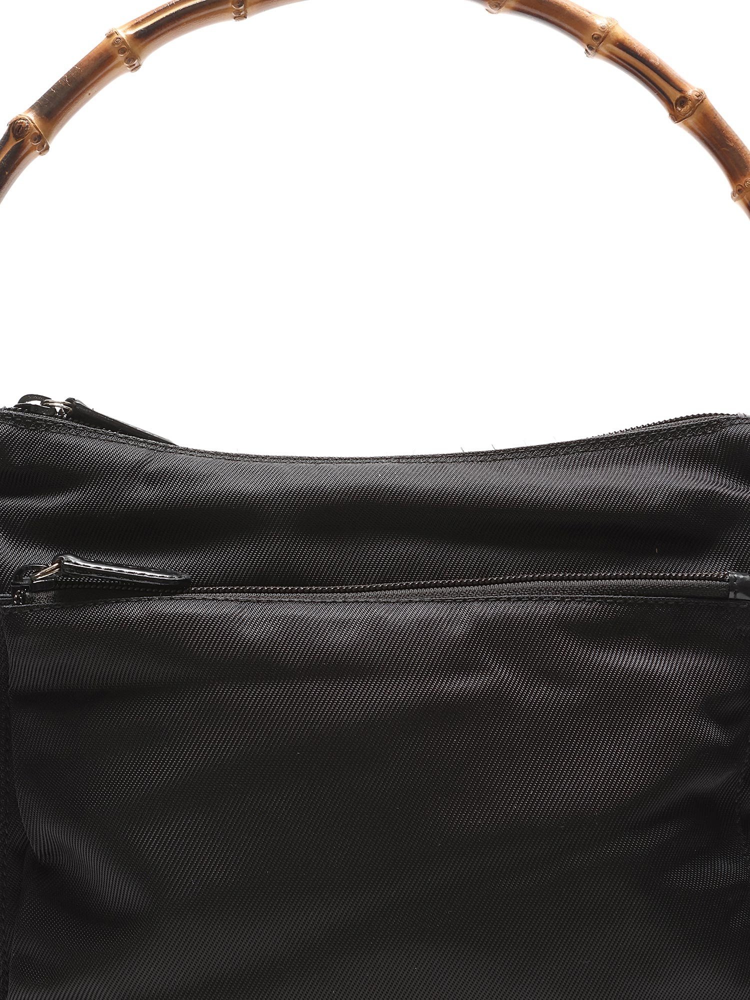 Canvas shoulder bag in black with bamboo handle and silver-tone hardware. Zipper closure. Detachable leather shoulder strap. Leather trims.